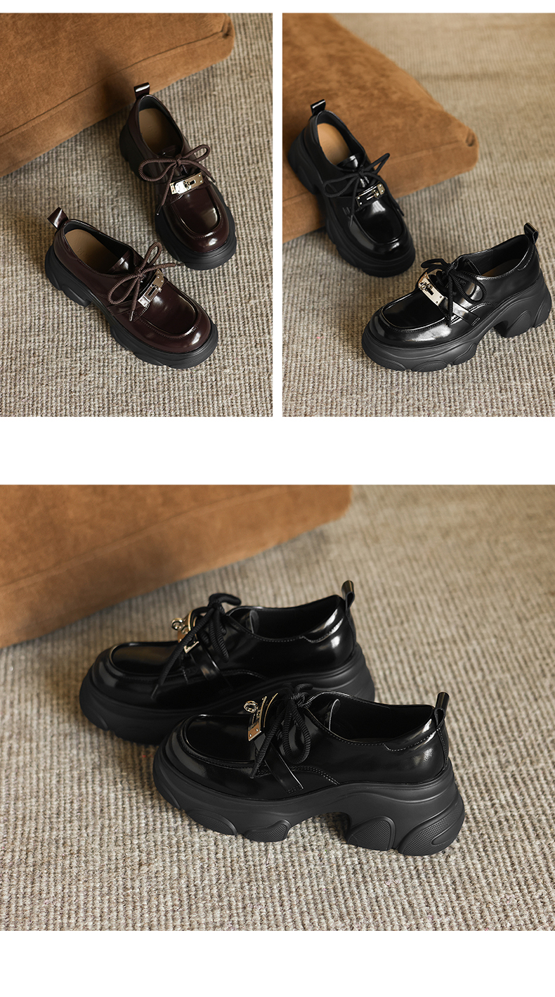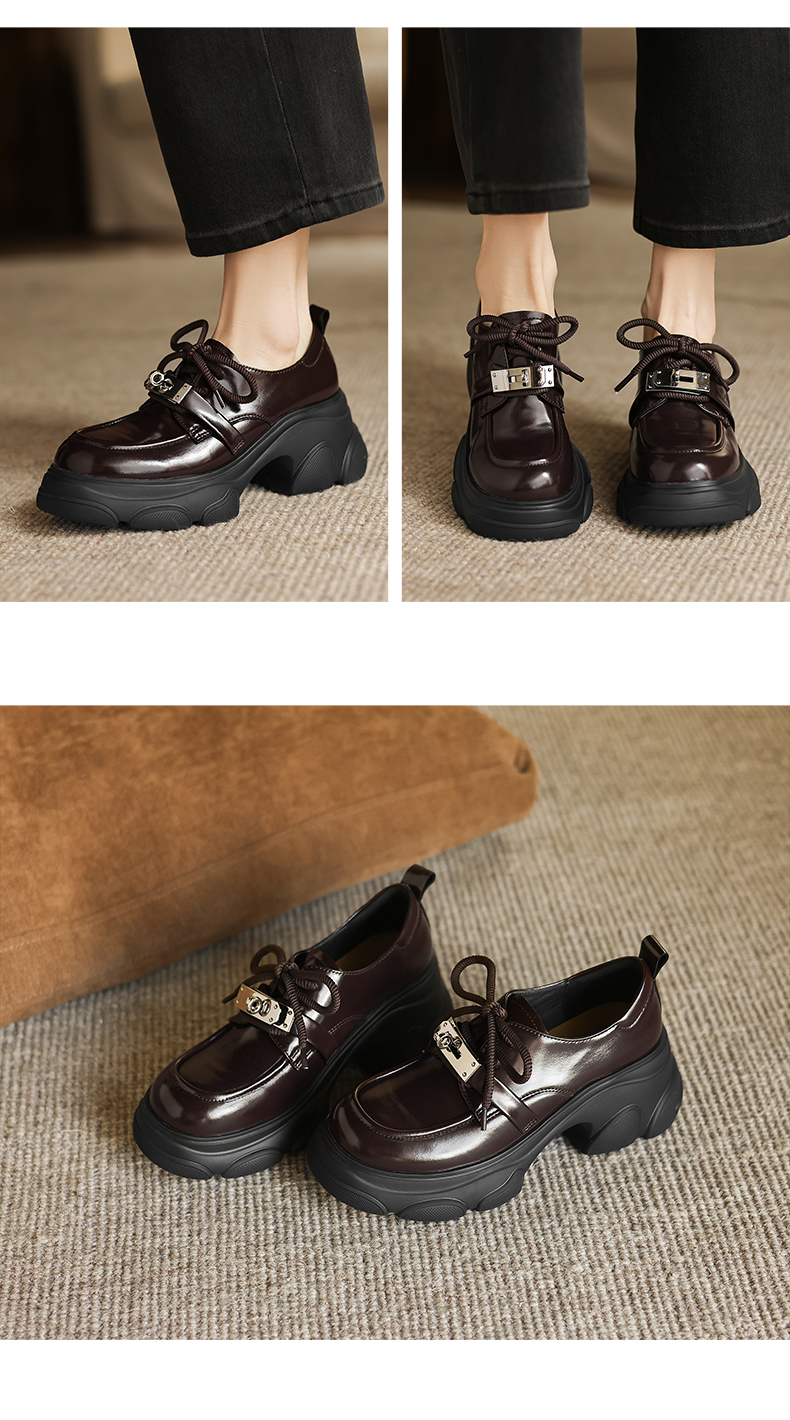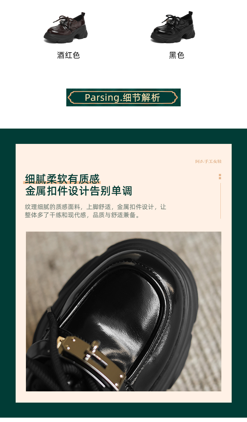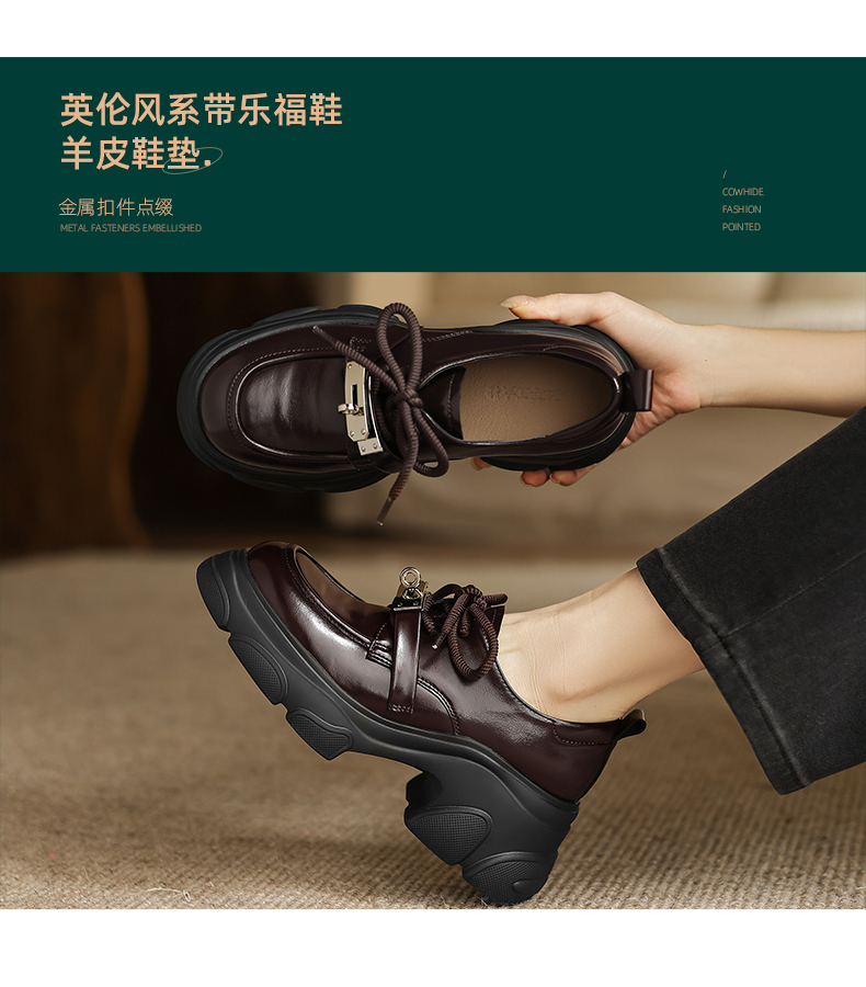阿么手工女鞋厚底系带小皮鞋女复古百搭新款金属扣真皮乐福鞋7CM