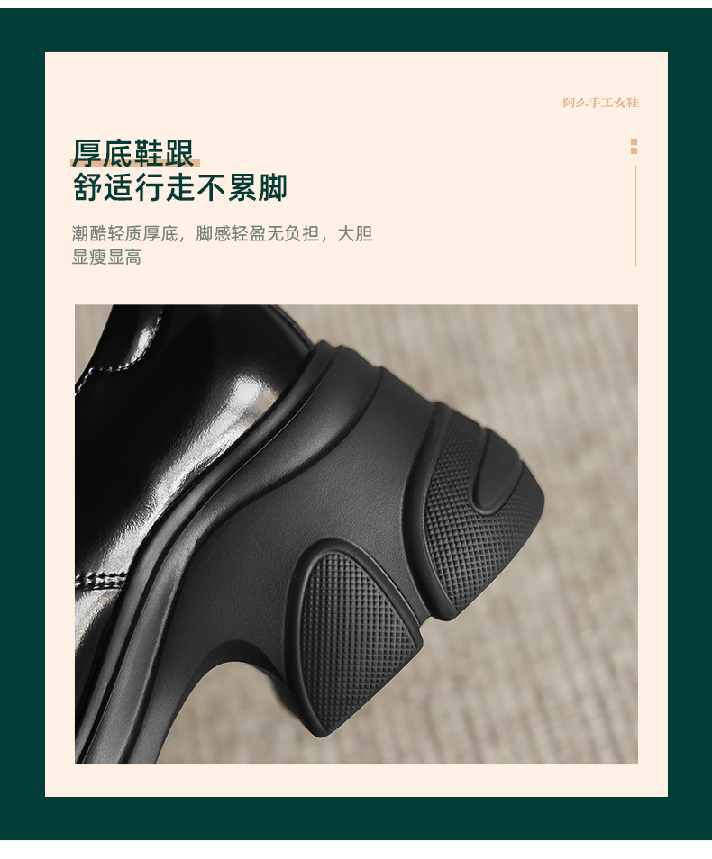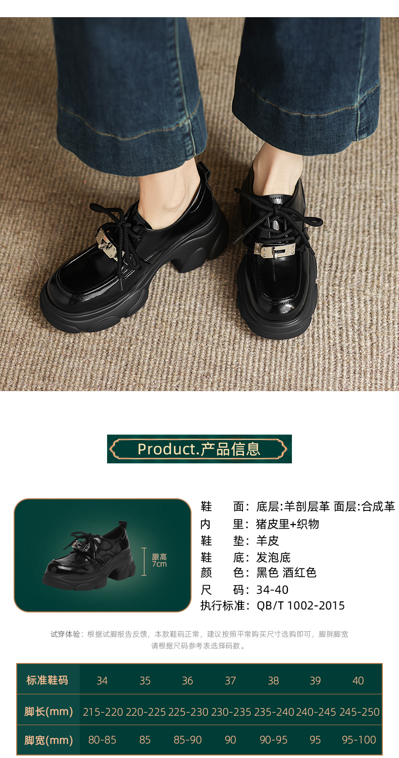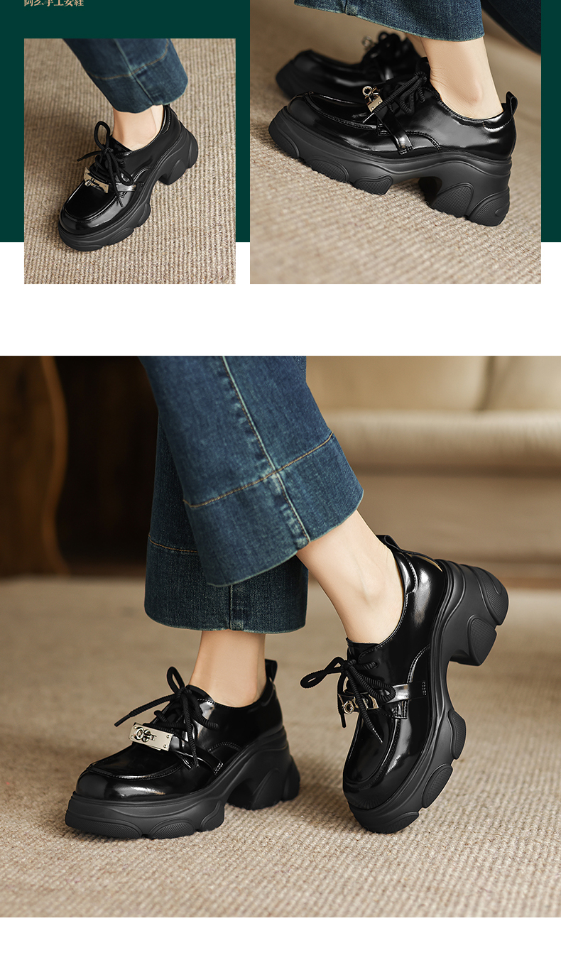 阿么手工女鞋厚底系带小皮鞋女复古百搭新款金属扣真皮乐福鞋7CM