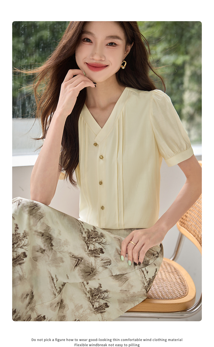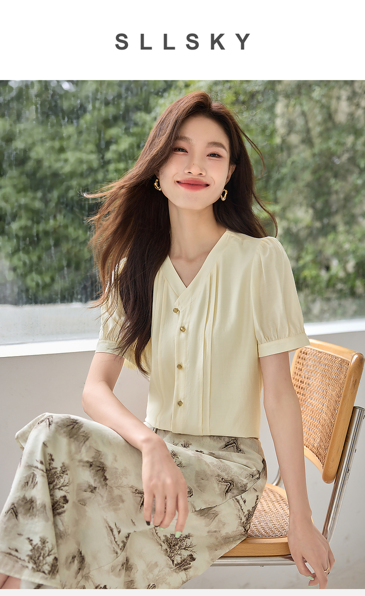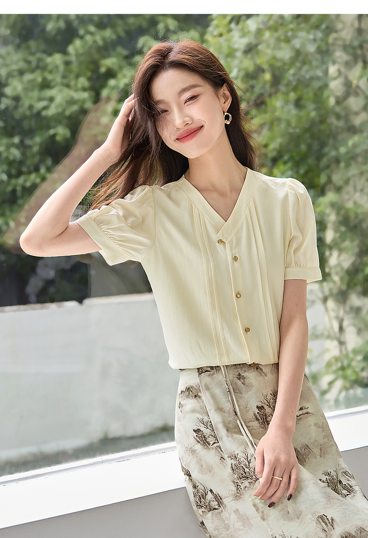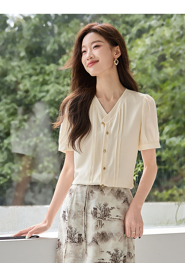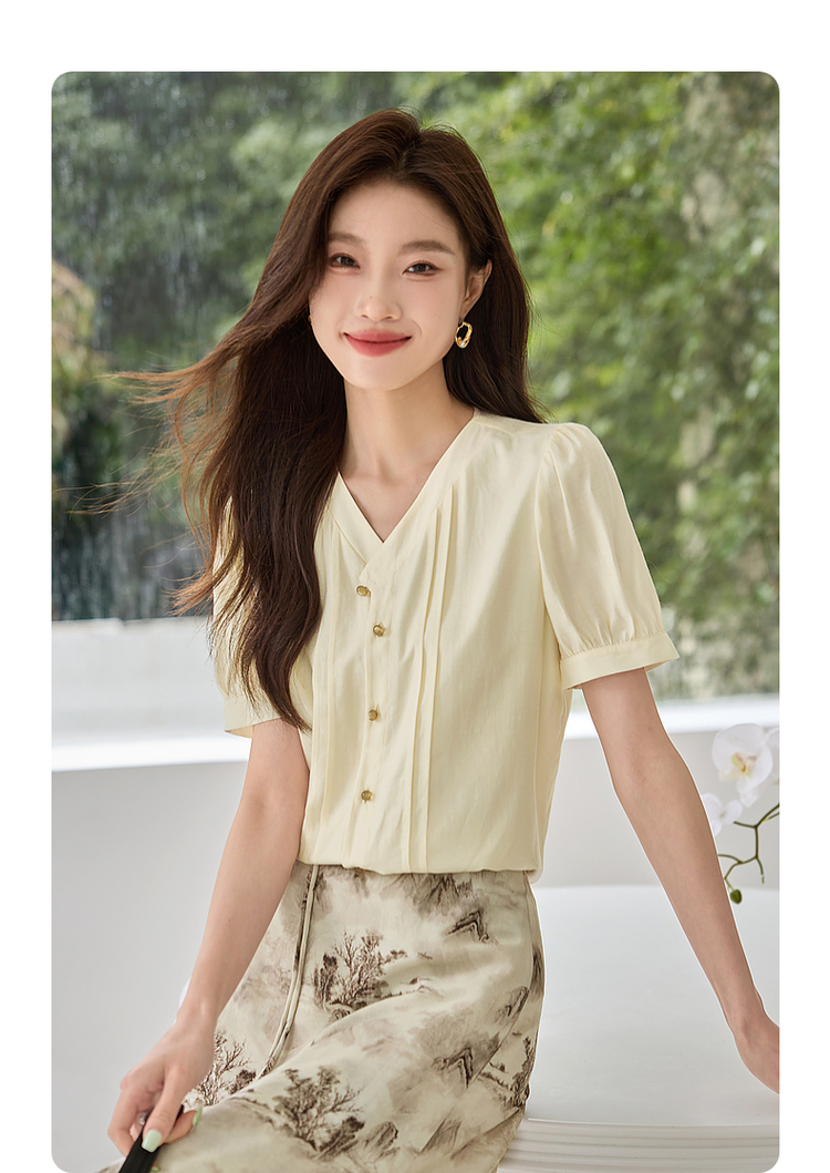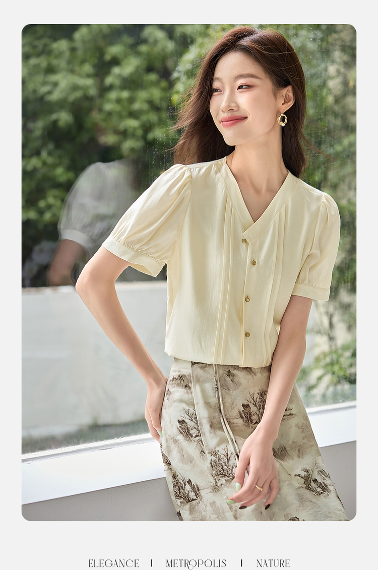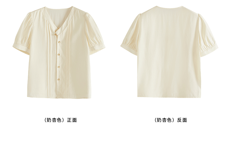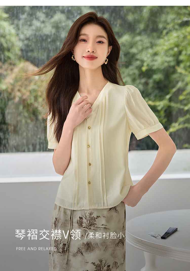 【专属特价】熙世界法式仿醋酸V领衬衫夏2025新款气质减龄短袖衬衣显瘦上衣