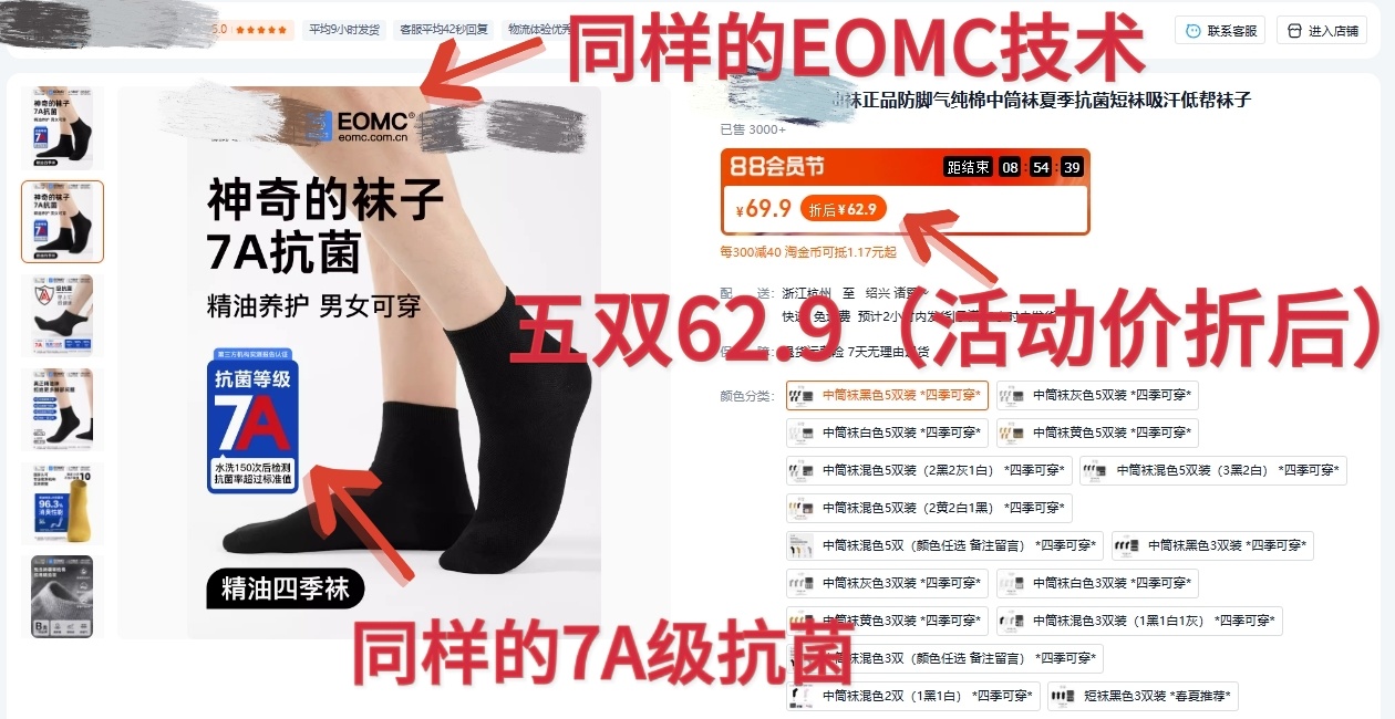 这款袜子独特之处就是使用了3重防臭除菌工艺