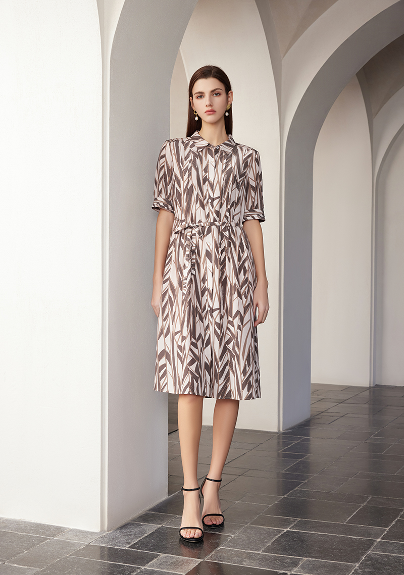 【桑蚕丝系带印花连衣裙】24年春夏新品女士100%桑蚕丝连衣裙时尚条纹印花裙子
