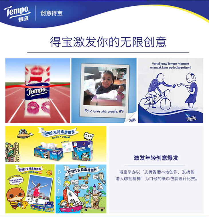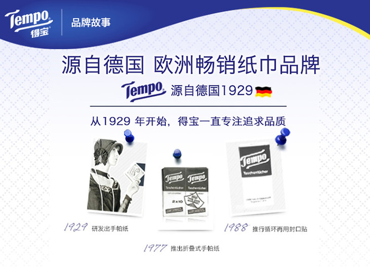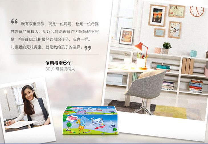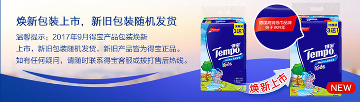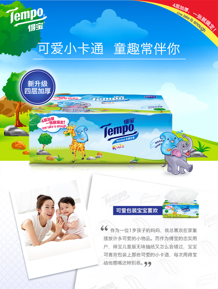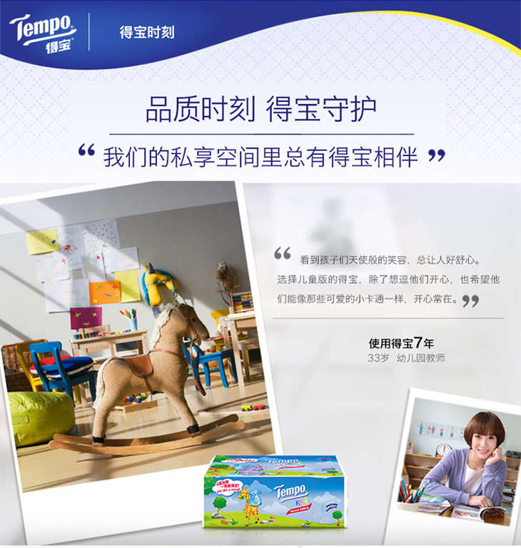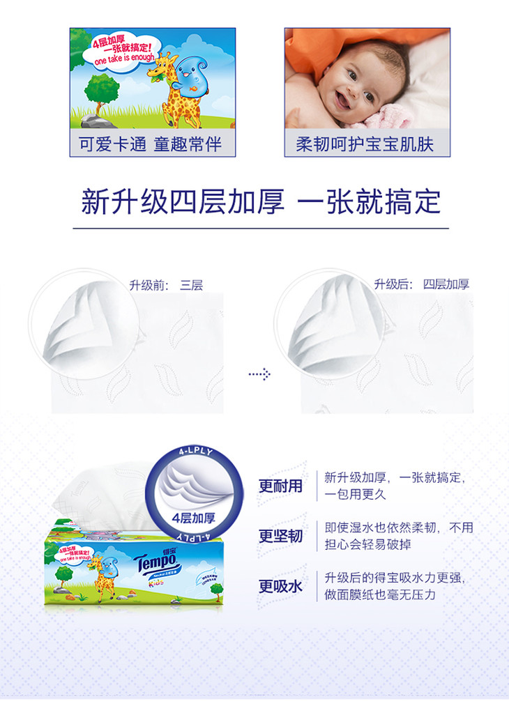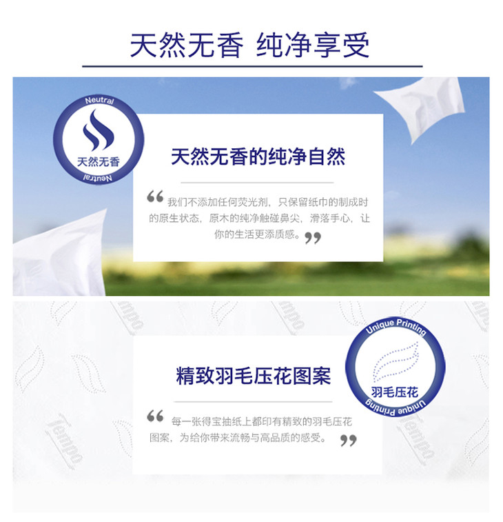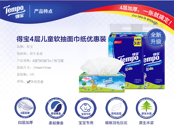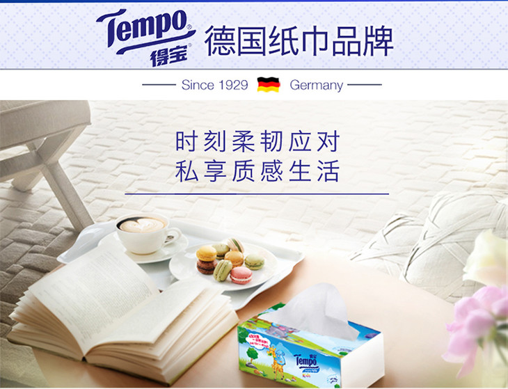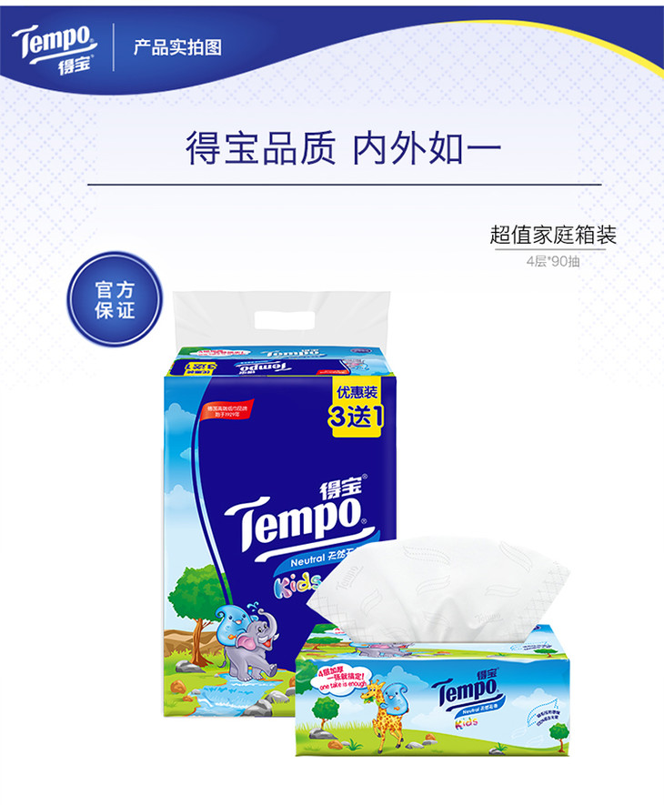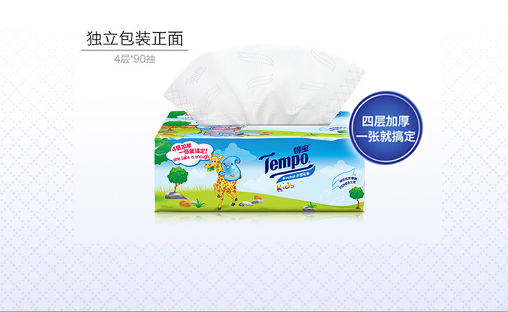 Tempo得宝软抽纸儿童专用纸巾天然无香4层90抽8包抽纸餐巾纸