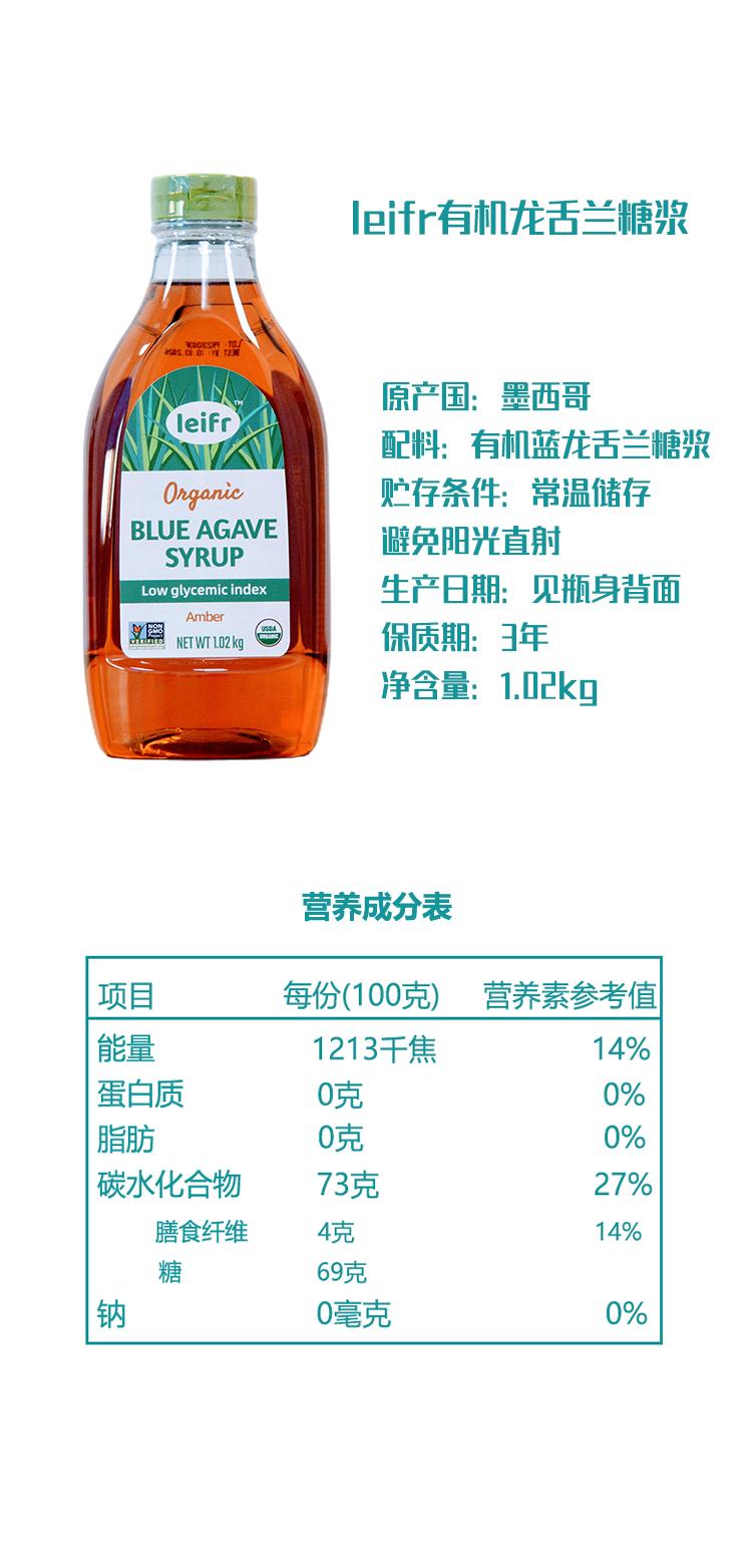 leifr龙舌兰糖浆墨西哥进口1.02kg【义乌保税仓】