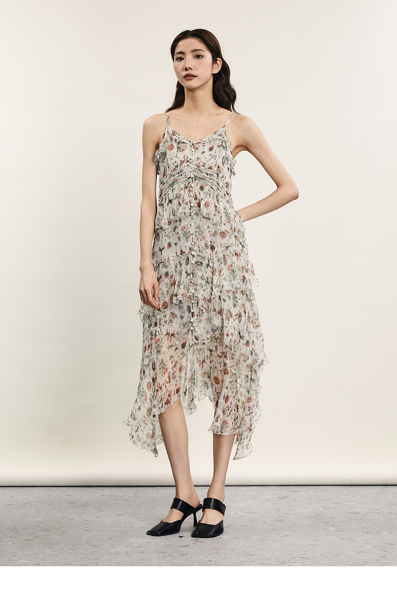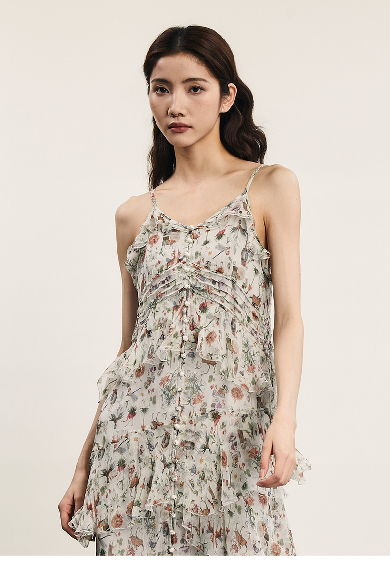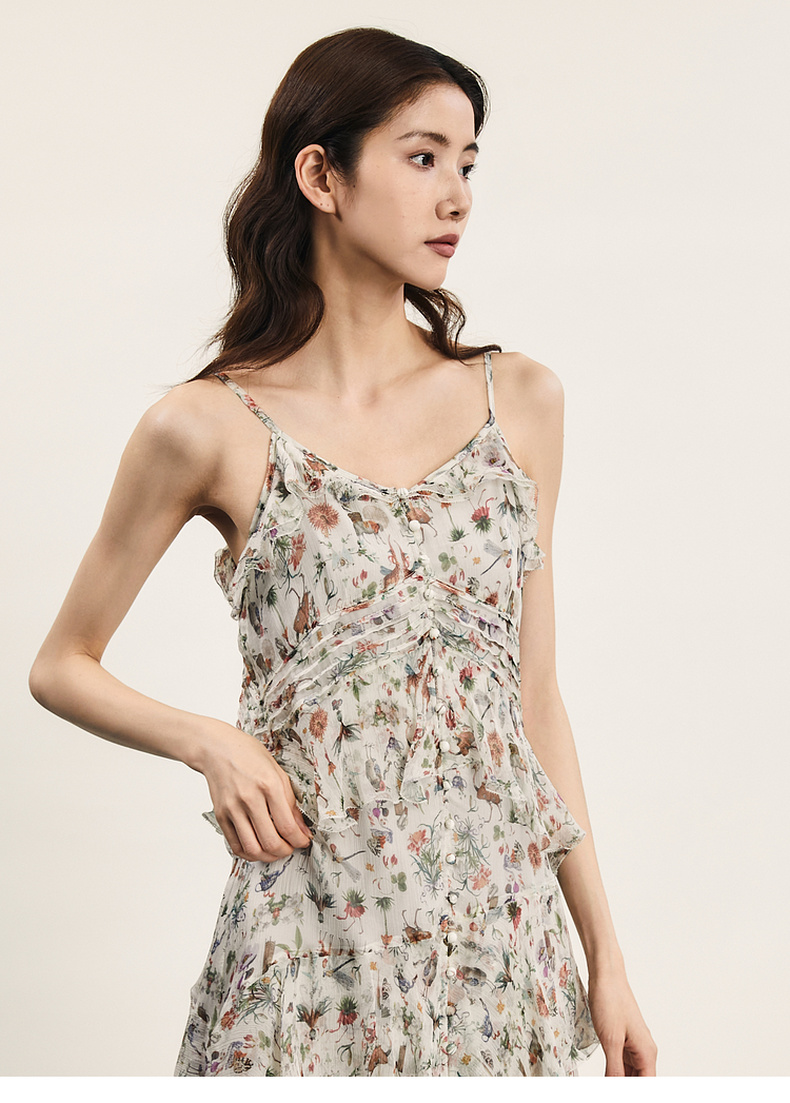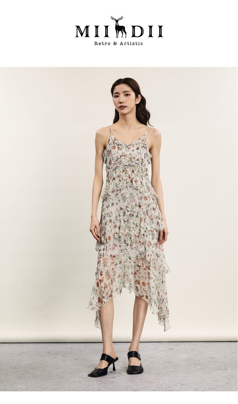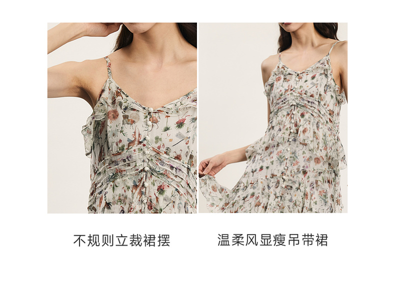 谜底吊带连衣裙2024夏季新品复古法式桑蚕丝碎花中长裙242GL0609