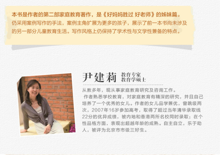 本书是尹建莉老师出版得《好妈妈胜过好老师》得姊妹篇。在内容方面和《好妈妈胜过好老师》并列。本书仍采用案例写作的手法,案例主角扩展为孩子,展示了前一本书尚未涉及的另一部分儿童教育生活。