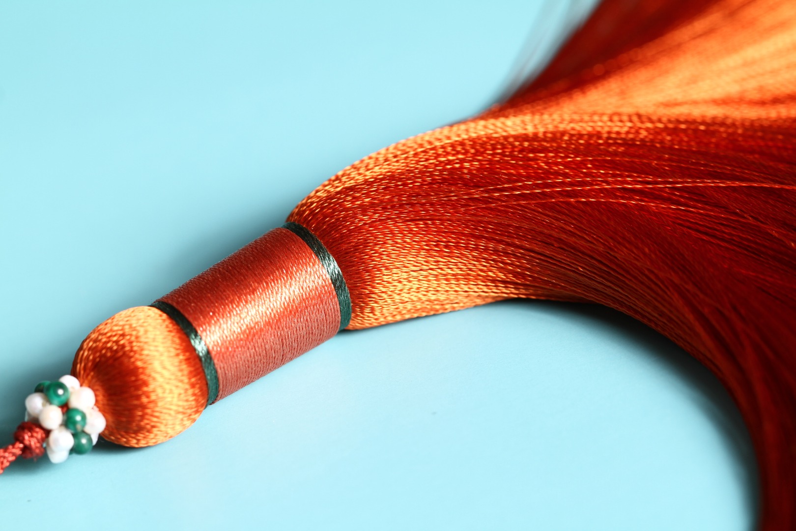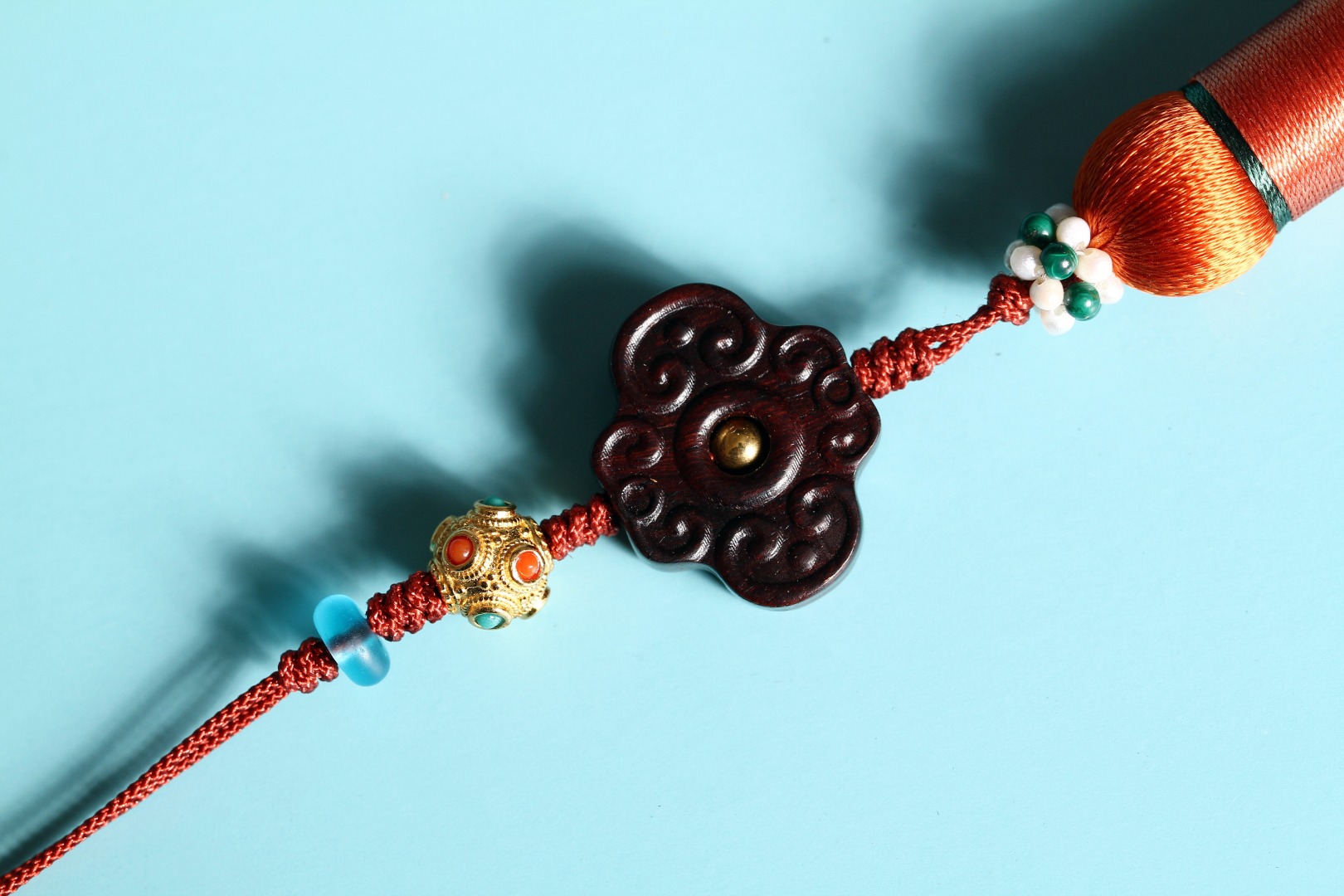 配饰:紫檀如意背云/琉璃/银镀金镶绿松南红/铜珠/珠花(孔雀石)