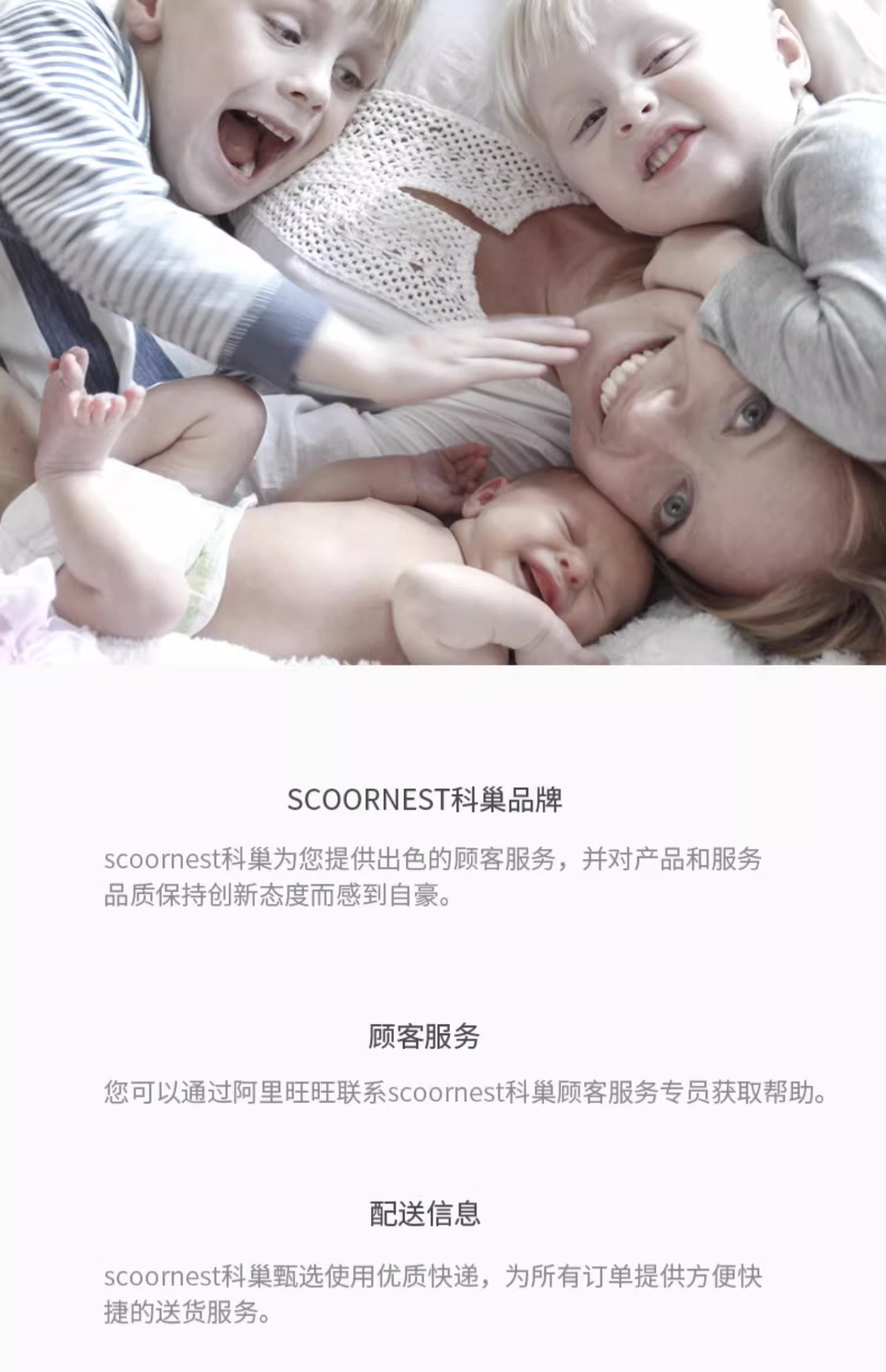 - Scoornest始终秉承给每一位宝宝送去科学的、关心的、创新的成长体验,通过提供商品和服务,使顾客形成守护、发展、巩固这种弥足珍贵的亲情的爱。