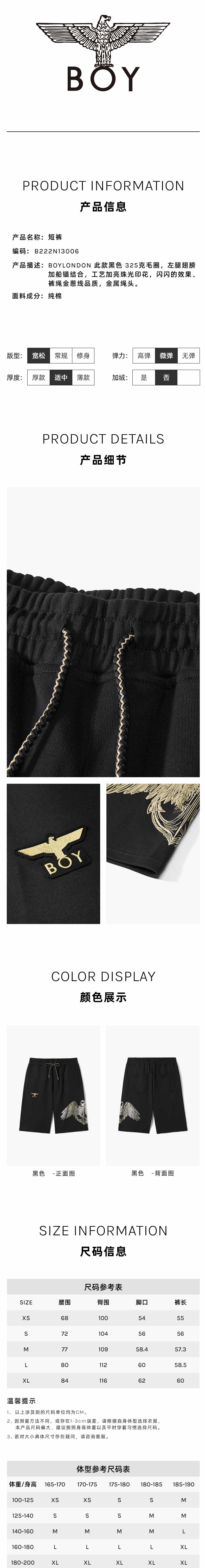 BOYLONDON短裤男女同款22春夏新品鹰翼印花黑色宽松休闲裤B222N13006