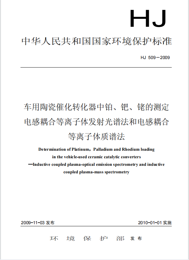 HJ 509-2009 车用陶瓷催化转化器中铂、钯、铑的测定 电感耦合等离子体发射光谱法