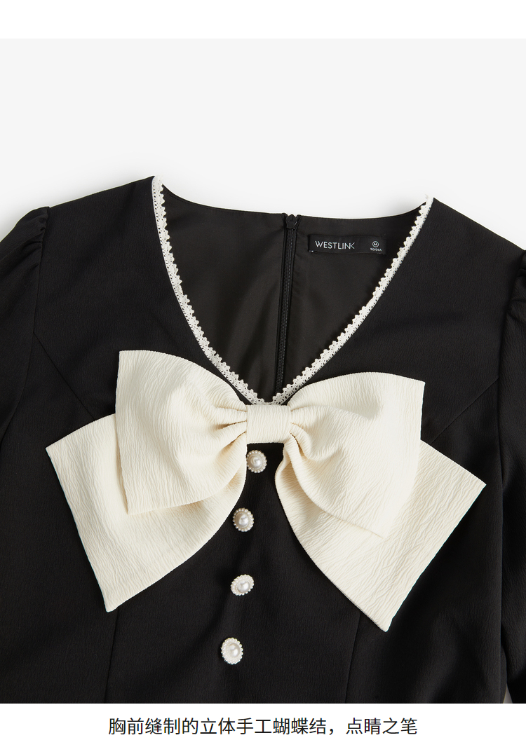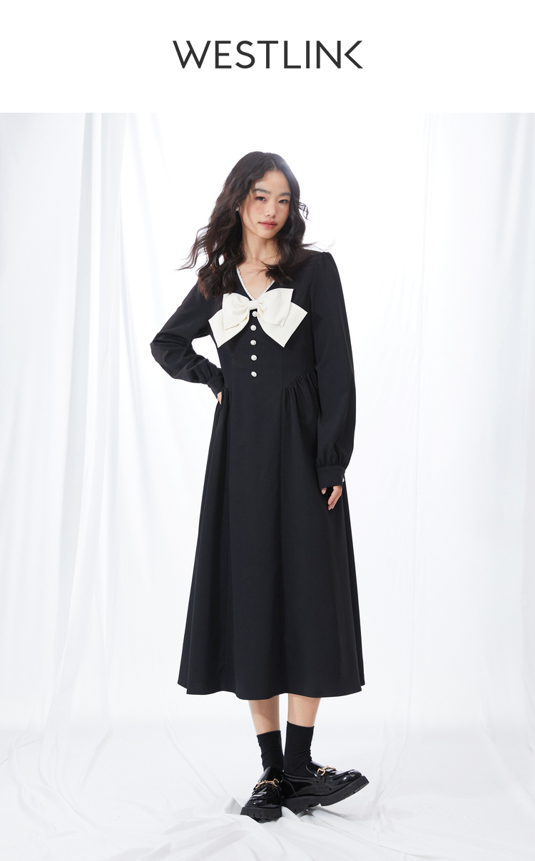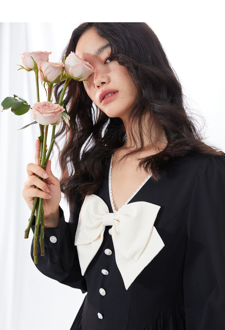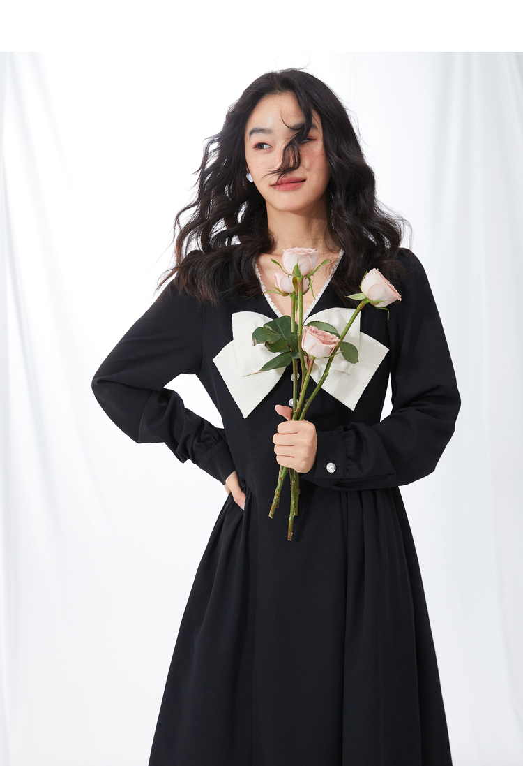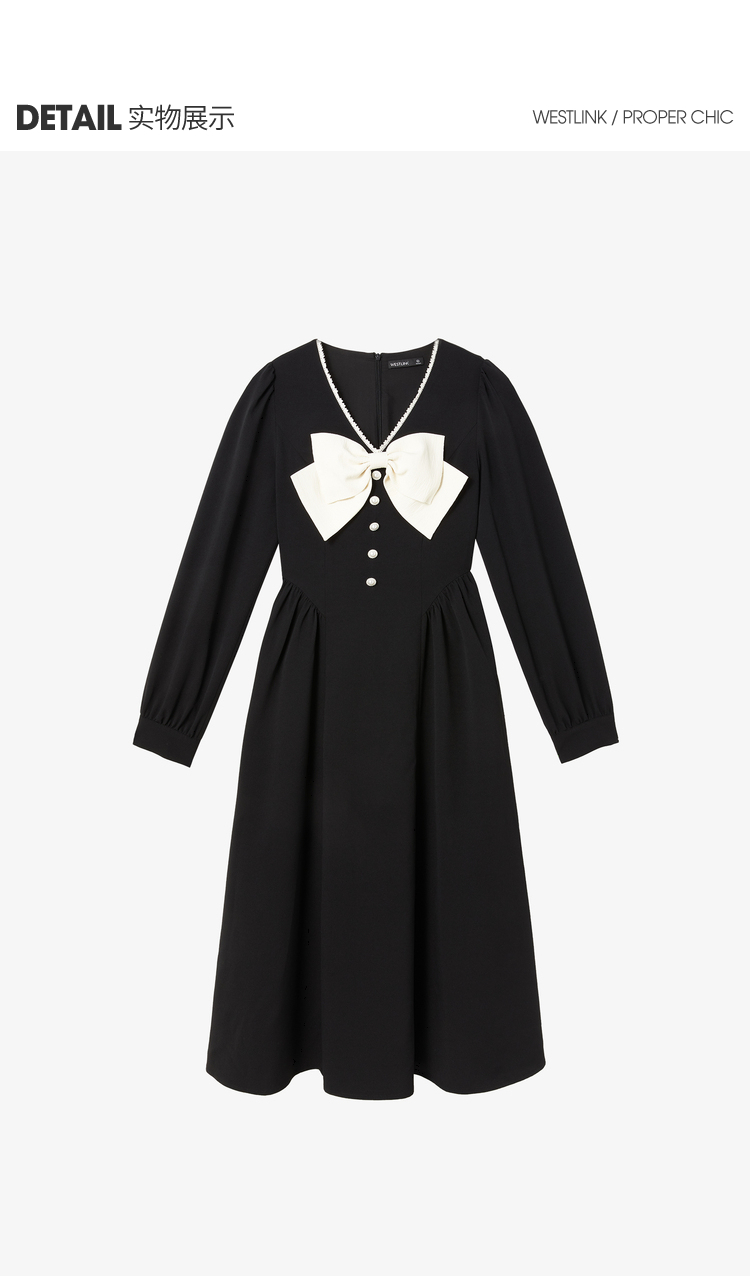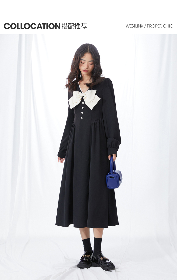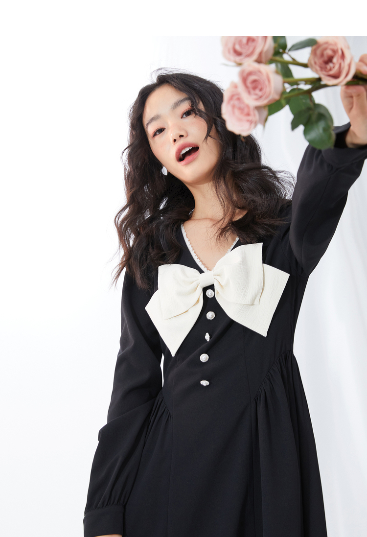 西遇V领连衣裙女早春2023年新款复古法式蝴蝶结小黑裙10120073