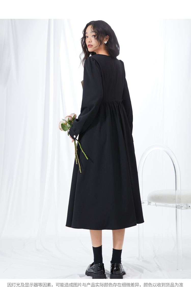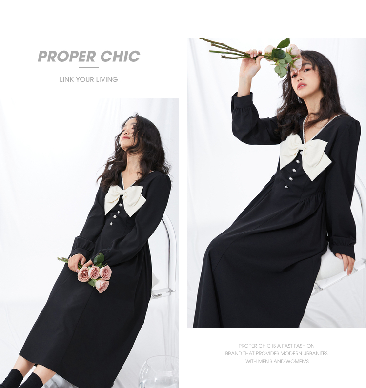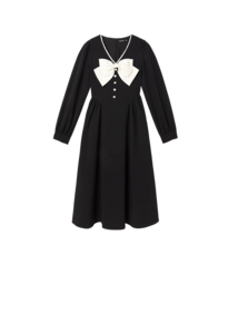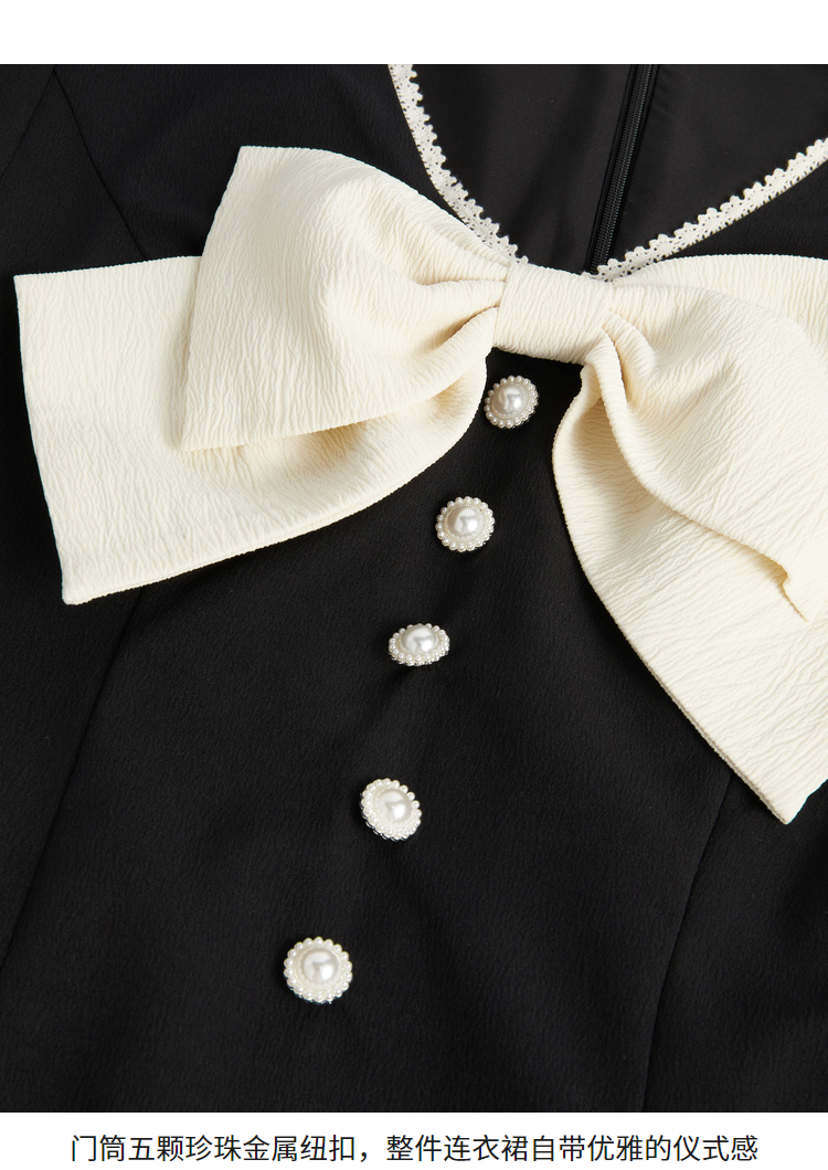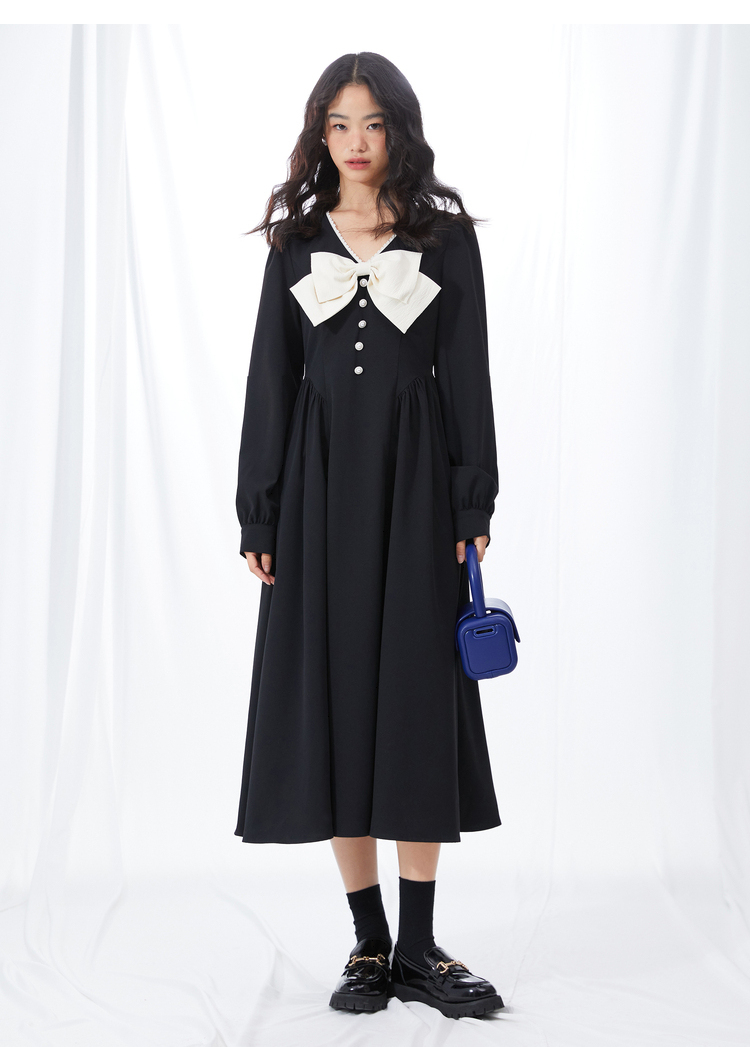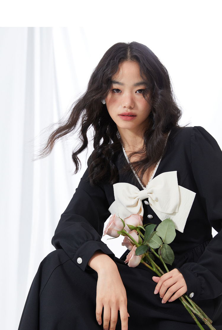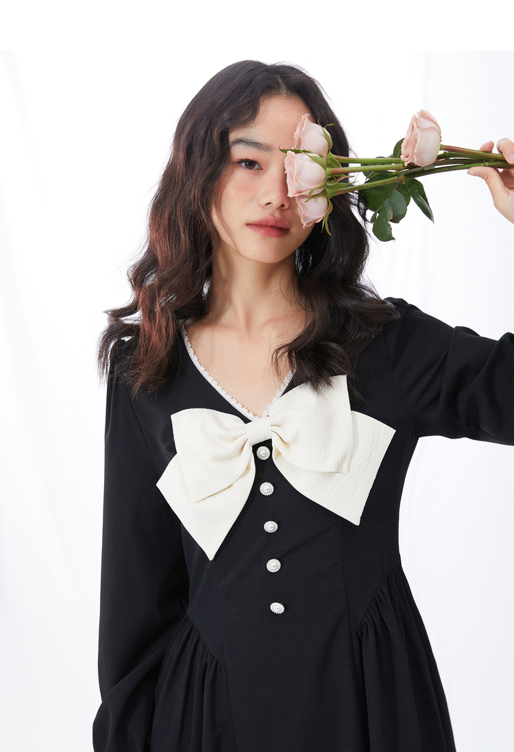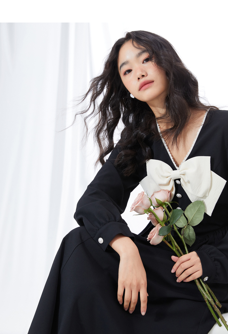 西遇V领连衣裙女早春2023年新款复古法式蝴蝶结小黑裙10120073
