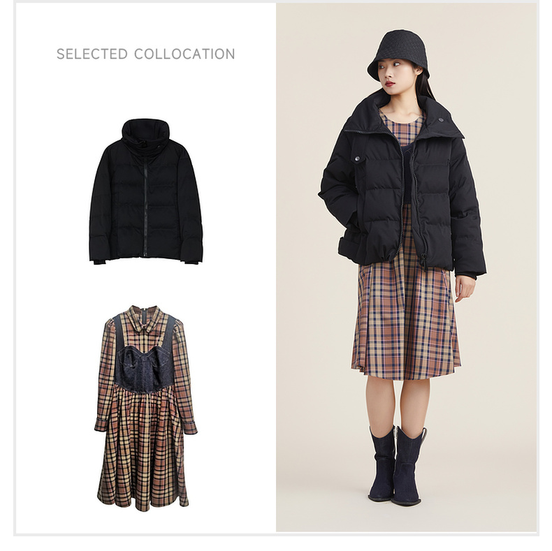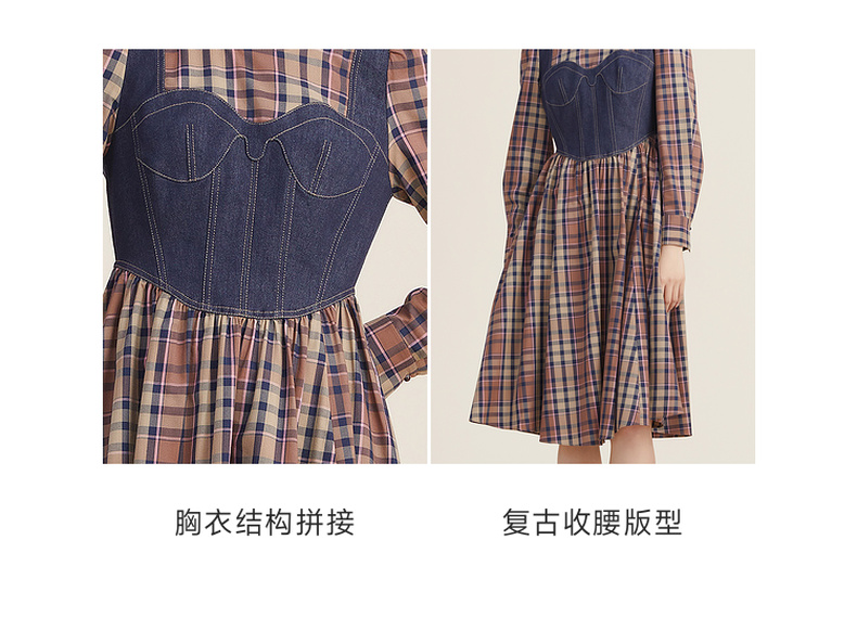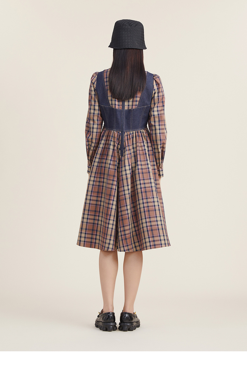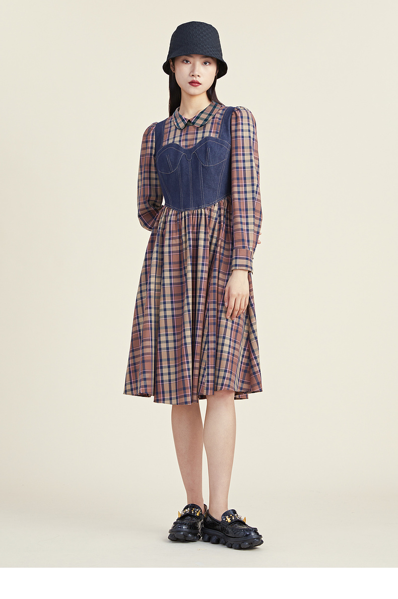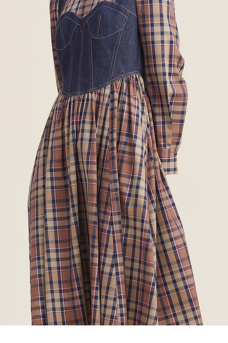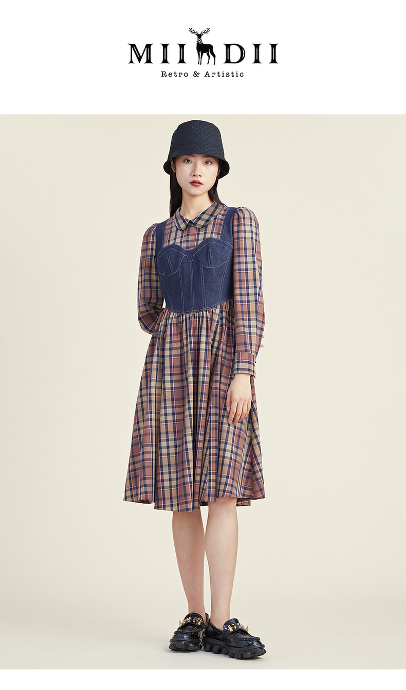 谜底连衣裙2022秋新款复古文艺格子拼接牛仔中长裙女223ML1152