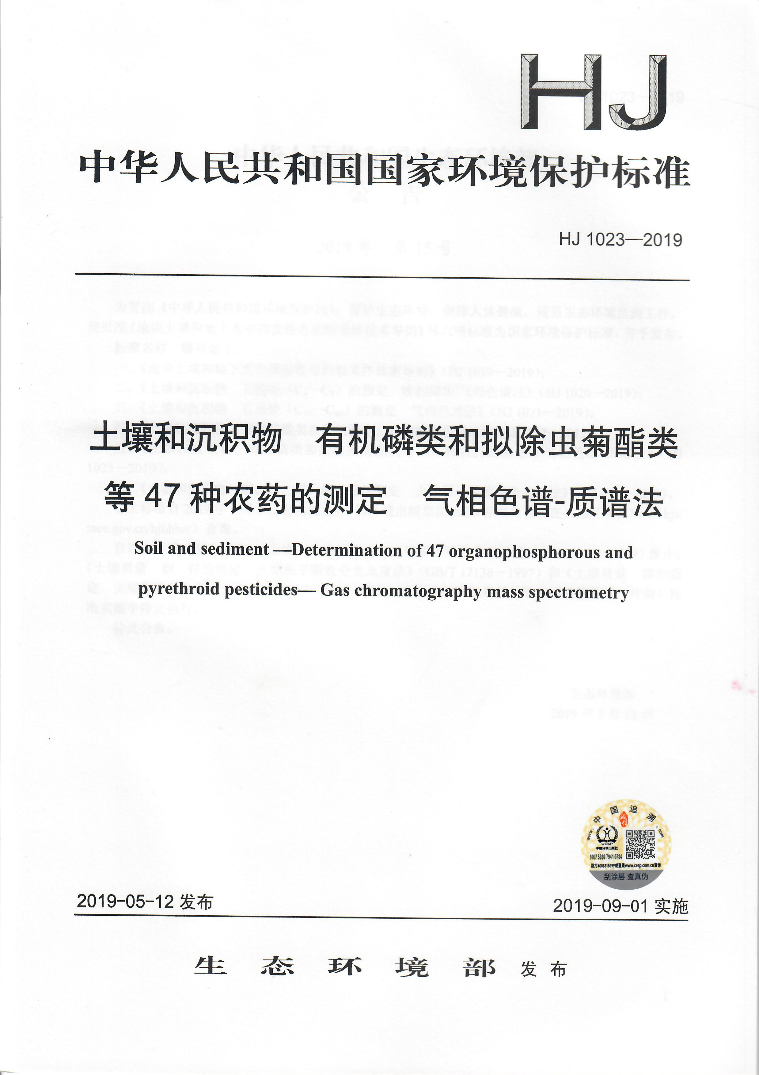 HJ 1023-2019 土壤和沉积物 有机磷类和拟除虫菊酯类等47种农药的测定 气相色谱-质谱法135111783