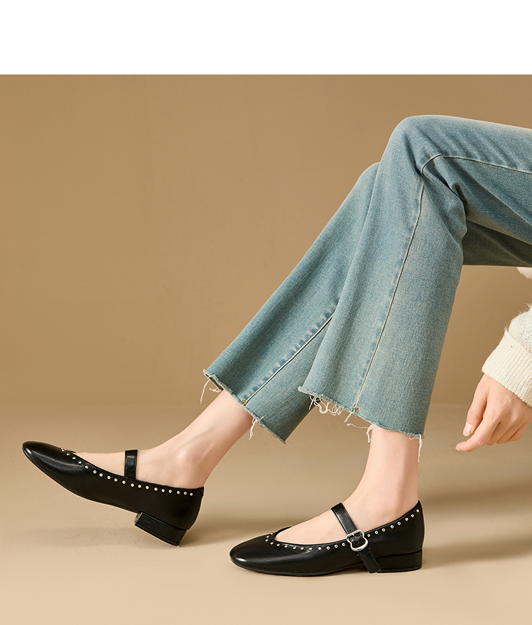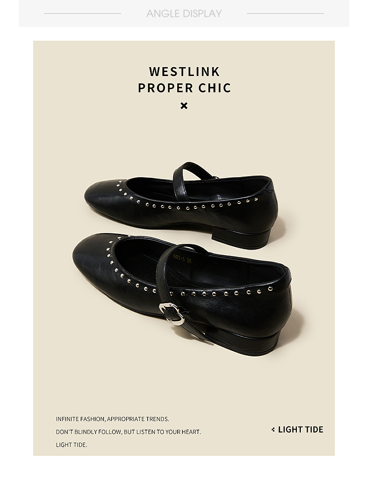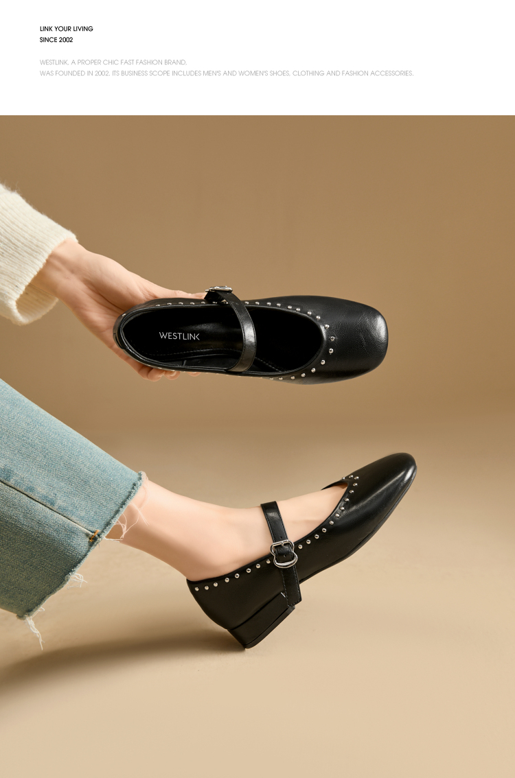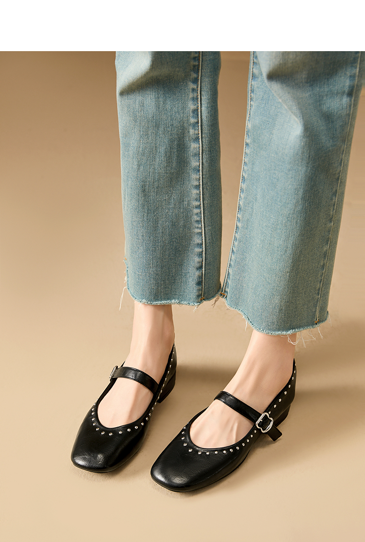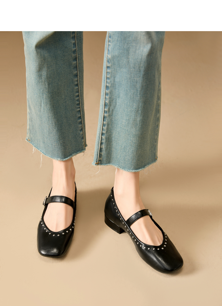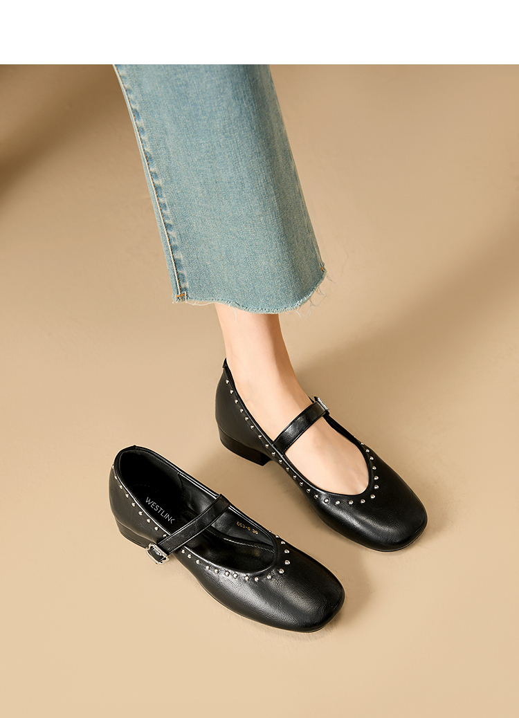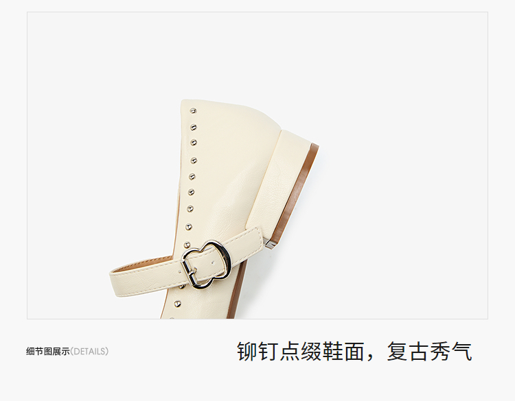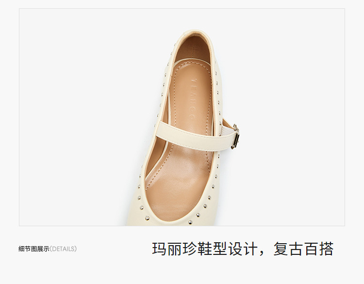 西遇复古玛丽珍女鞋新款法式铆钉圆头小皮鞋软底低跟单鞋V0256264