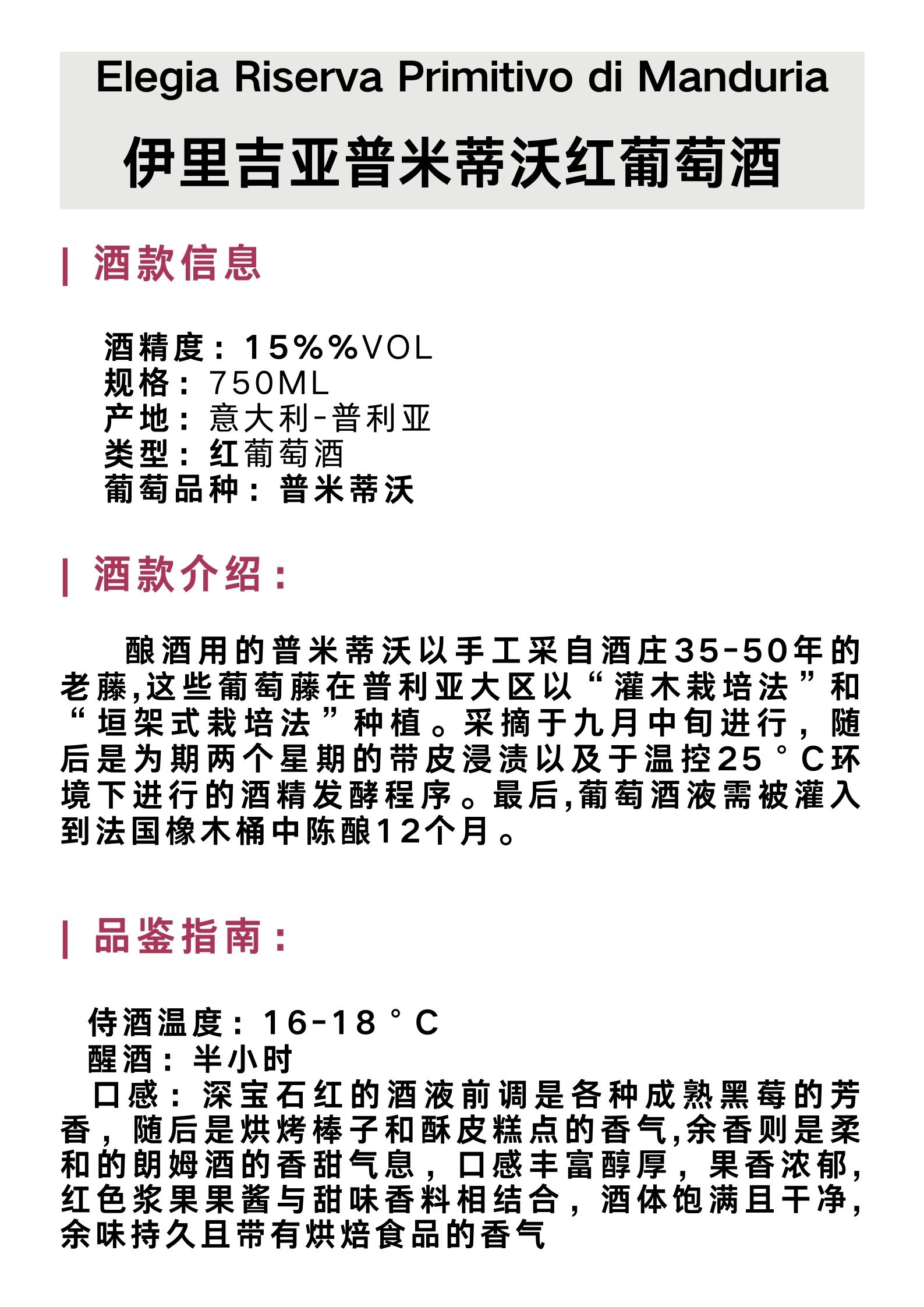 伊里吉亚普米蒂沃红葡萄酒 Elegia Riserva Primitivo di Manduria