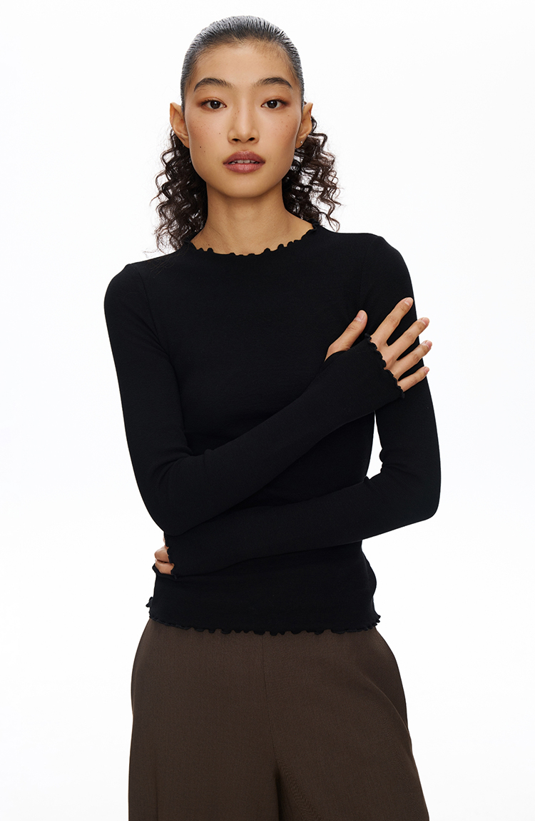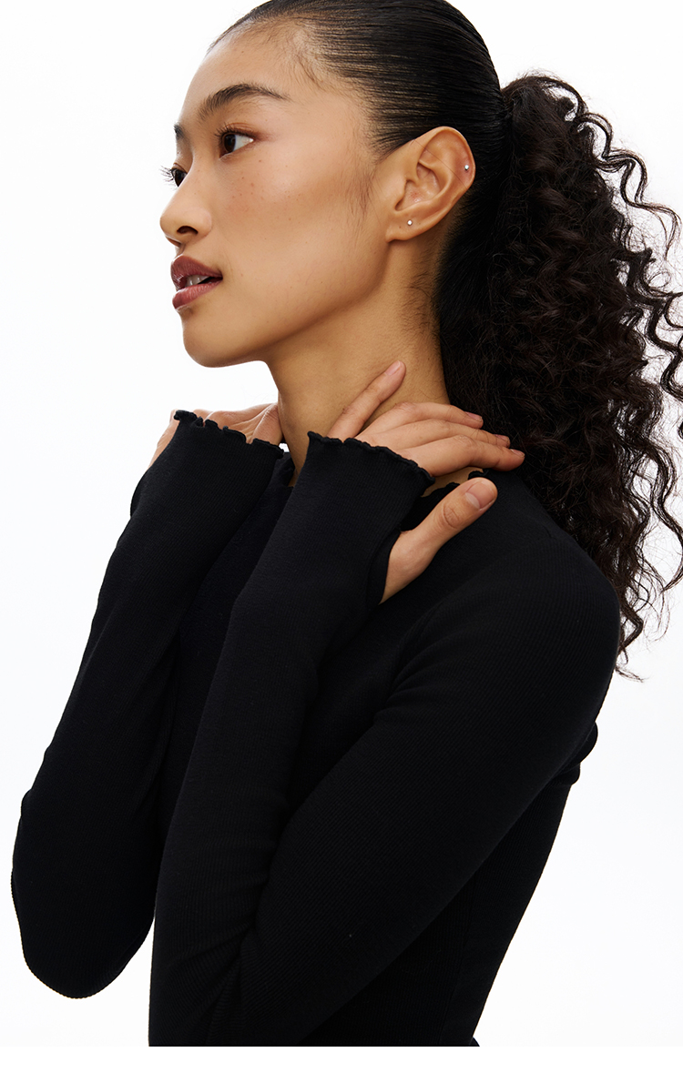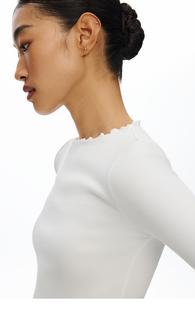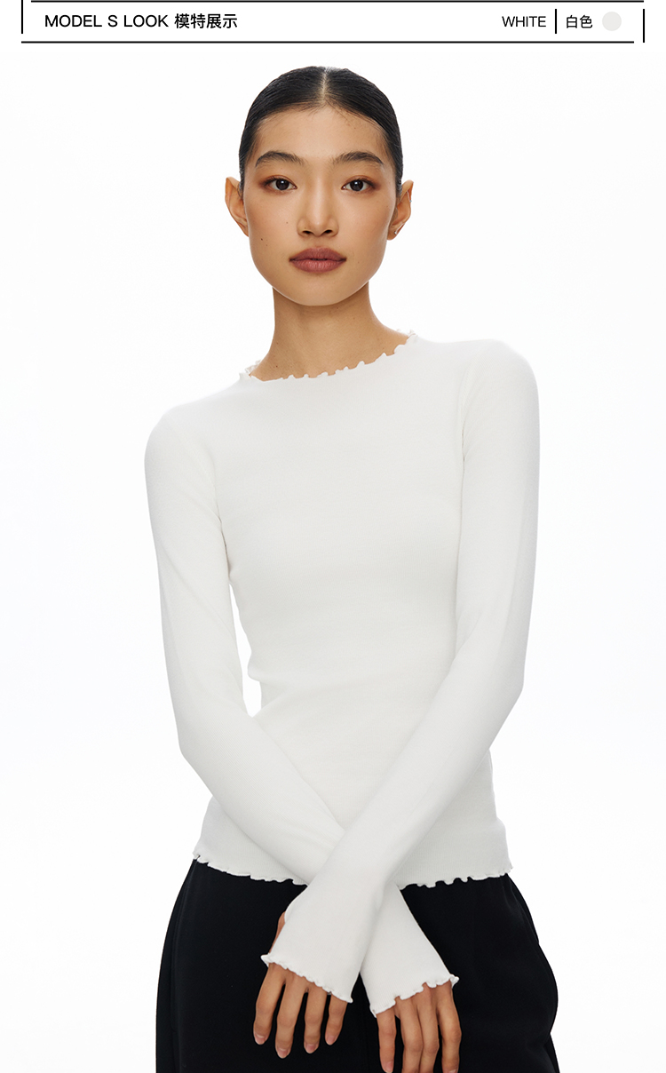 密边螺纹修身长袖T恤