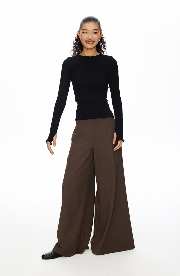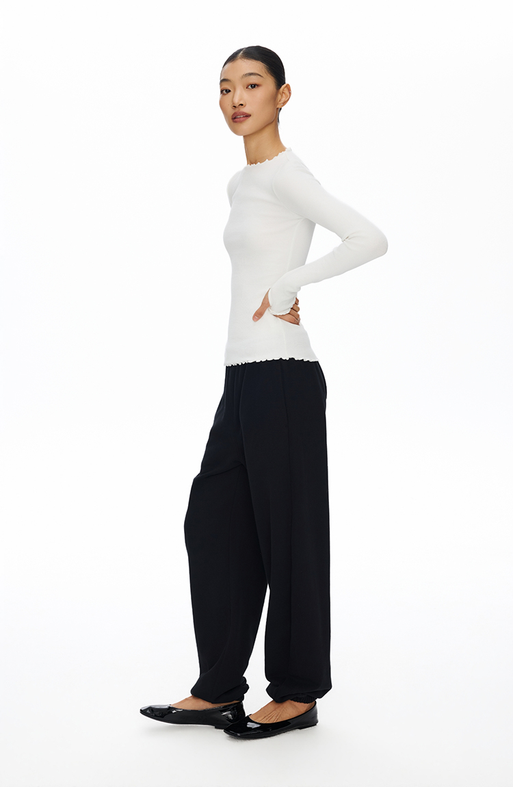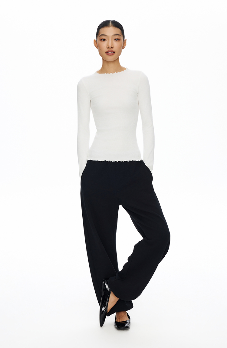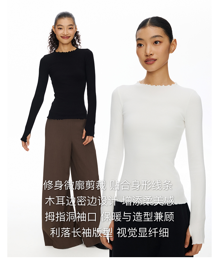 密边螺纹修身长袖T恤