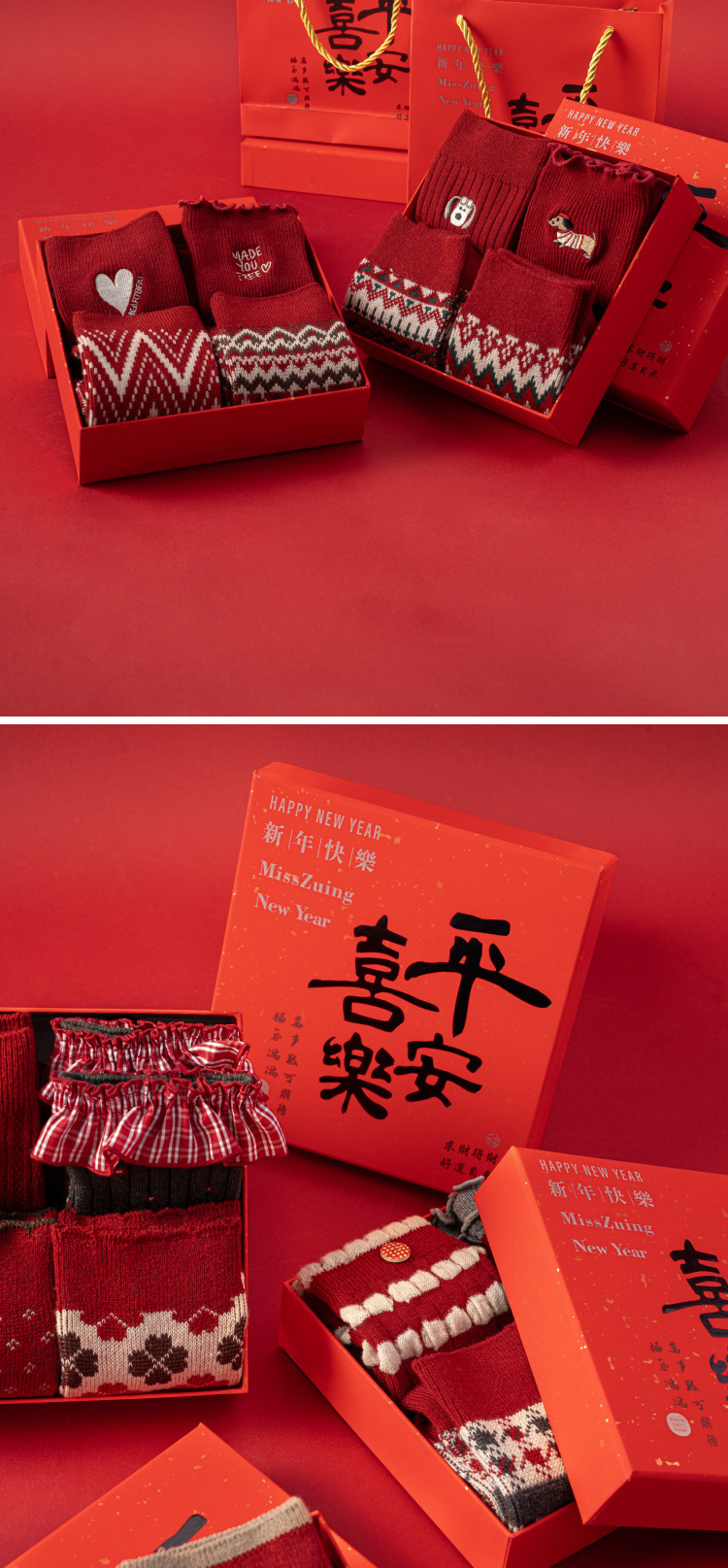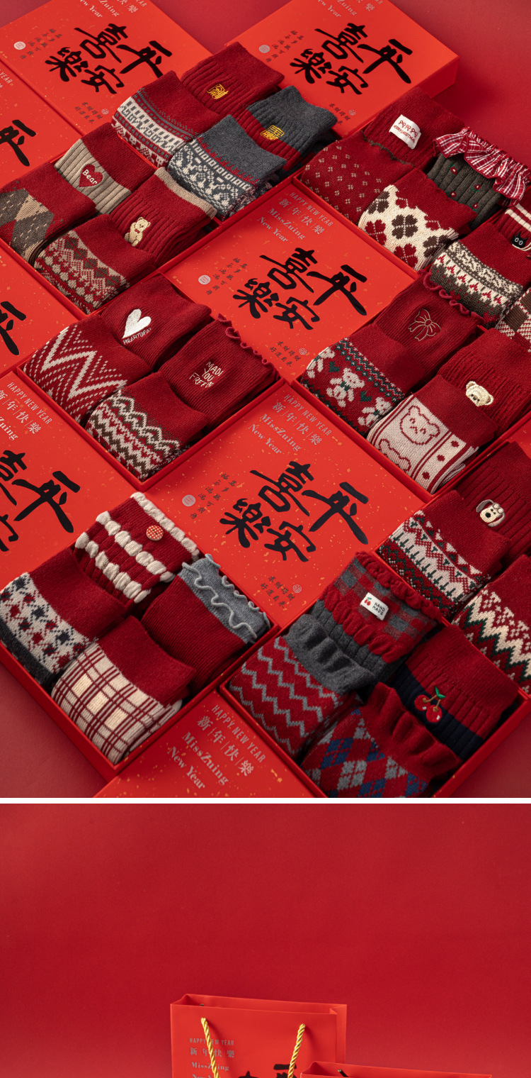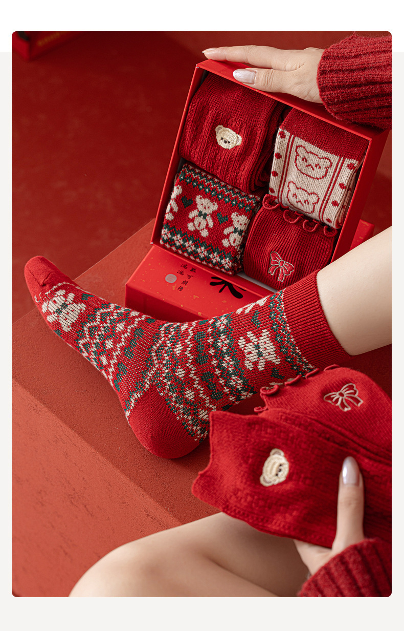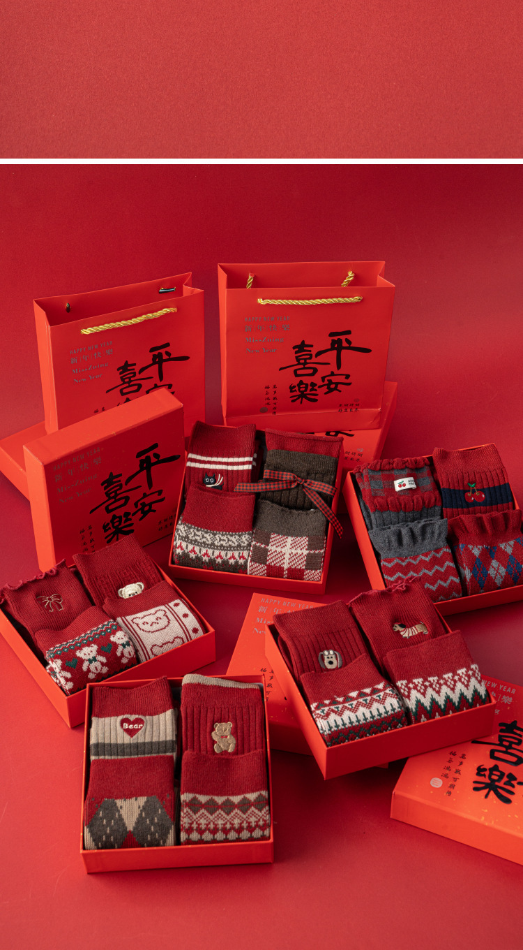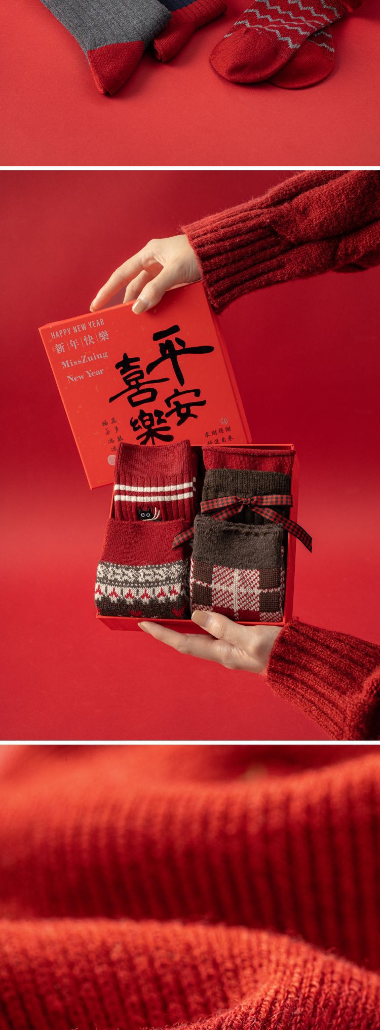 礼盒红袜子女秋冬羊绒袜加厚保暖双针无线头新年礼盒装红色中筒袜