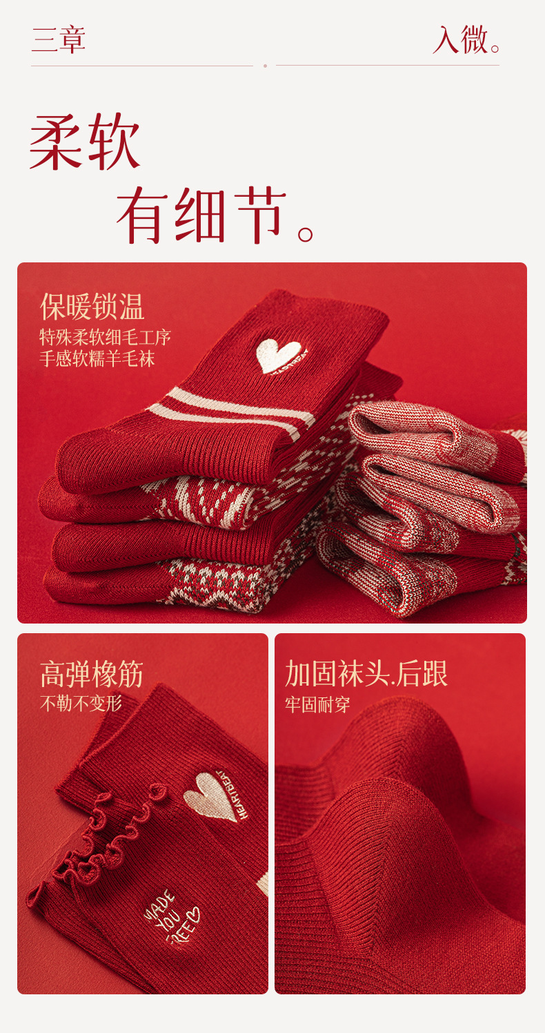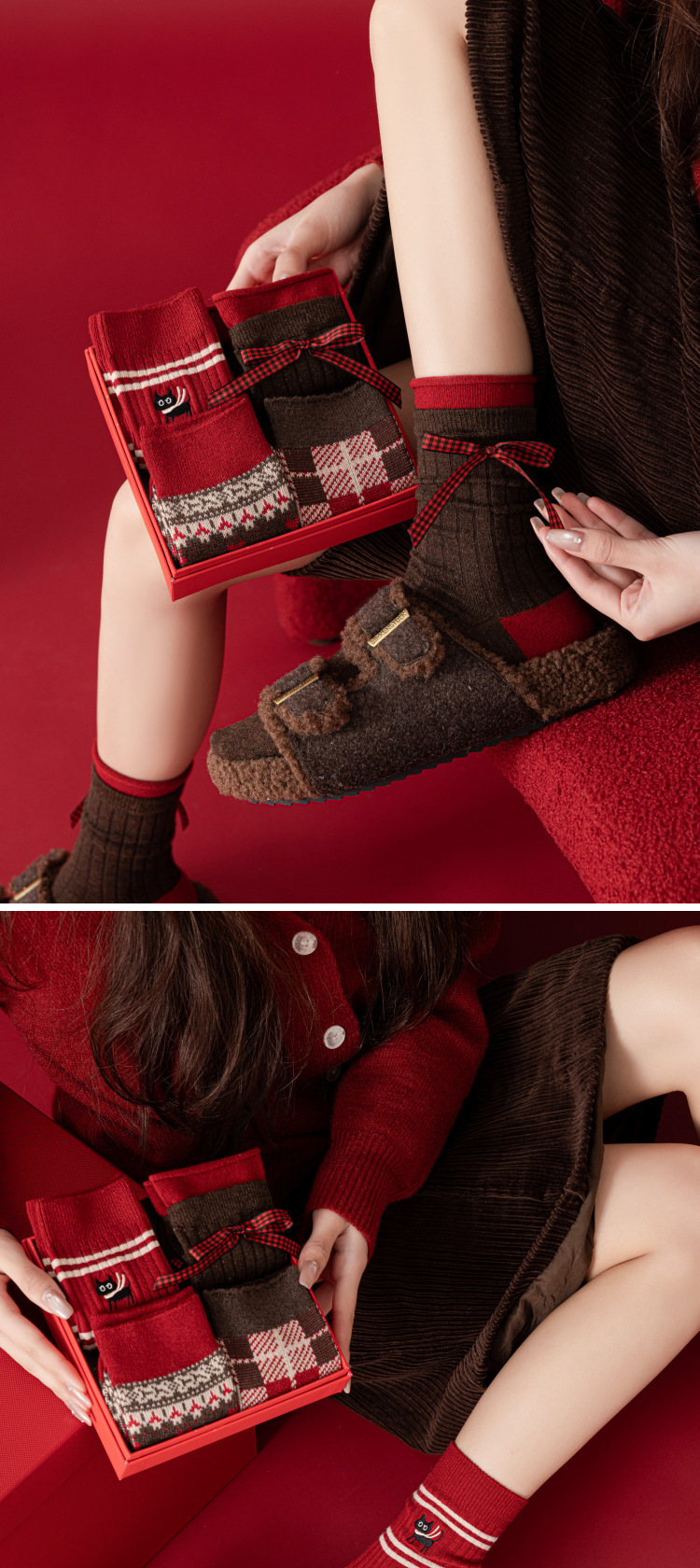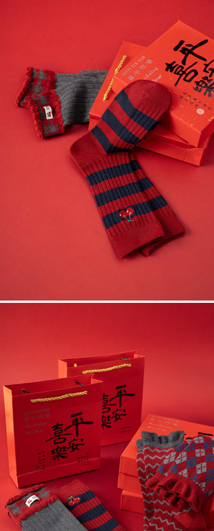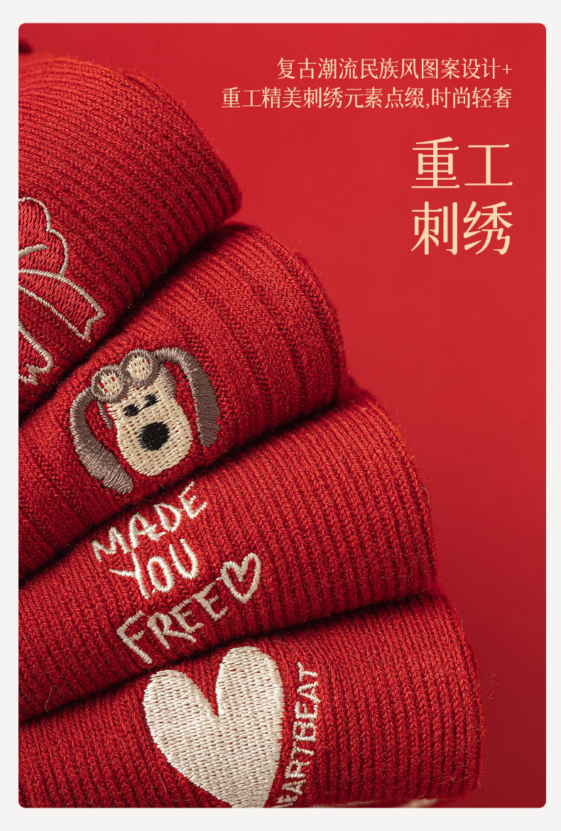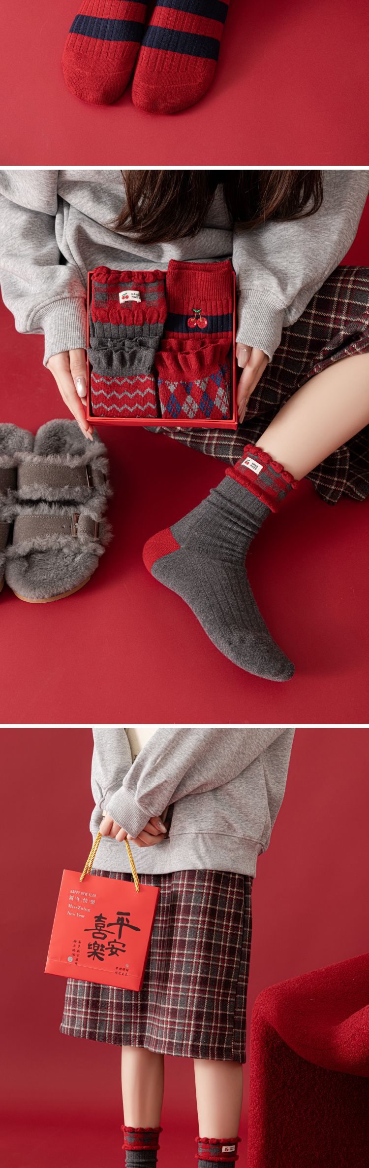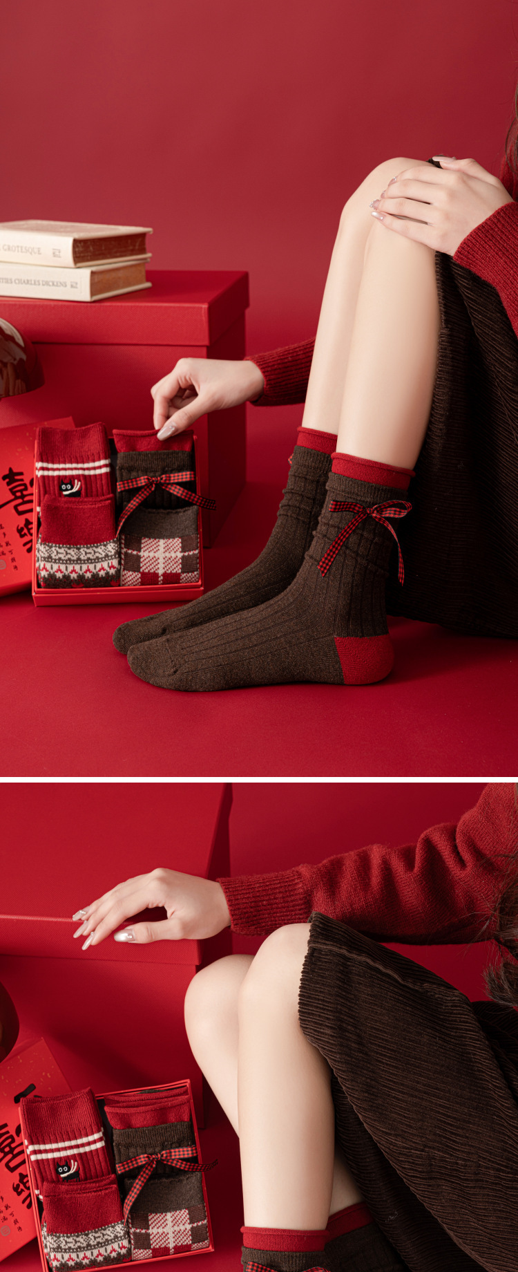 礼盒红袜子女秋冬羊绒袜加厚保暖双针无线头新年礼盒装红色中筒袜