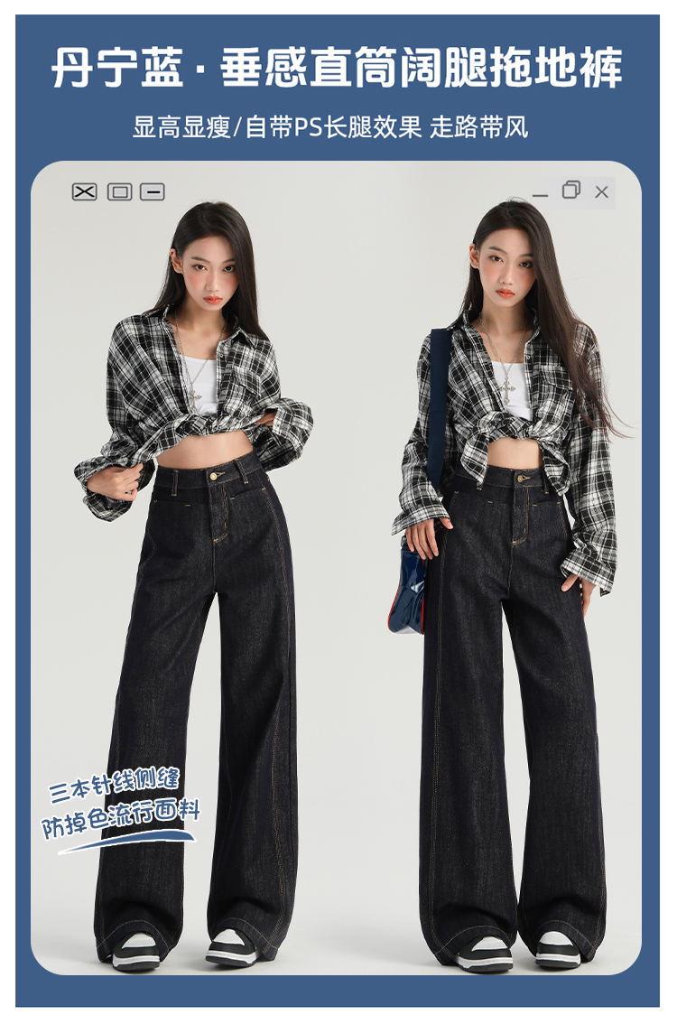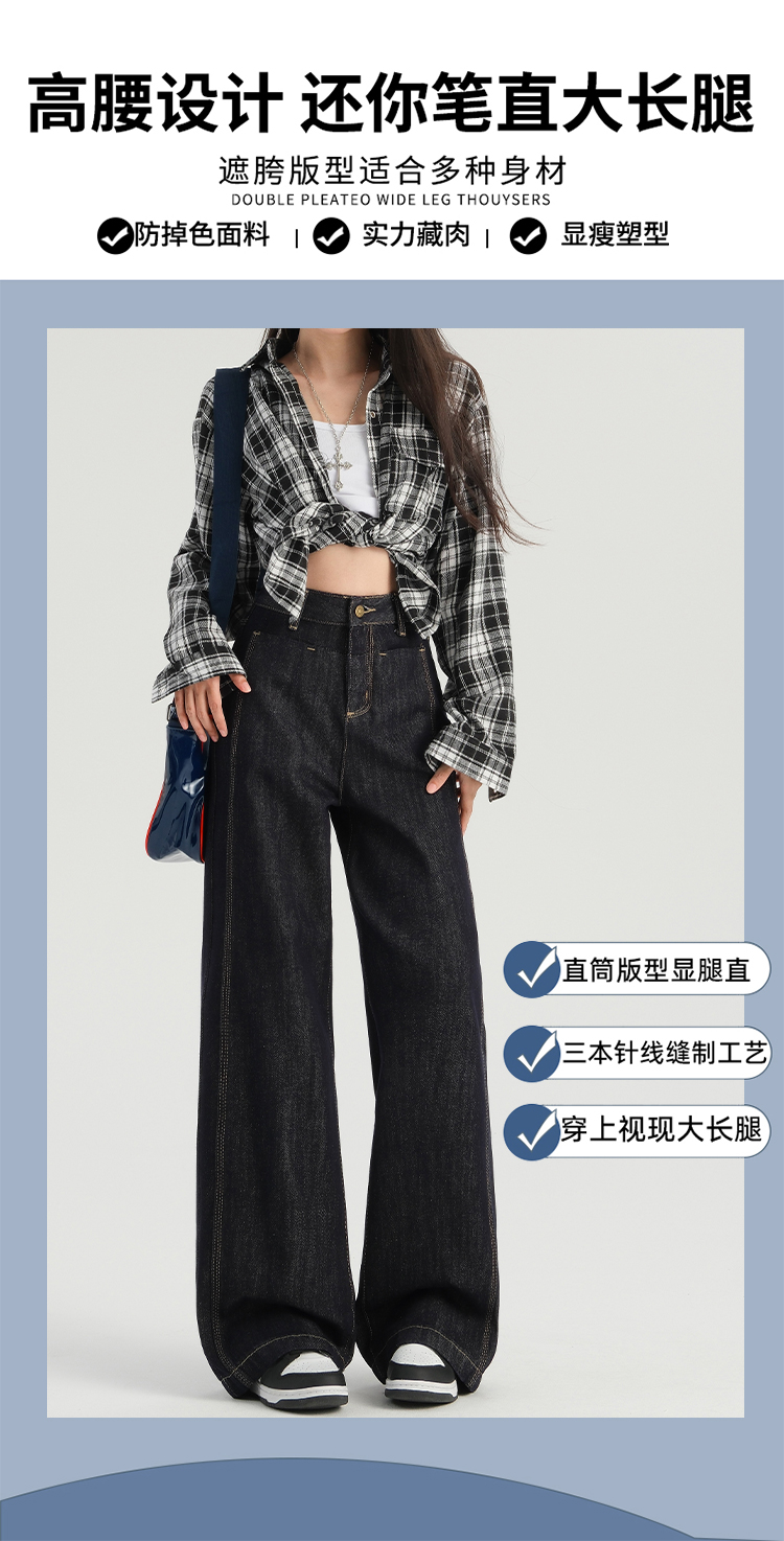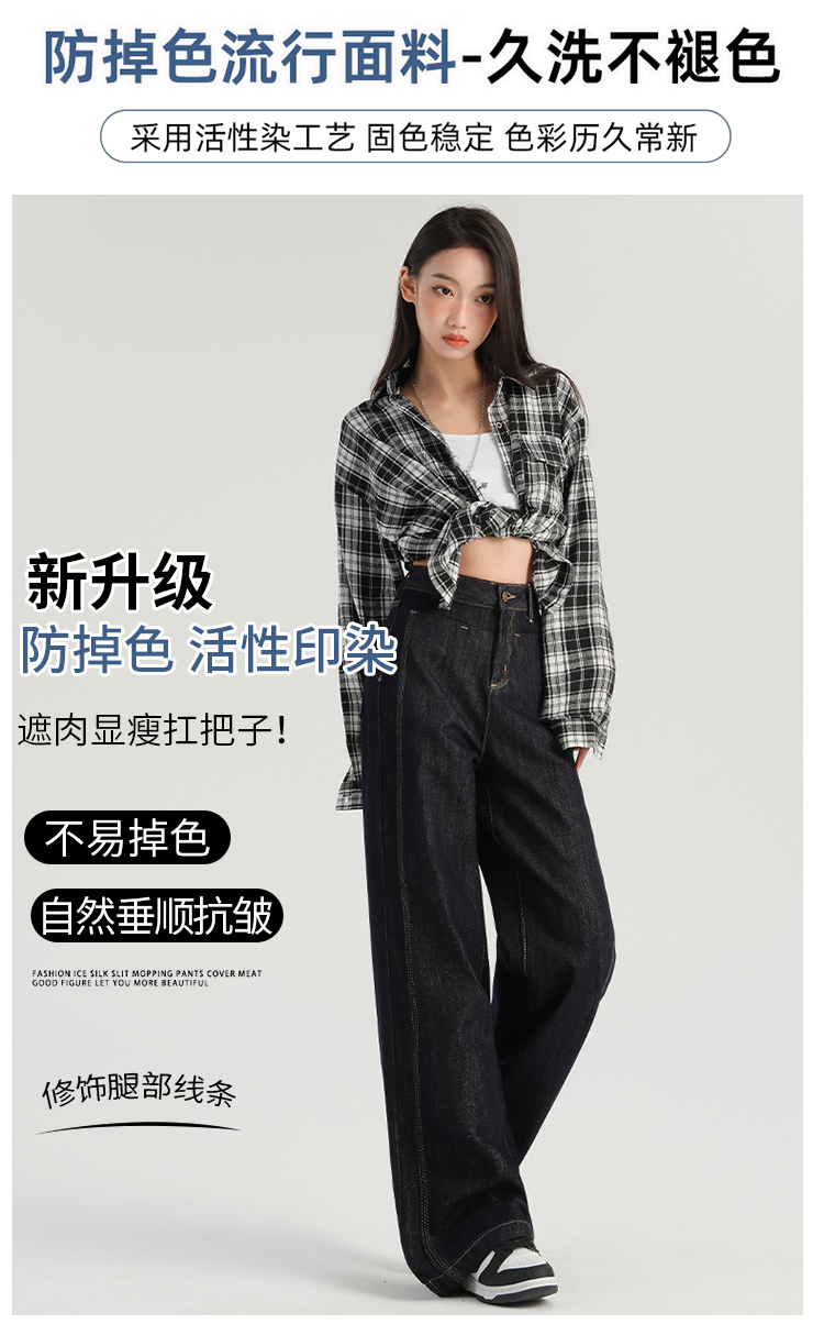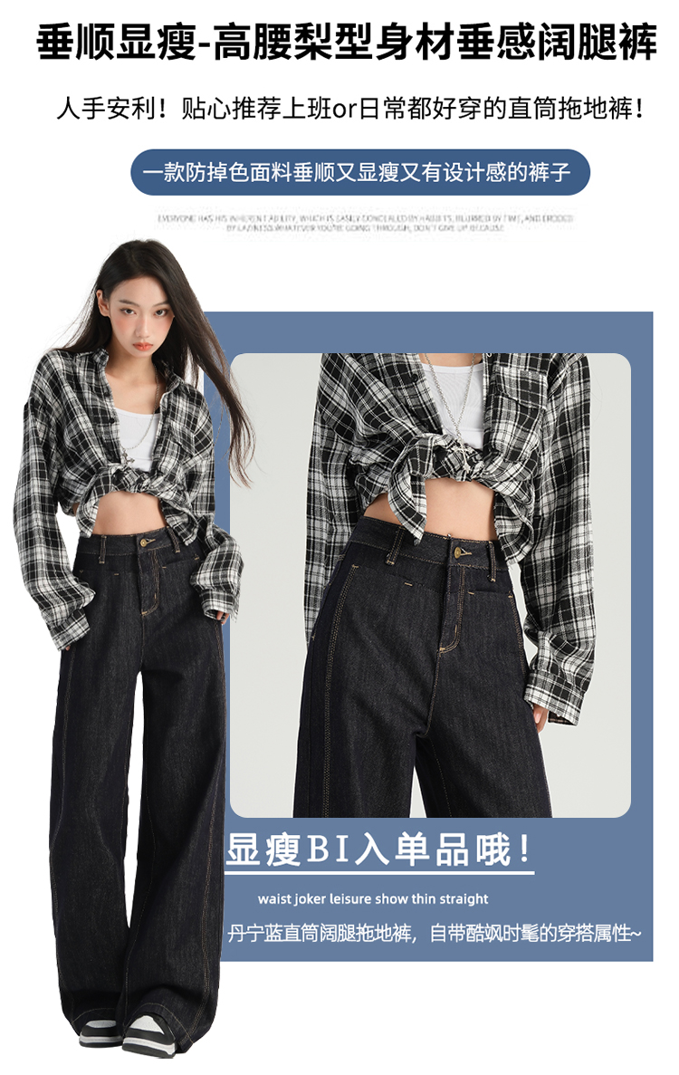 罗蒙春季女式牛仔裤高腰直筒宽松显瘦牛仔裤棉质水洗休闲百搭女长裤阔腿裤女