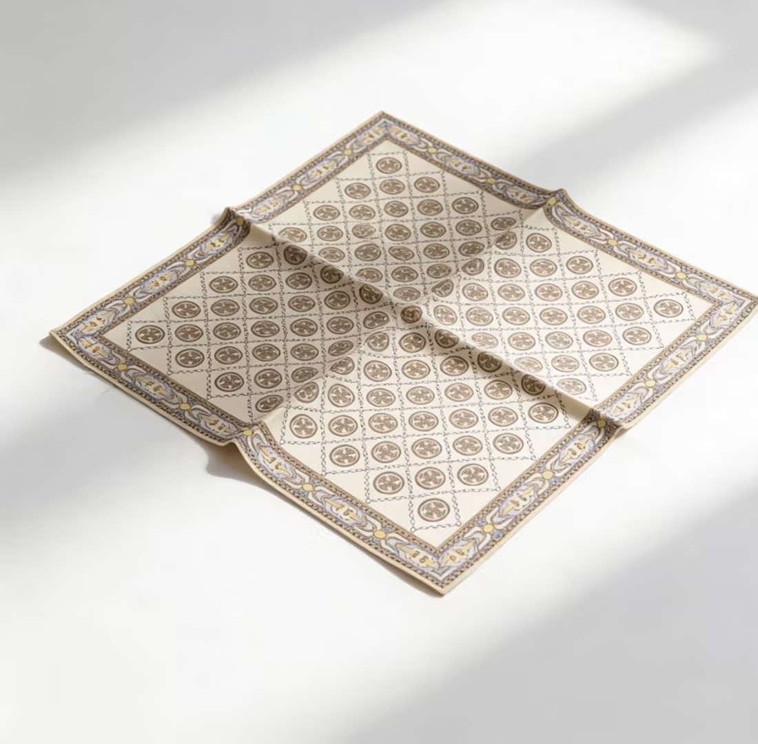 这款方巾是Tory Burch的经典配饰,采用100%桑蚕丝材质,以米白色为底色,印有品牌标志性的双T Logo与链条图案,边缘饰有精致的几何花纹边框。它可作为颈间装饰、包袋绑带或头巾使用,兼具优雅与实用性,适配日常通勤、休闲约会等多种场景。