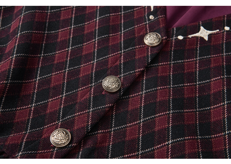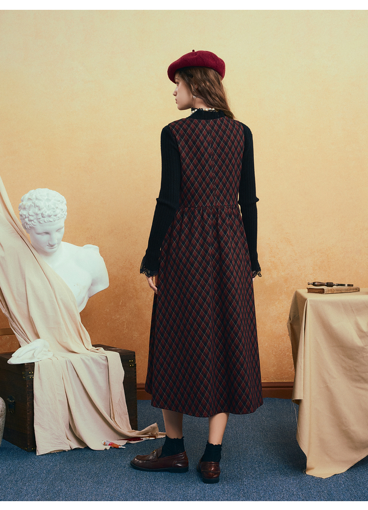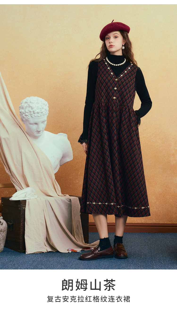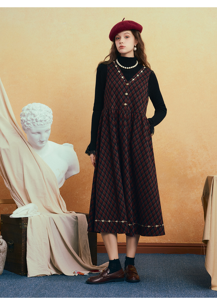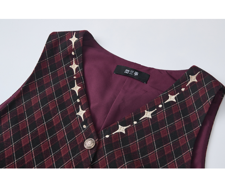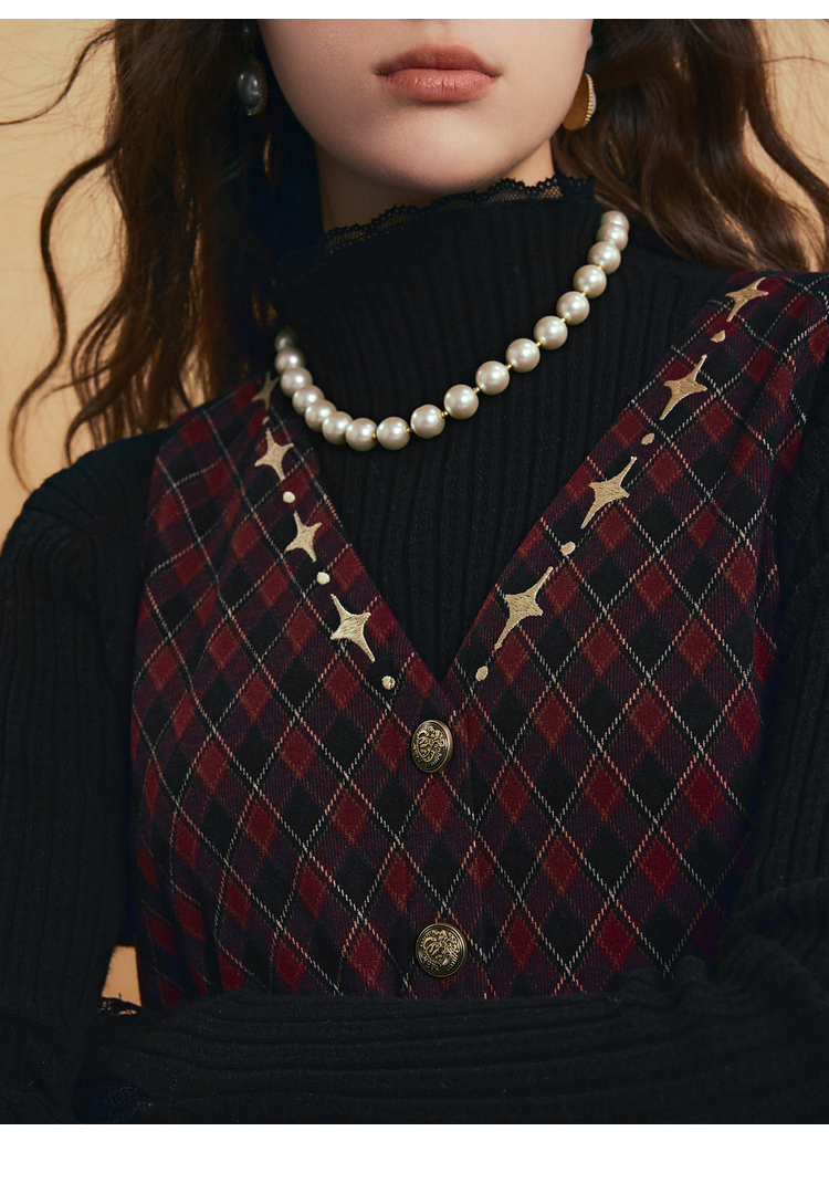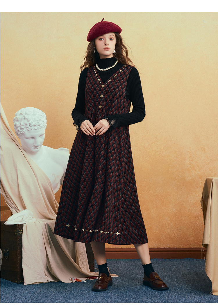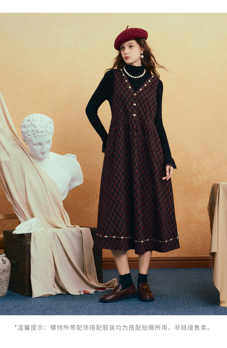 两三事 朗姆山茶 2025冬季新款复古星星刺绣格子背心裙连衣裙