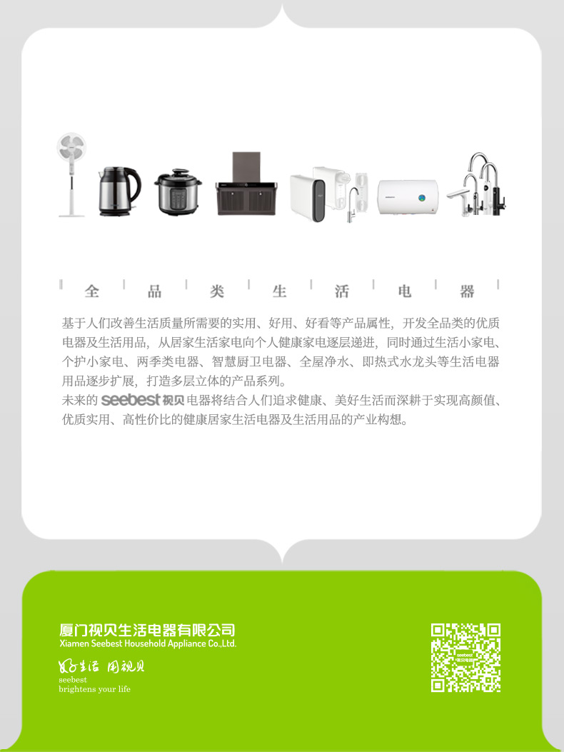 厦门视贝科技有限公司是集产品自主设计,研发,生产,销售于一体的高科技企业。拥有80000平方米的制造厂房,核心员工2000多人。产品线涵盖照明、电工,卫浴,线路,集成风暖等领域。