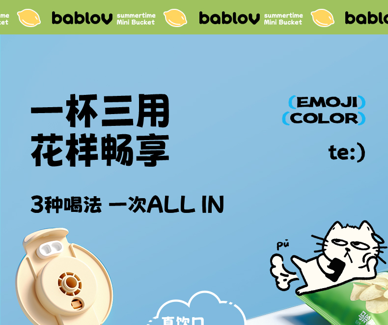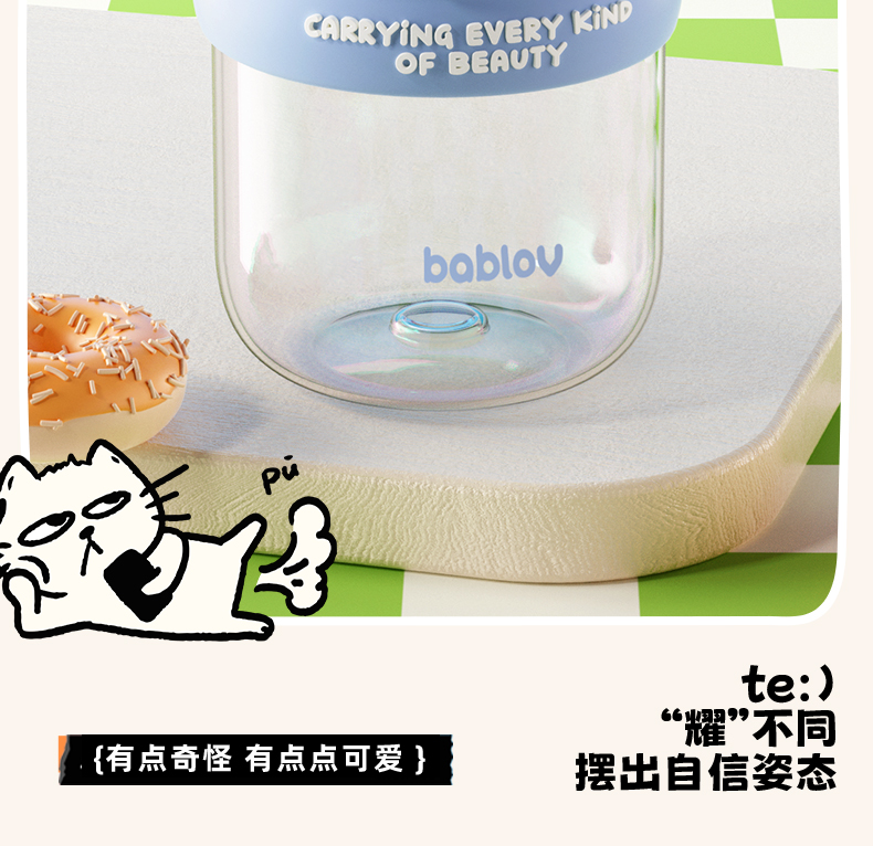 - BABLOV关注中国人的饮水健康,更不断探索未知可能性,专注于新生代自我个性表达,创造玩味新潮的产品体系。希望将水杯带入Z世代年轻人的生活,传递更多“饮”响力。