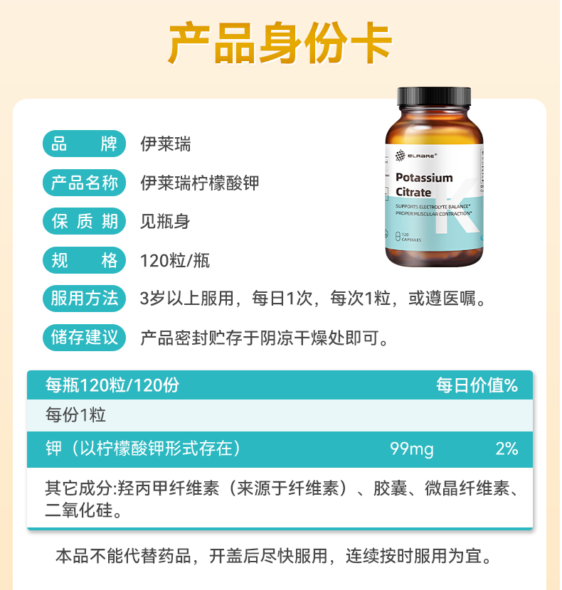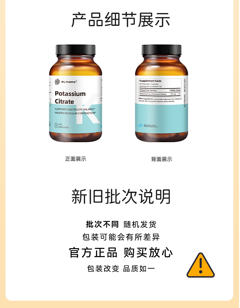 海淘 ELRARE 伊莱瑞 Potassium Citrate 柠檬酸钾 电解质 钾元素胶囊 120粒/瓶 27.03