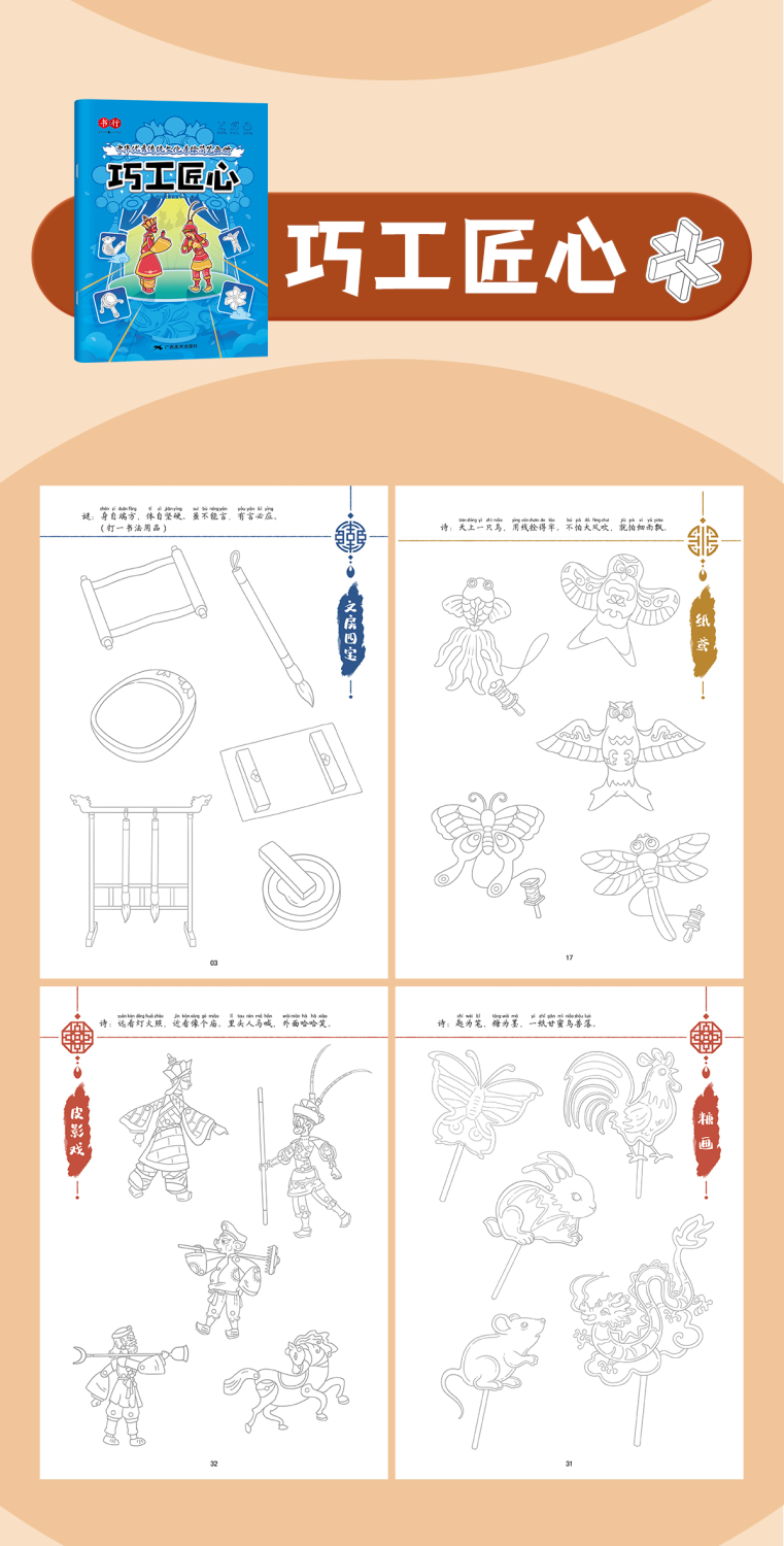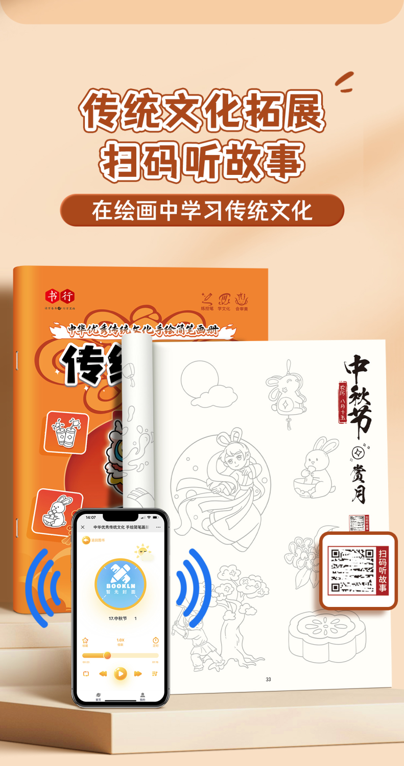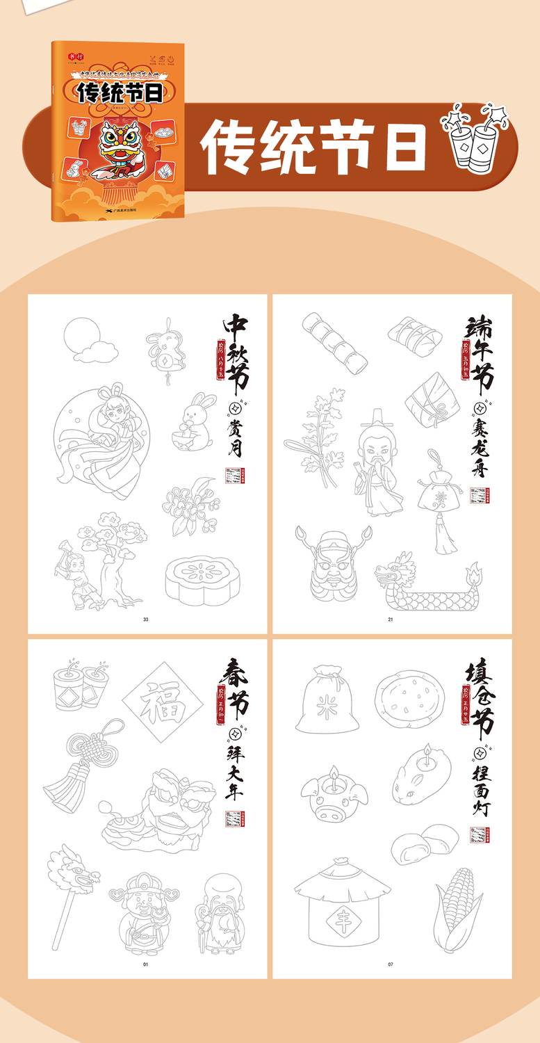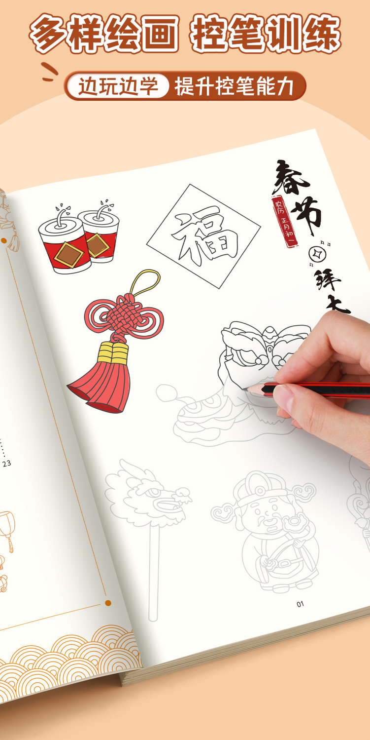 中华优秀传统文化手绘简笔画册儿童涂鸦书填色本控笔训练美术教程