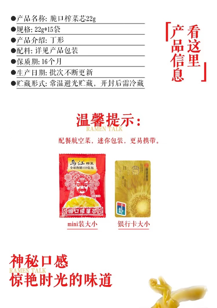 重庆特产【乌江涪陵榨菜脆口榨菜芯22g*15袋】