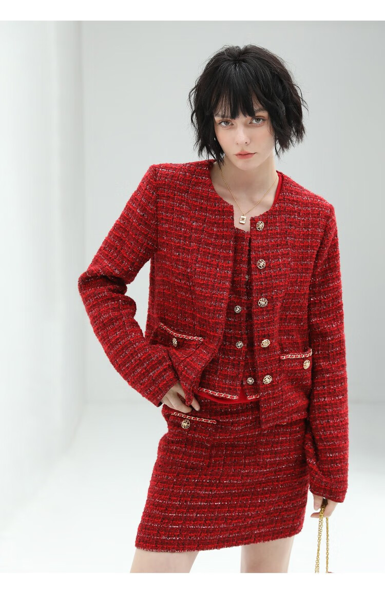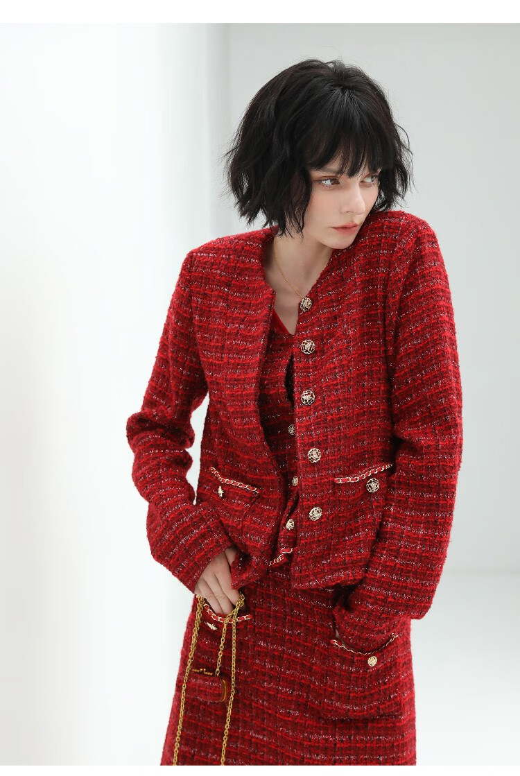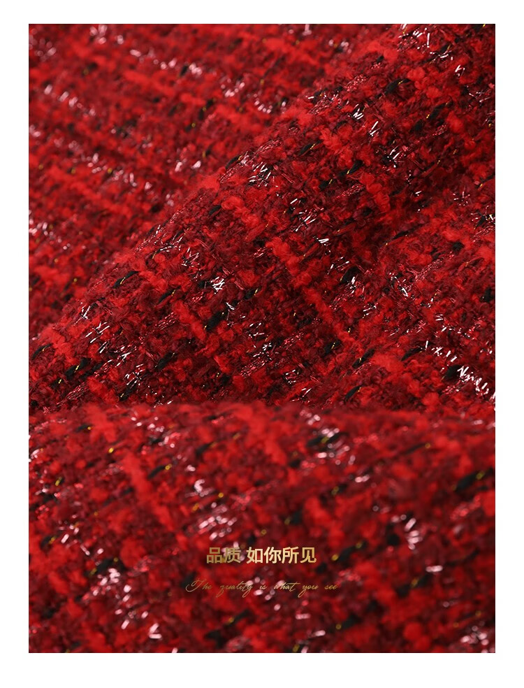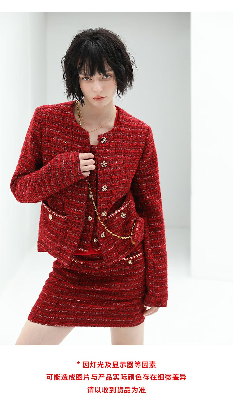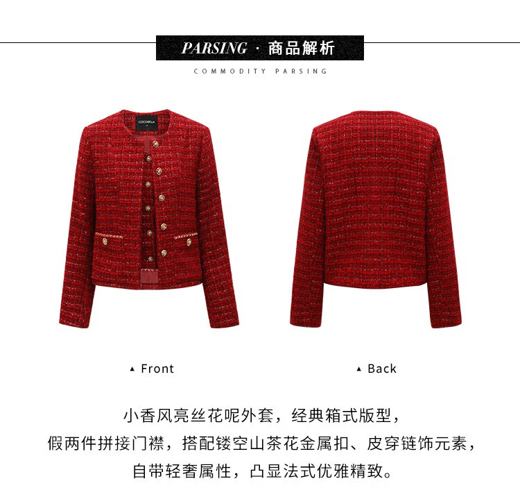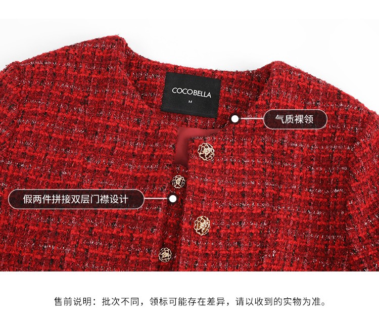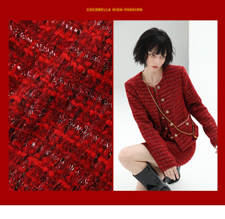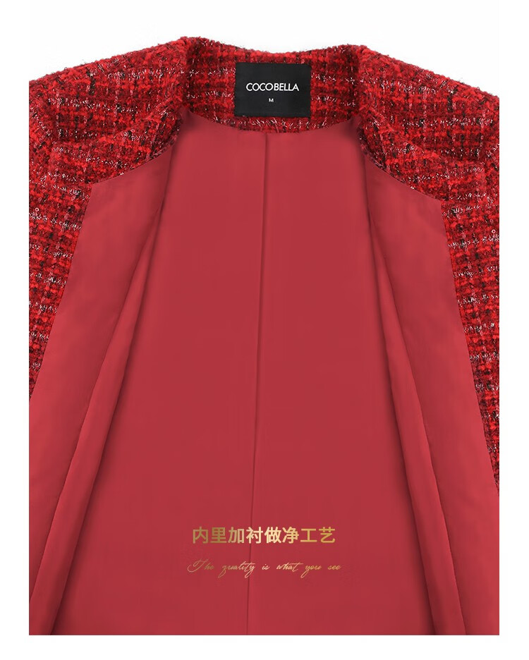 COCOBELLA假两件亮丝小香风花呢外套女精致裸领红色西装WL529