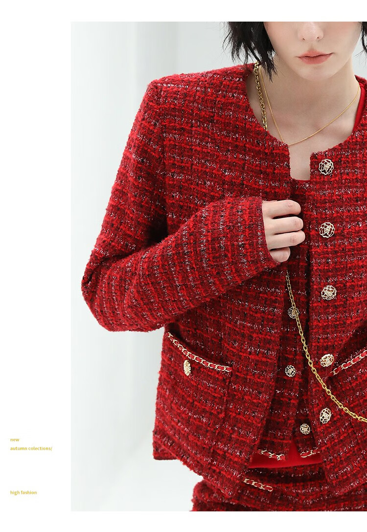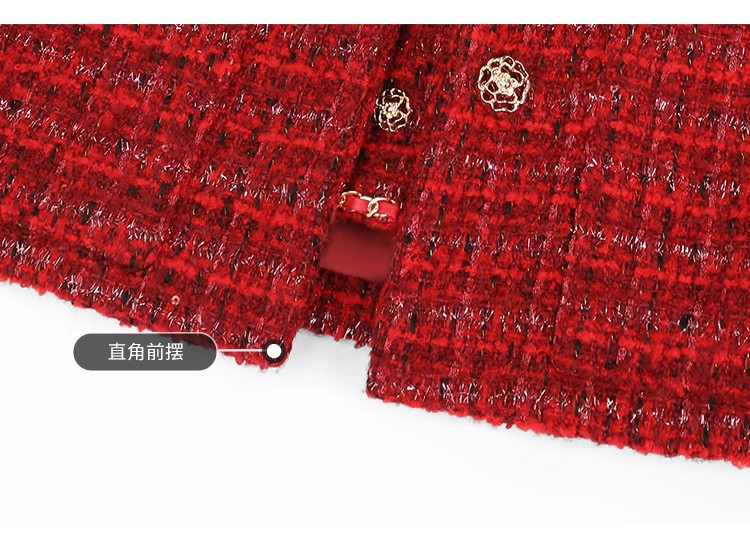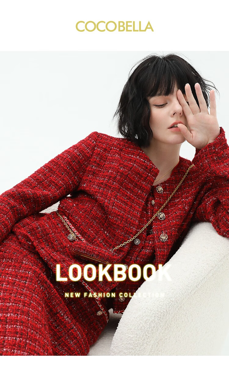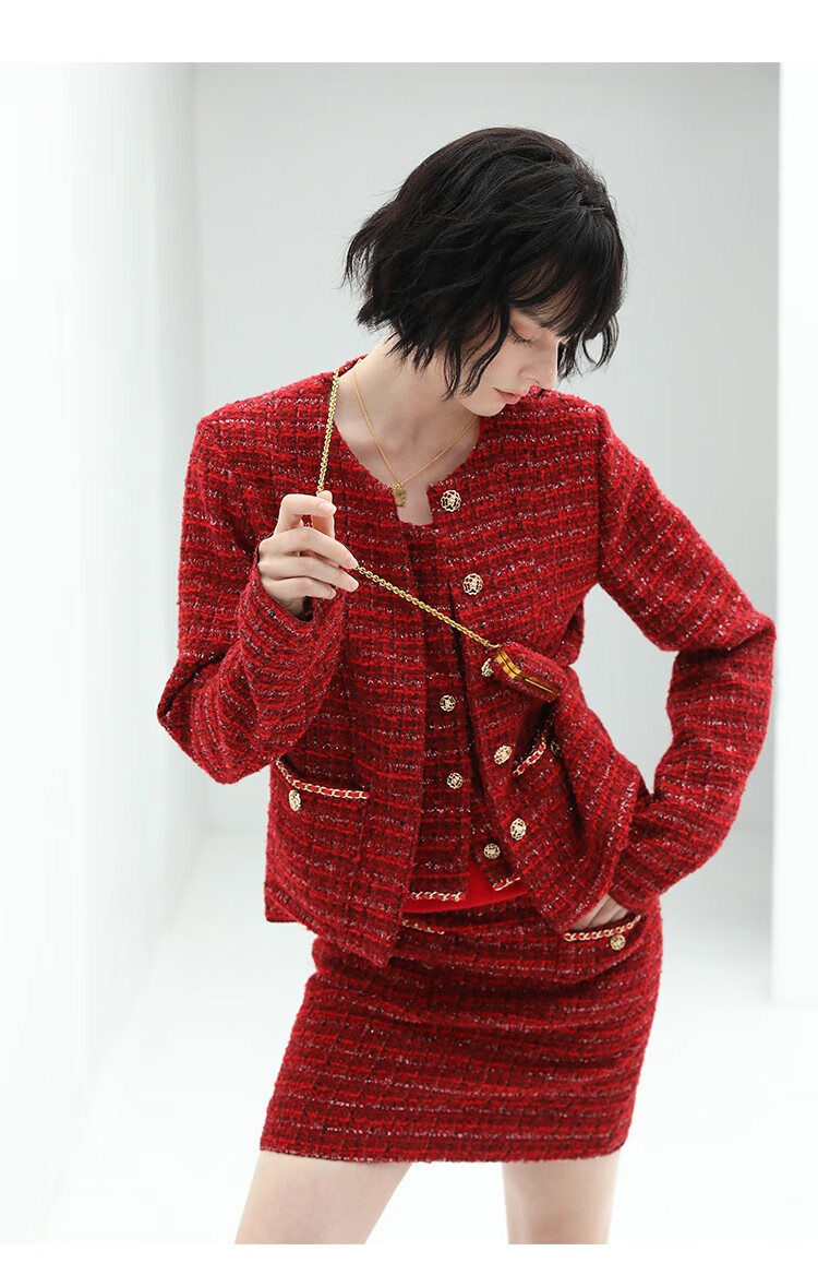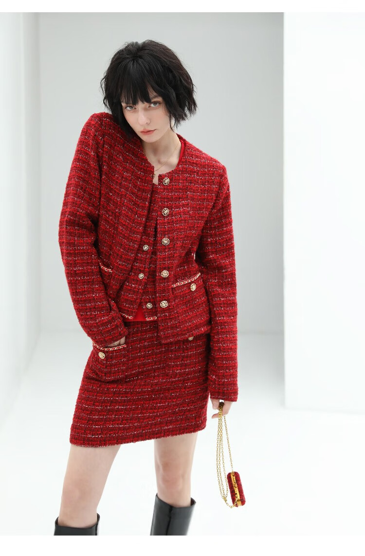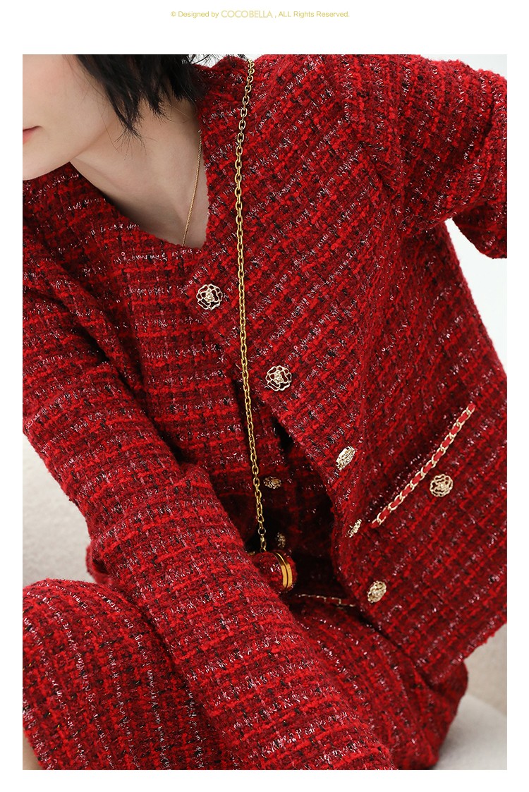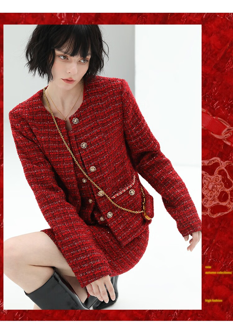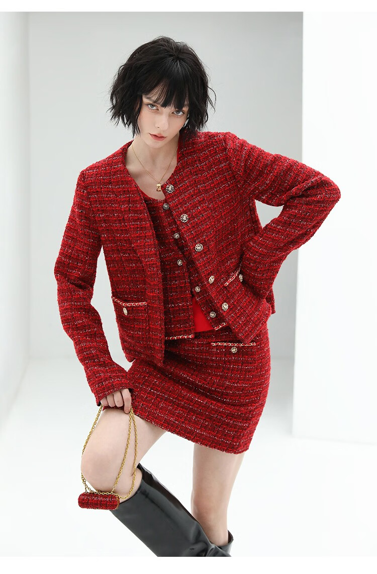 COCOBELLA假两件亮丝小香风花呢外套女精致裸领红色西装WL529