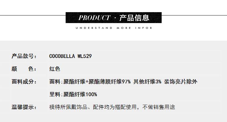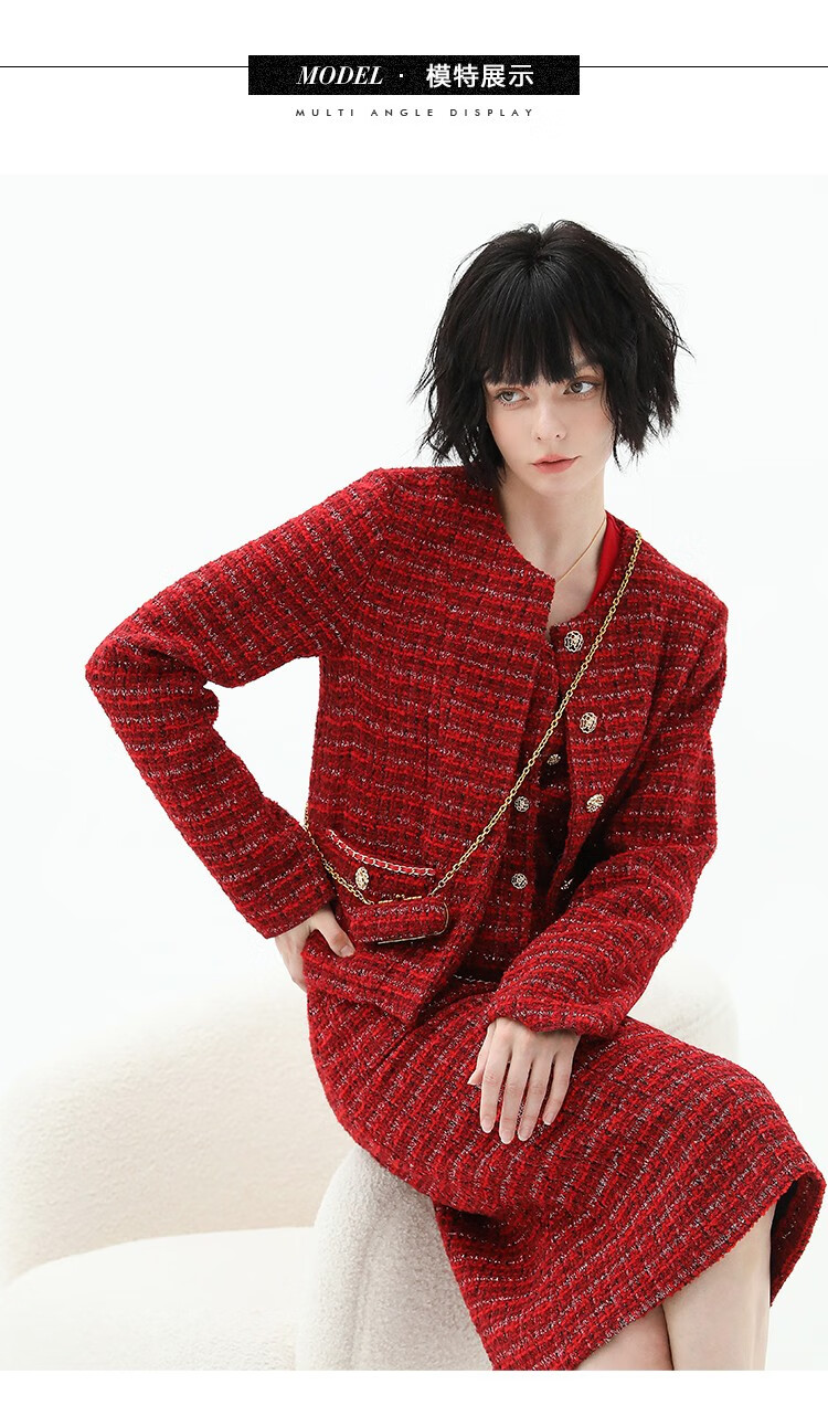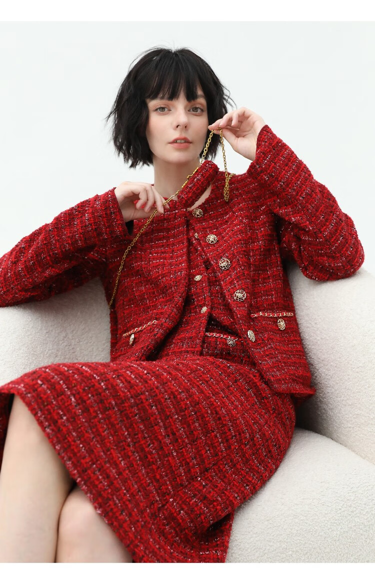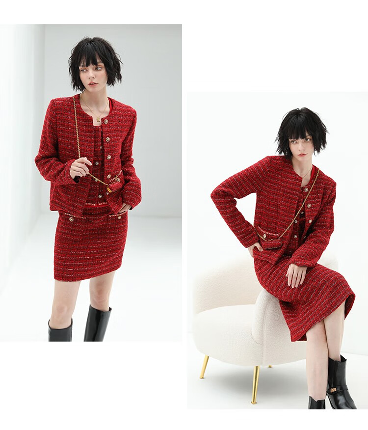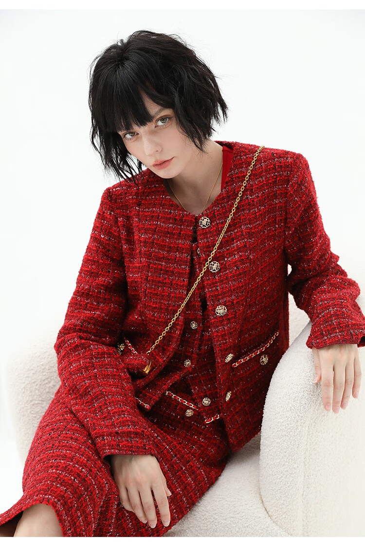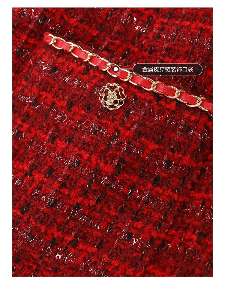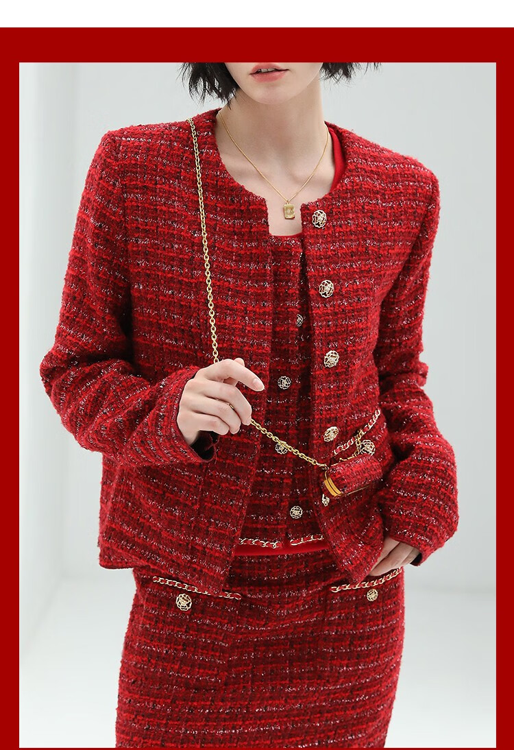 COCOBELLA假两件亮丝小香风花呢外套女精致裸领红色西装WL529