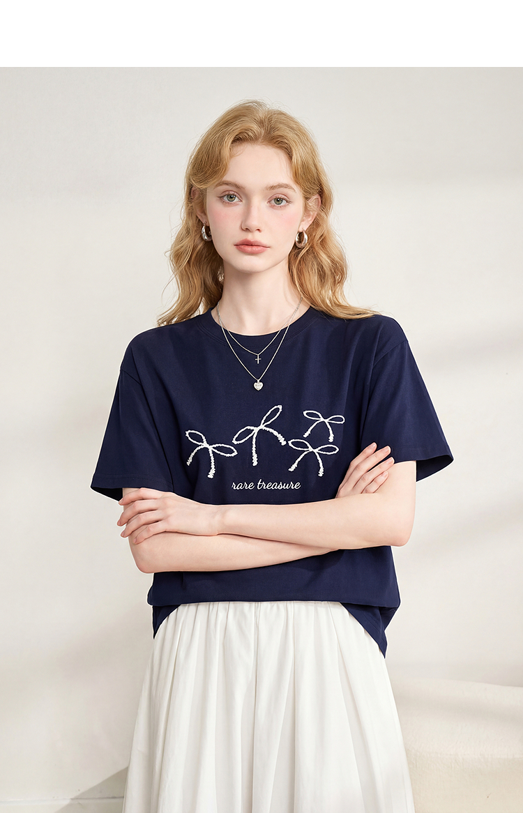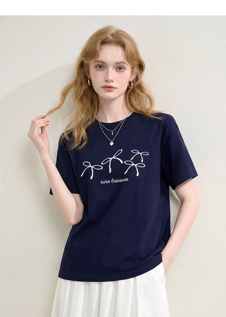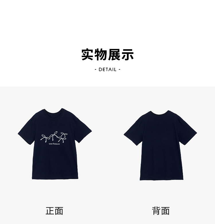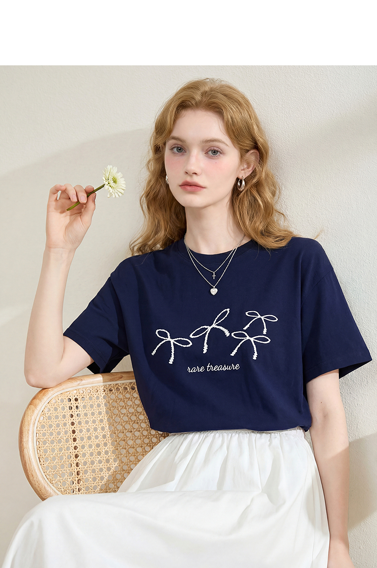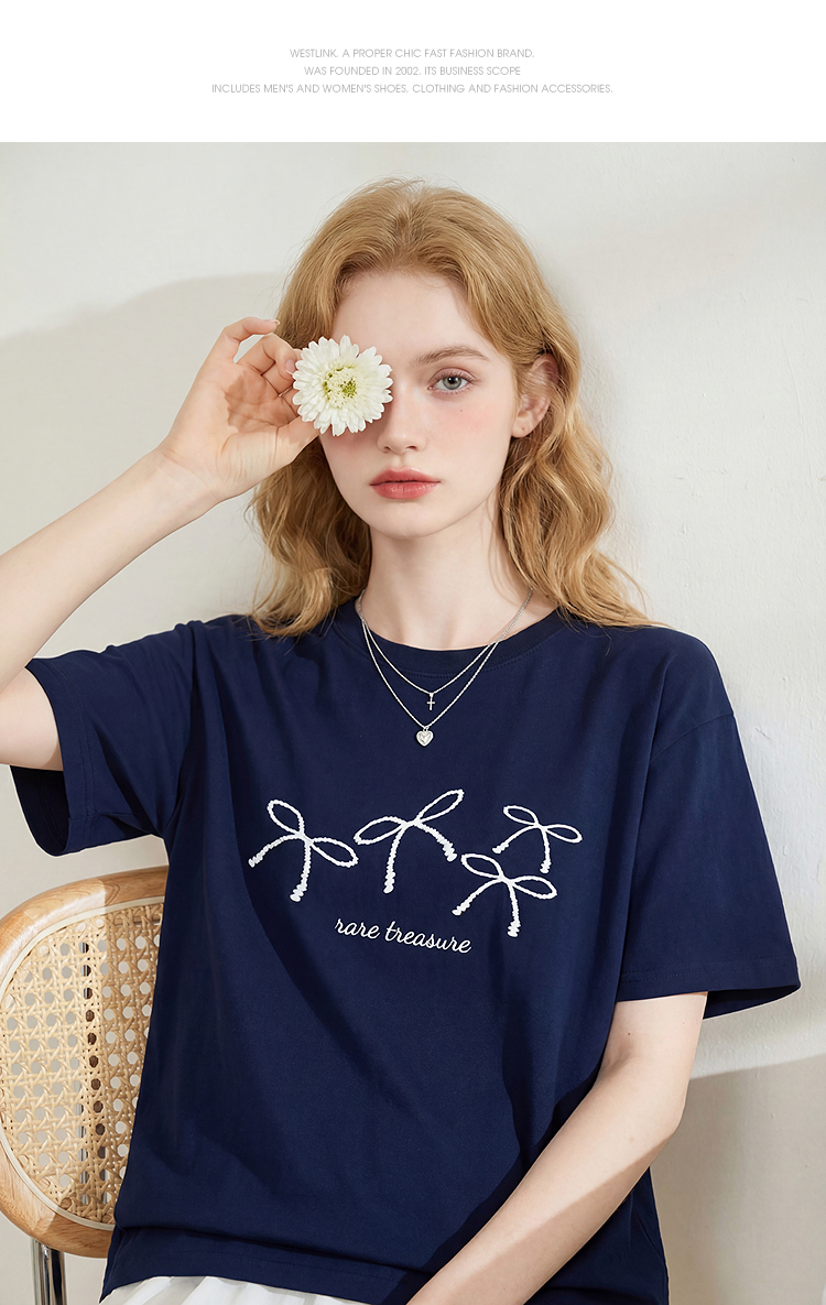 西遇2026夏季新款蝴蝶结印花短袖T恤女圆领正肩宽松显瘦百搭上衣E0060196