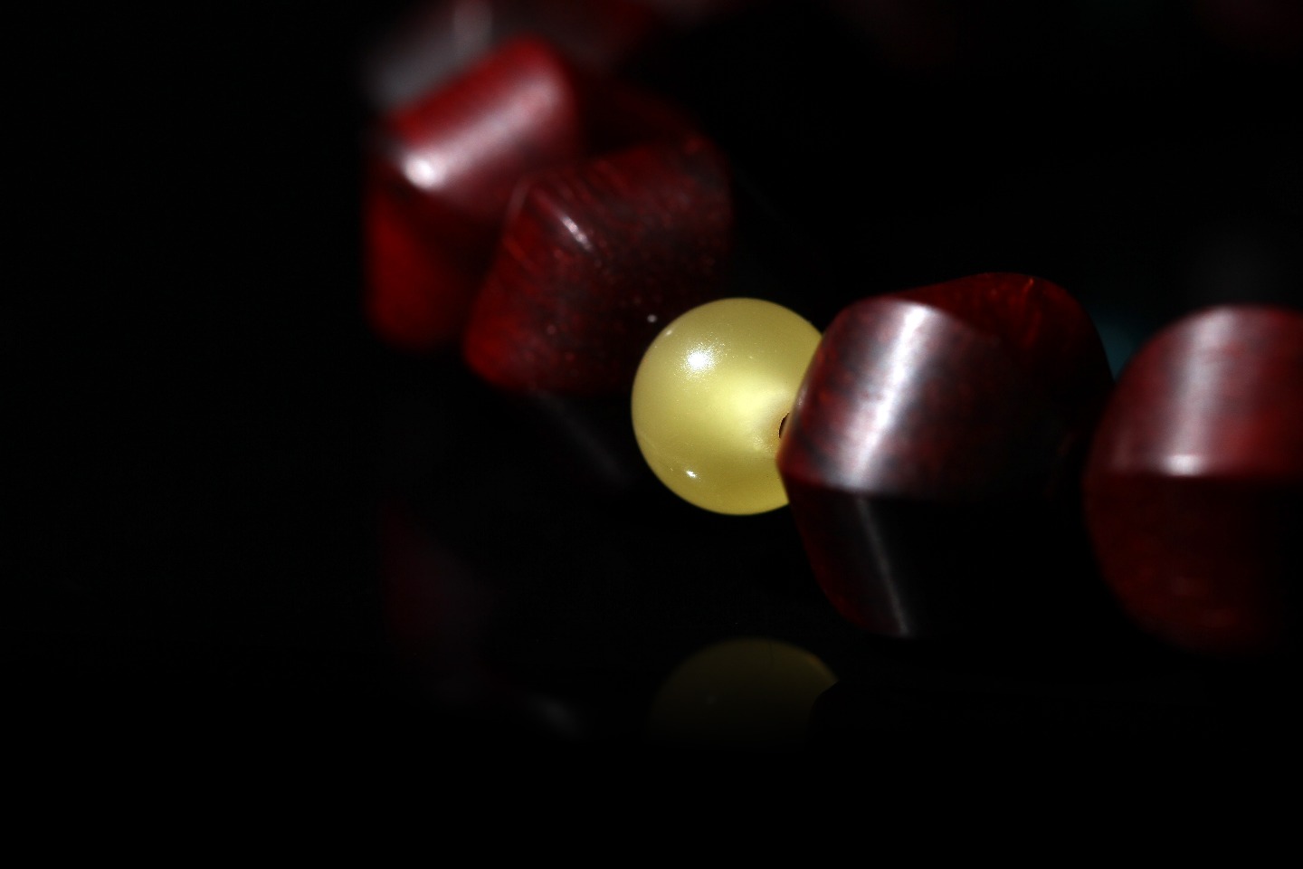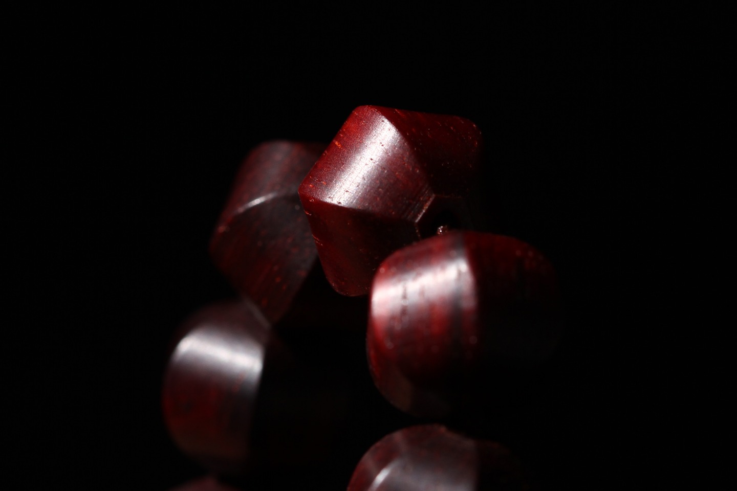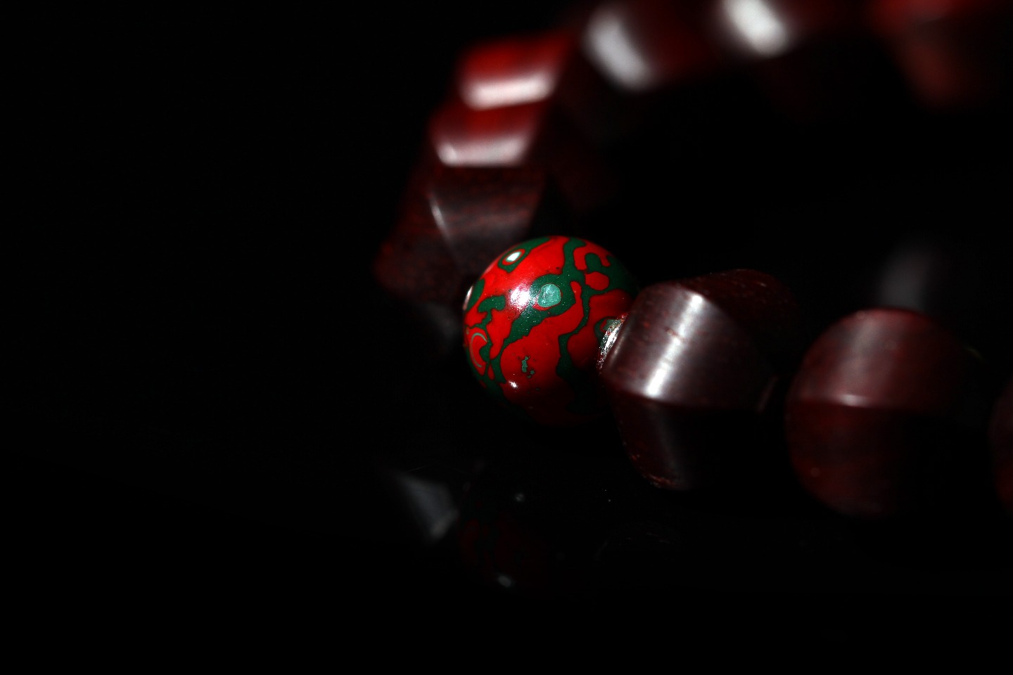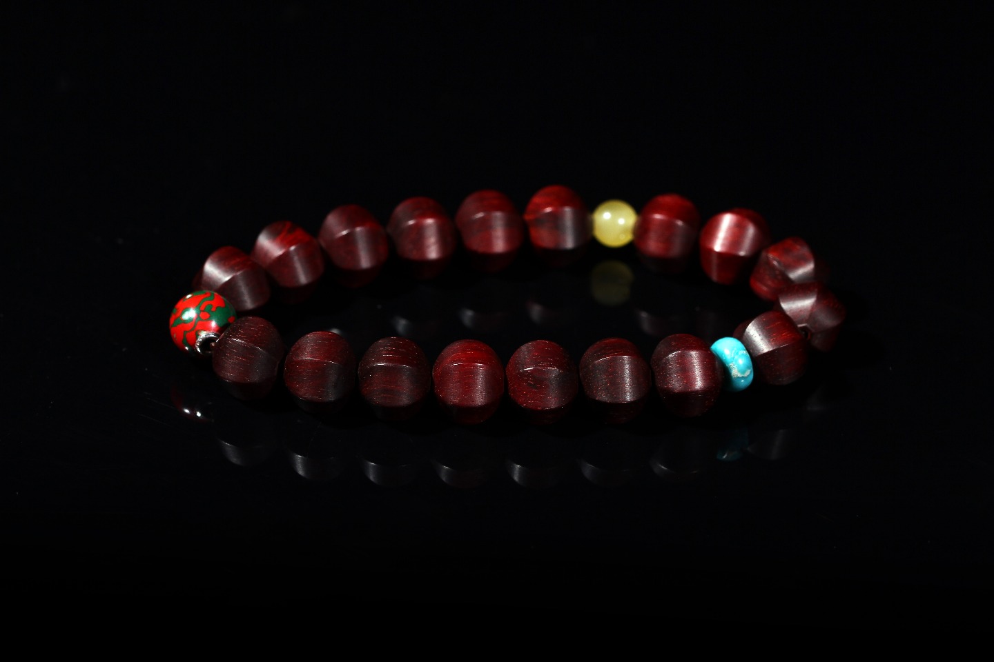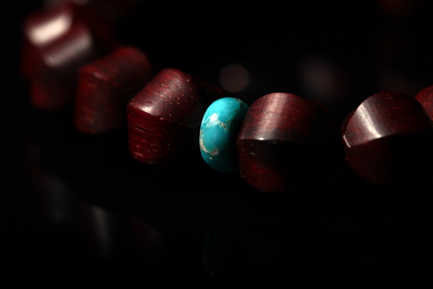 主珠以藏传一线药师珠为设计灵感,结合紫檀六棱型而制,中间嵌入极薄工艺打造的鹿角“一线”,线条笔直分明,光气十足,内部为传统直榫,银管镶嵌,饱满厚重,再现古朴株系的独特味道。药师珠为天珠旁系,象征诸佛众神护佑,吉祥如意,所求愿满。搭配非遗大漆珠,手工层层髹漆,质感温润,色彩天然,既充满现代个性,又不失传统厚重感。