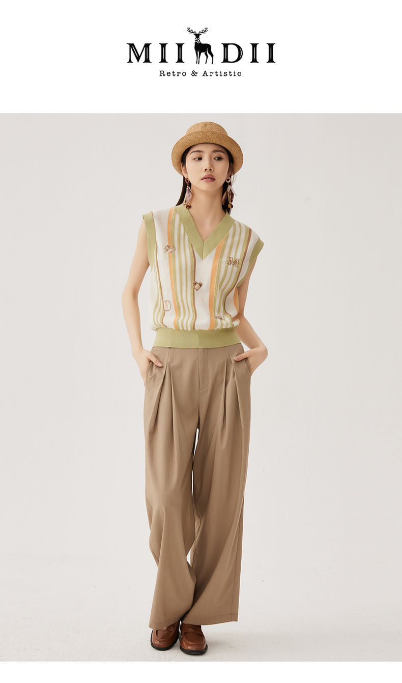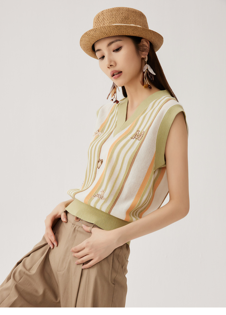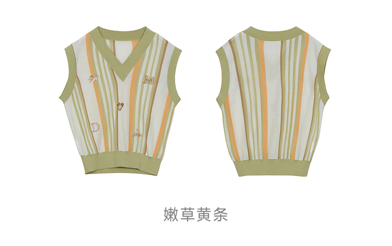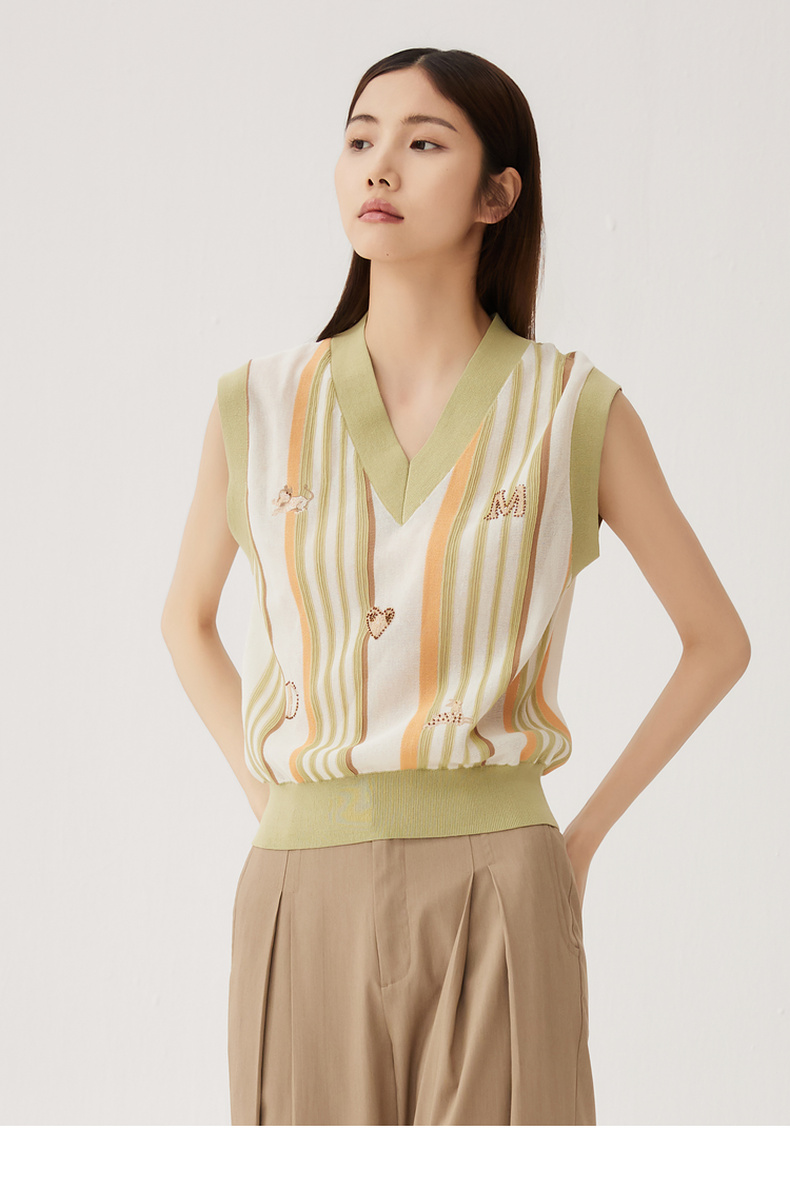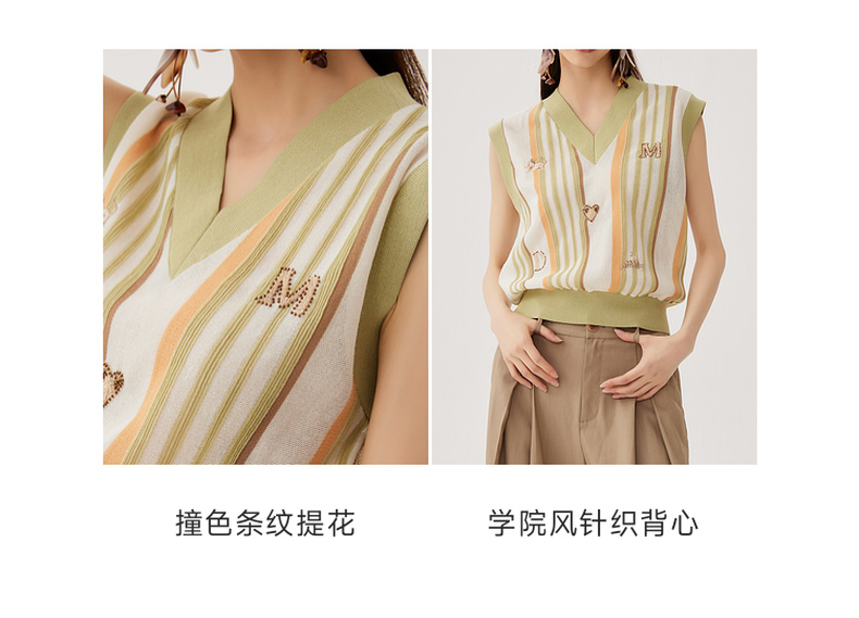 谜底针织马甲女2024秋新品文艺风彩条V领套头针织衫毛衫243MZ1260
