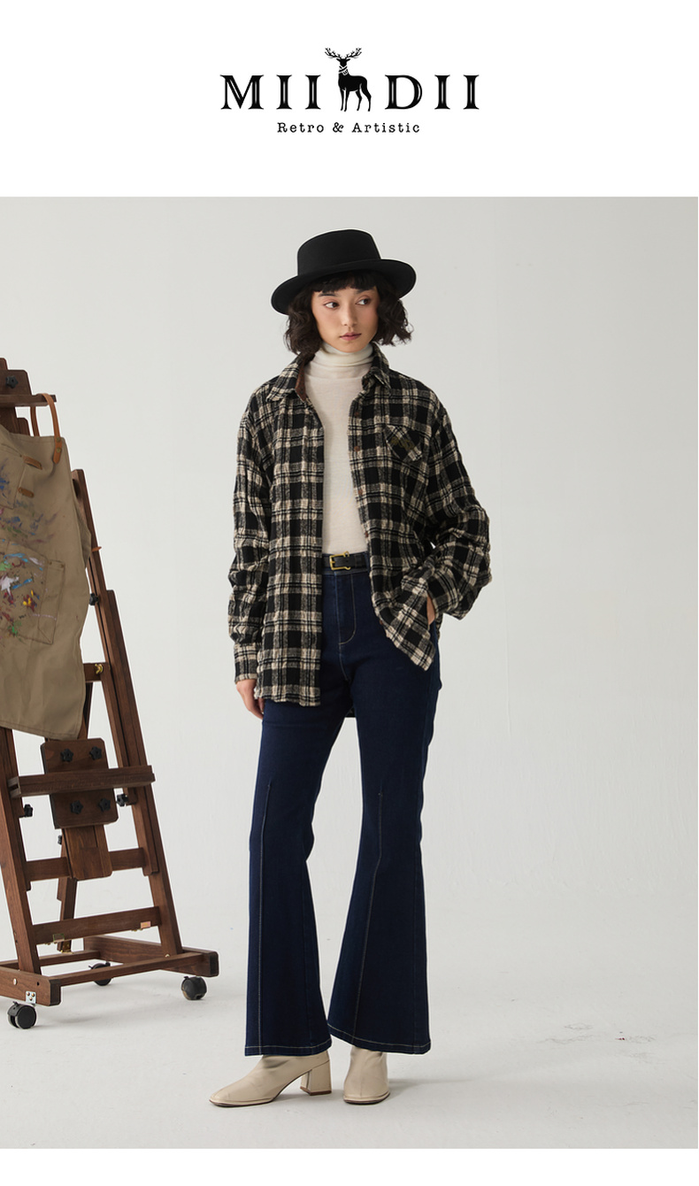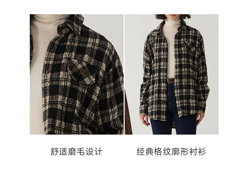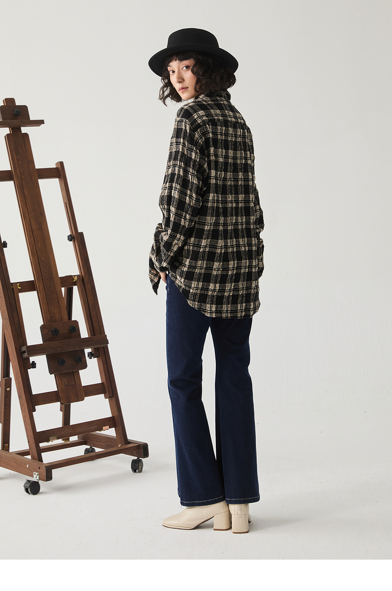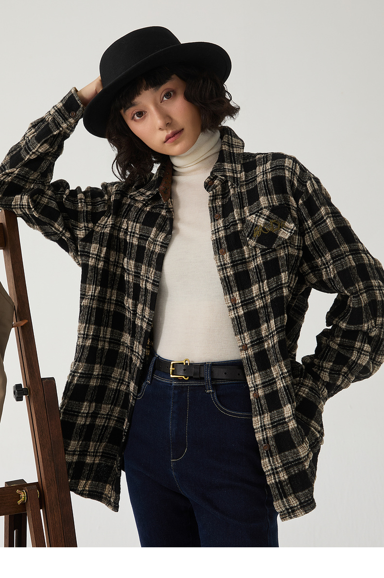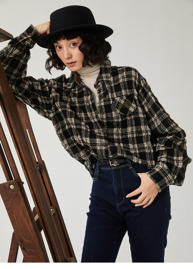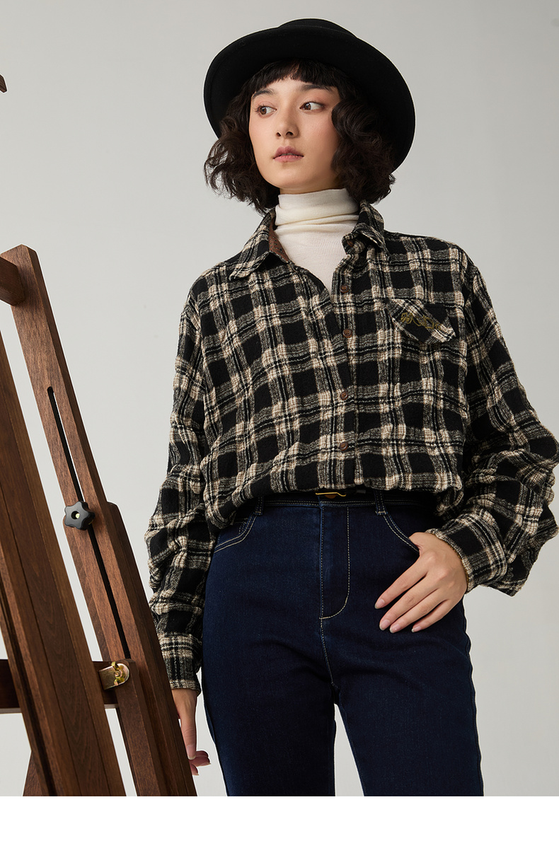 谜底黑白格子衬衫长袖女2024冬季新品宽松羊毛混纺衬衣244GC1484