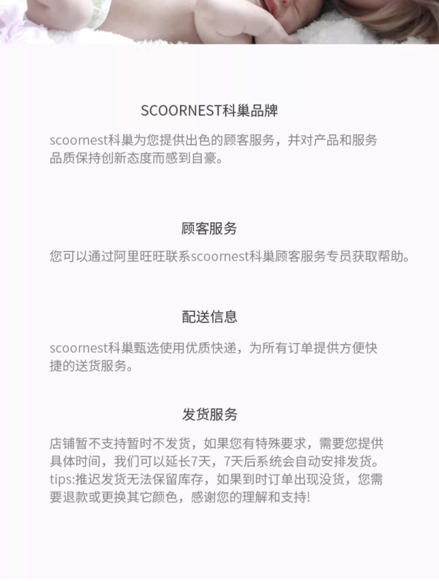 - Scoornest始终秉承给每一位宝宝送去科学的、关心的、创新的成长体验,通过提供商品和服务,使顾客形成守护、发展、巩固这种弥足珍贵的亲情的爱。