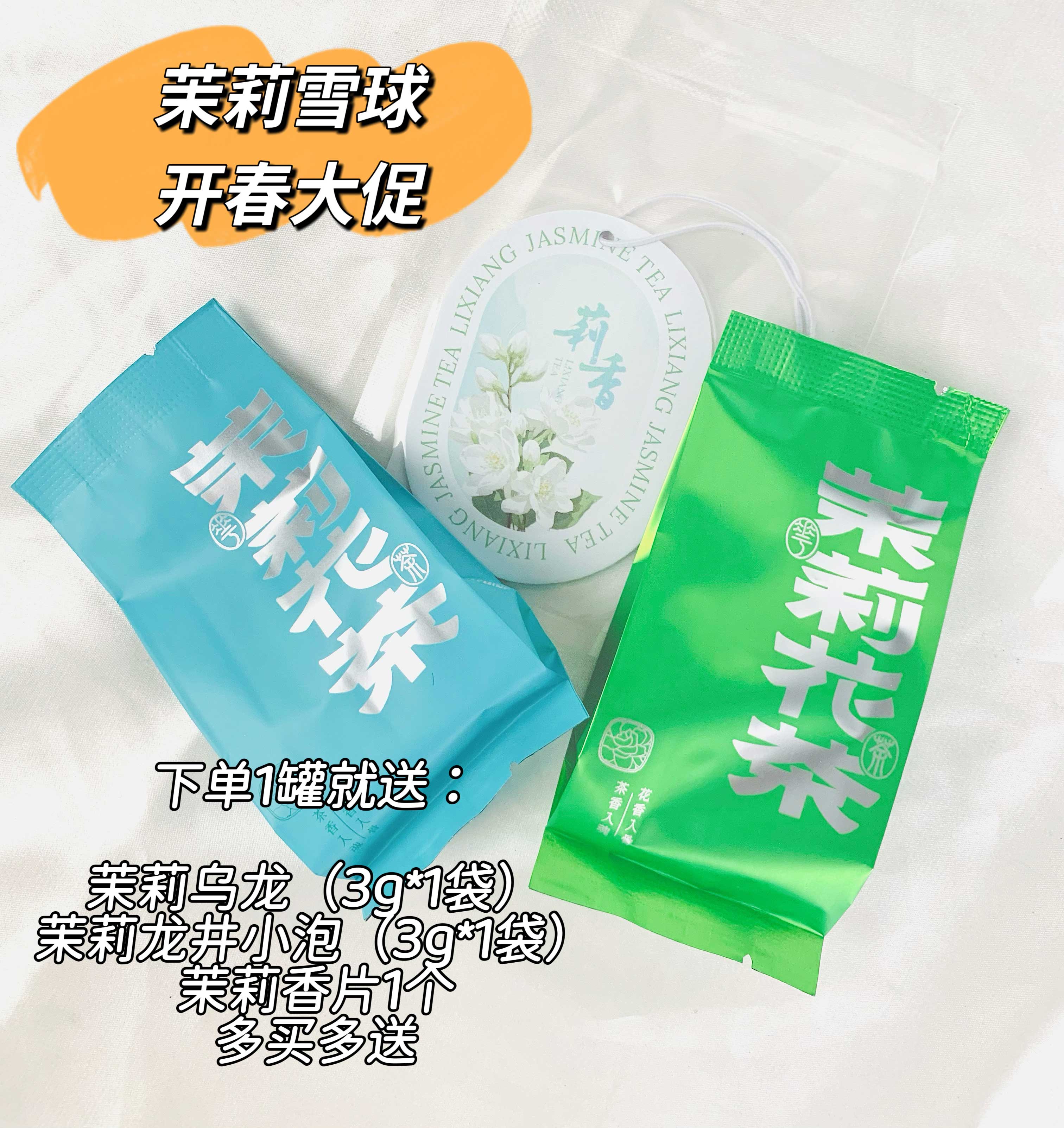 3月31日前下单1罐送茉莉乌龙(3g*1袋)+茉莉龙井小泡(3g*1袋)+茉莉香片1个;多买多送!