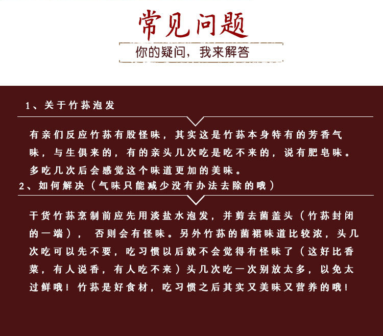 每一道工序都充满了农民的质朴,没有任何防腐剂 添加剂,纯天然方式晒干,最大程度上保留竹荪本身的味道和营养......