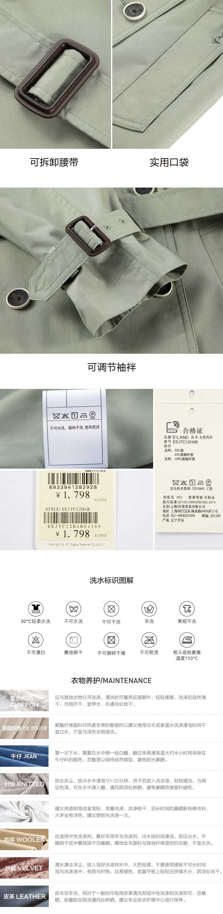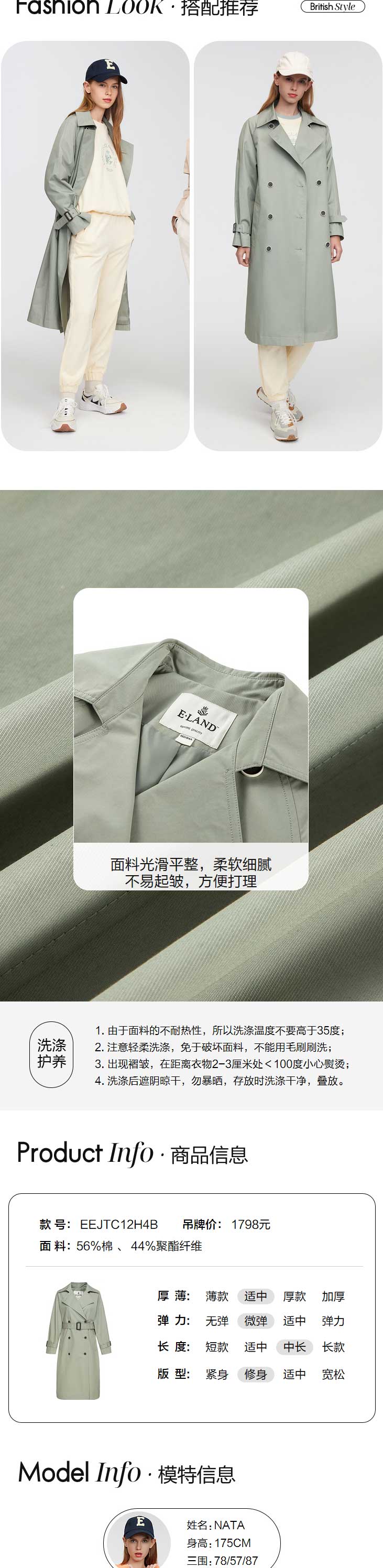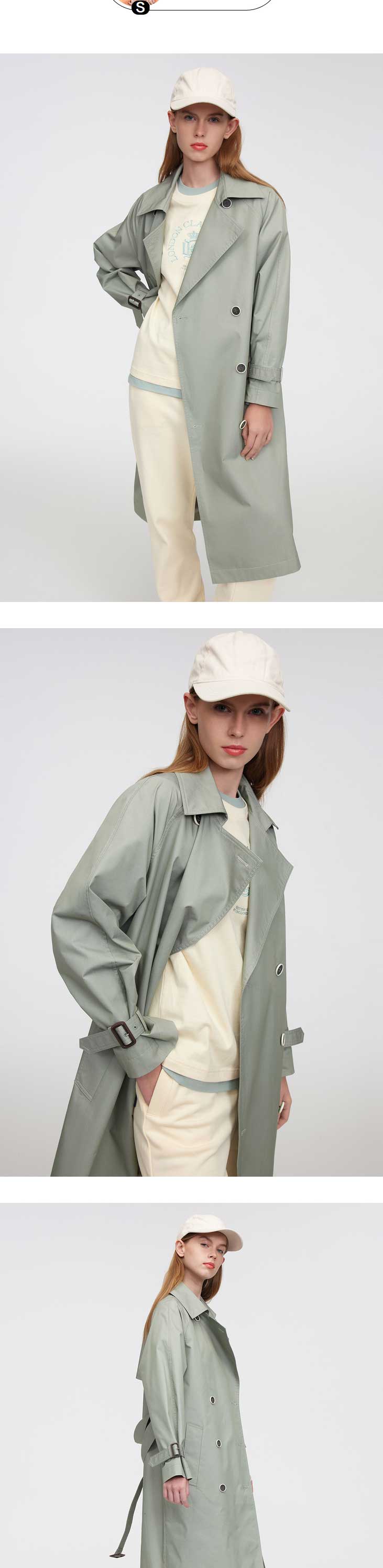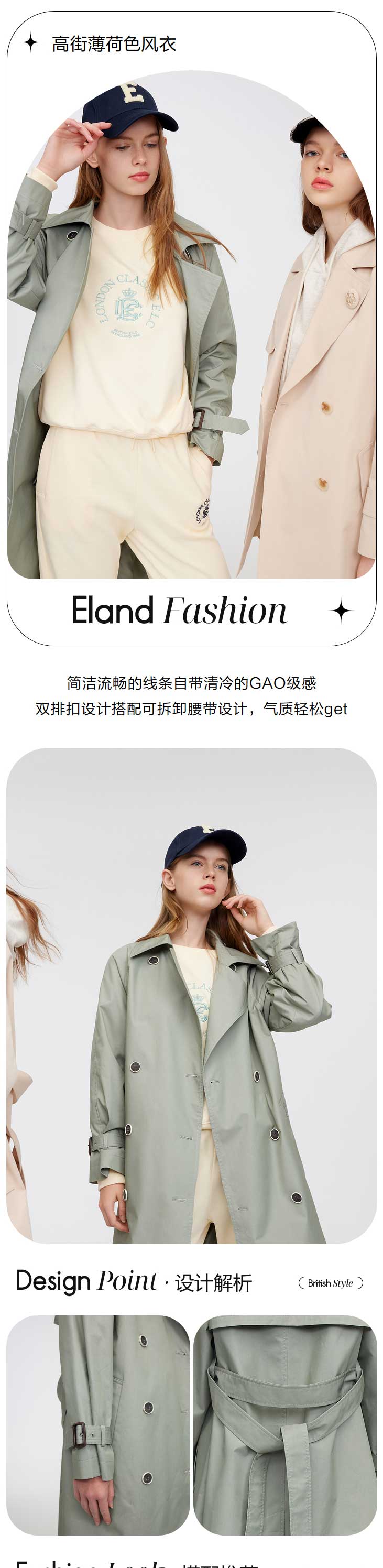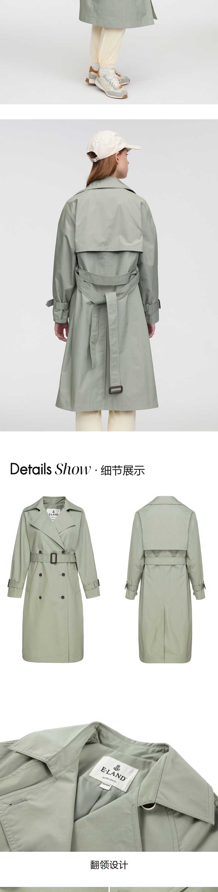 ELAND衣恋2022年春季新款气质薄荷色翻领双排扣可拆腰带风衣女EEJTC12H4B