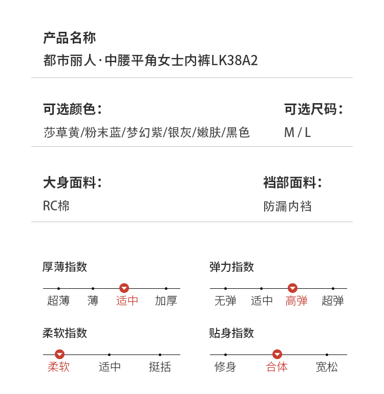 都市丽人功能系列高弹棉平角裤女士内裤中腰平角裤LK38A2