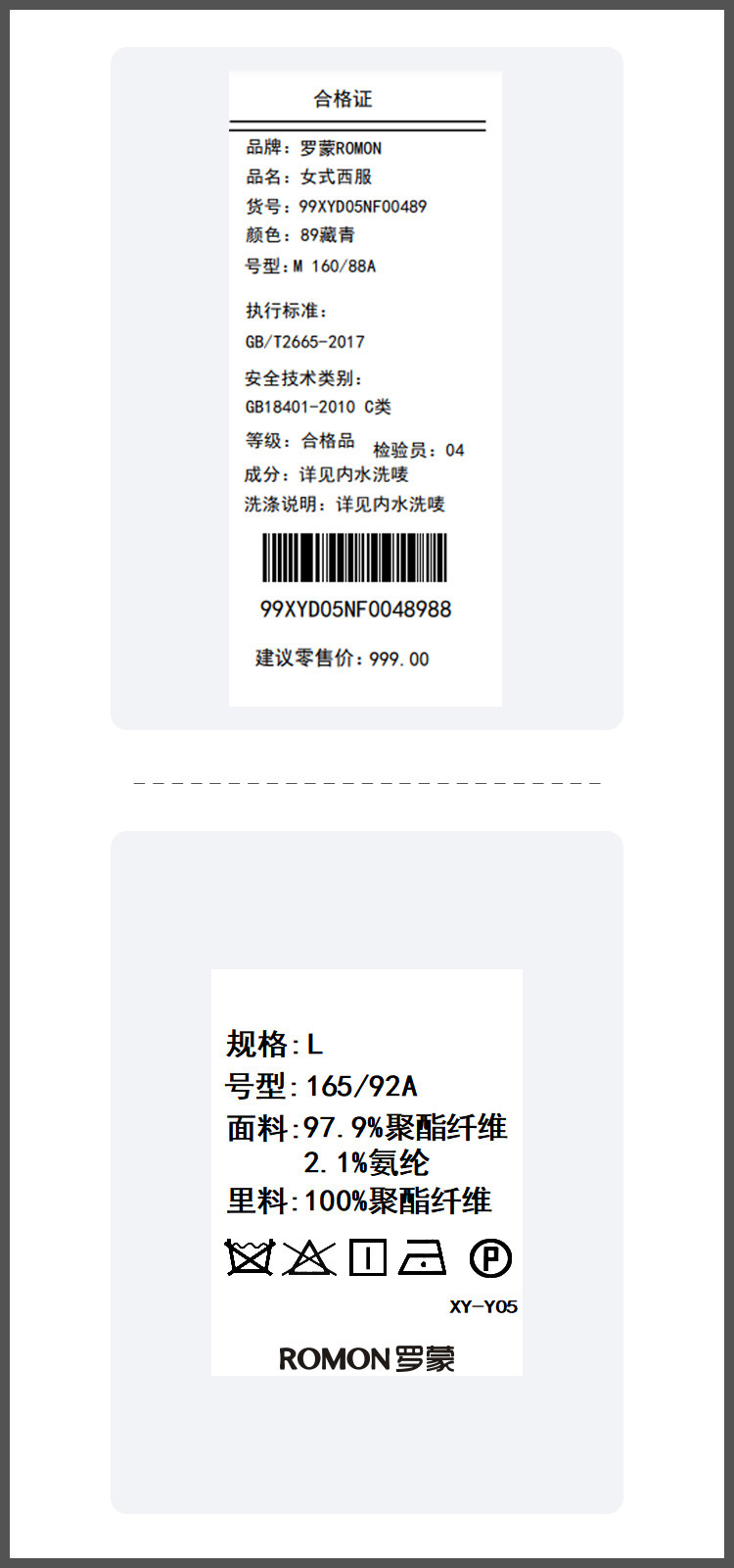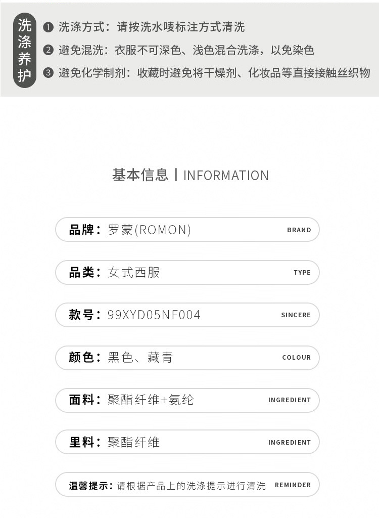 面料成分: 97.9%聚酯纤维 2.1%氨纶 里料成分:100%聚酯纤维