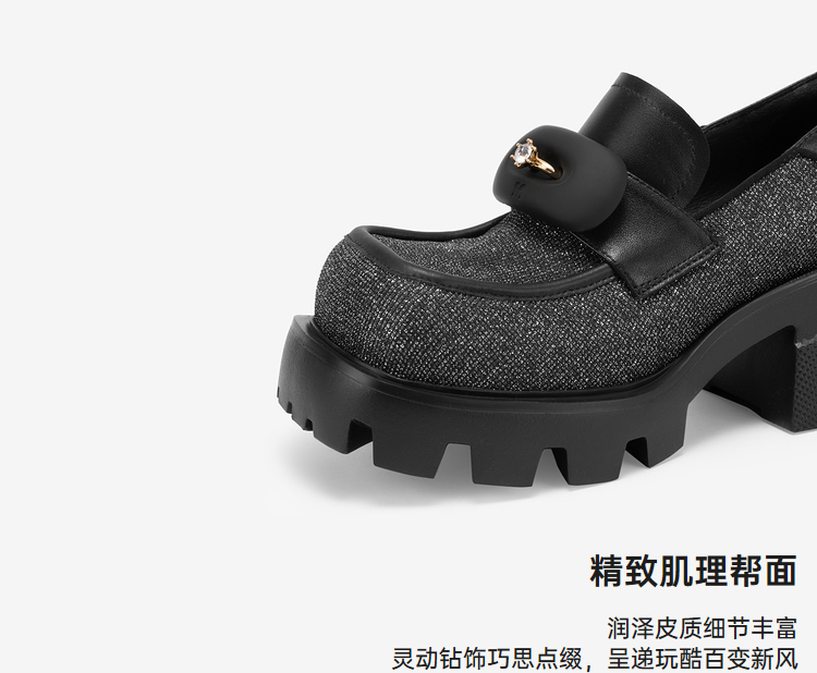 千百度经典羊皮乐福鞋女中跟通勤正装方头深口单鞋A25466106