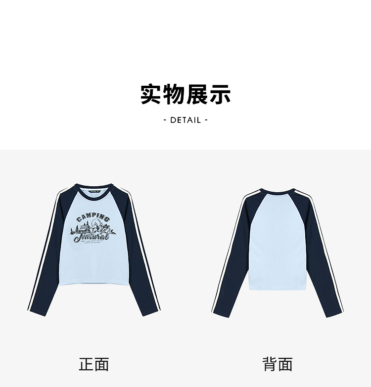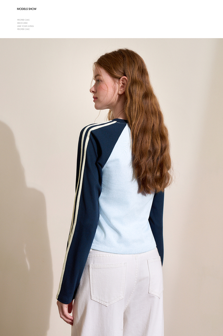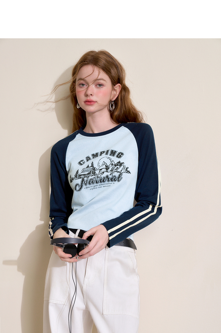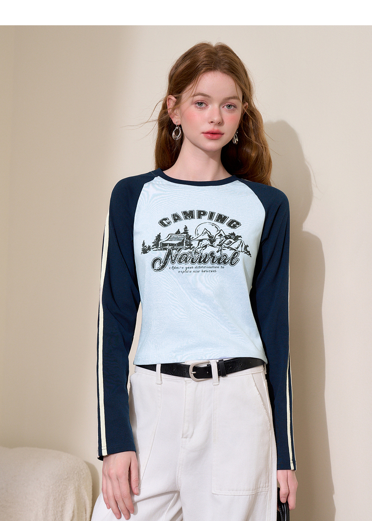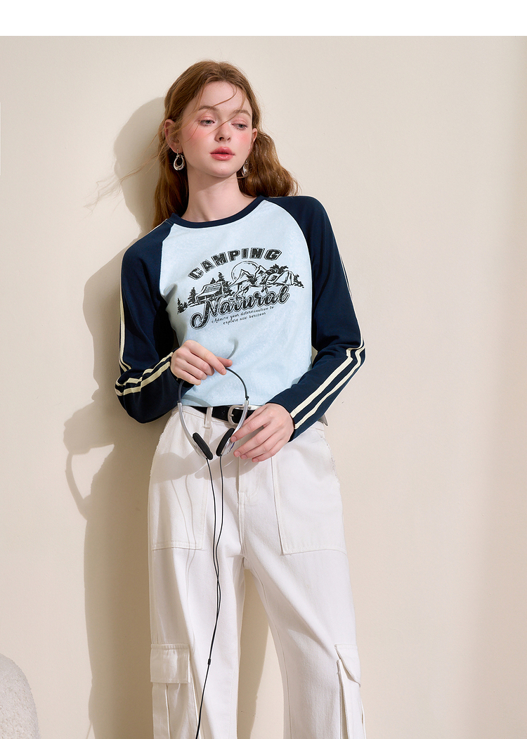 美式复古休闲运动风条纹撞色印花长袖T恤女早春修身上衣V4443595