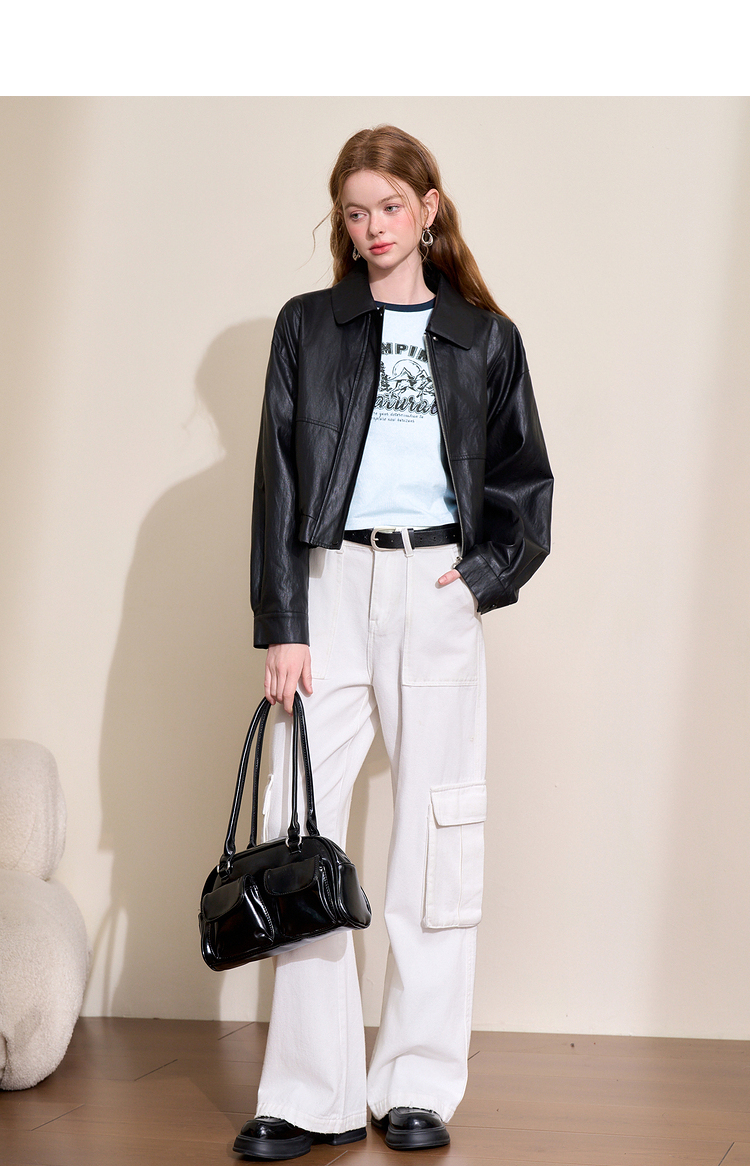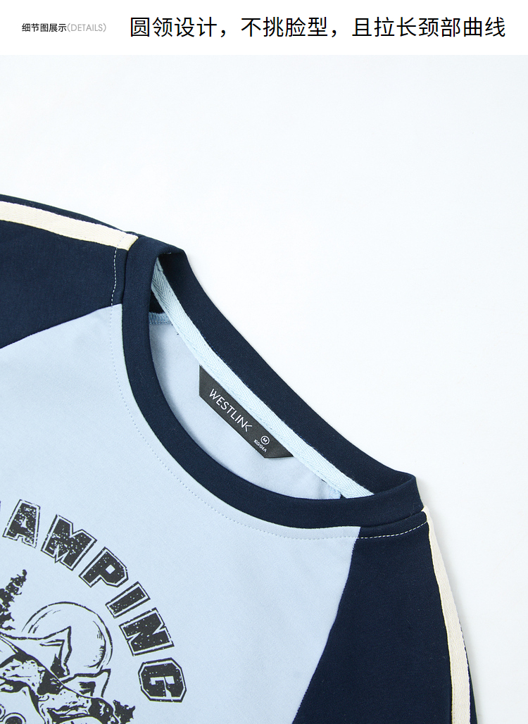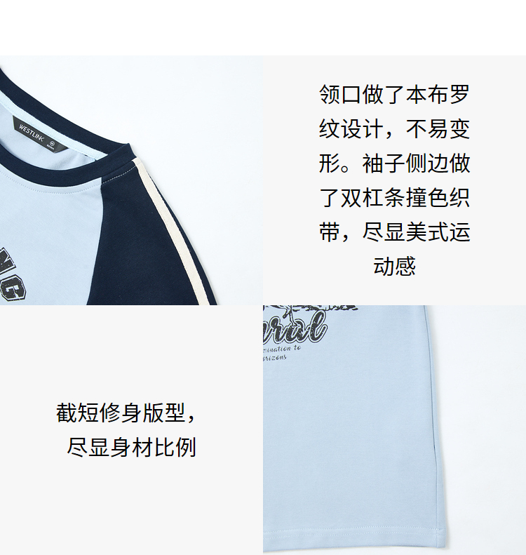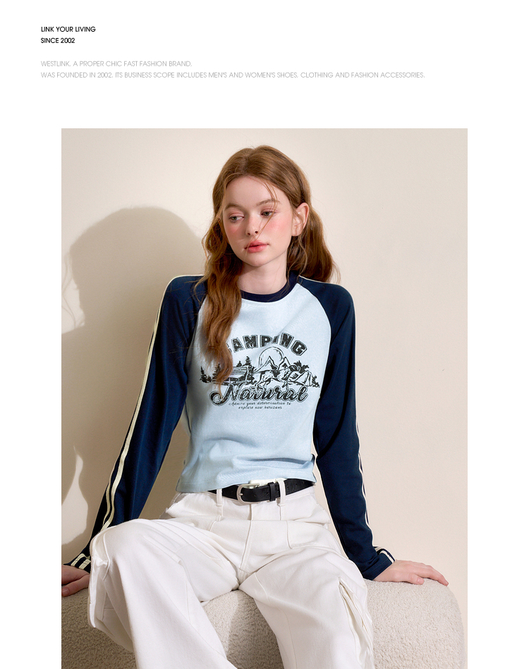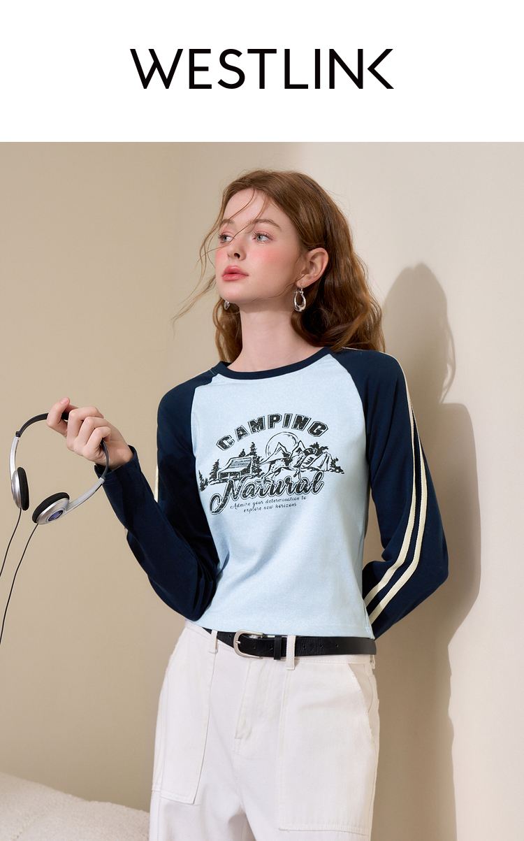 美式复古休闲运动风条纹撞色印花长袖T恤女早春修身上衣V4443595