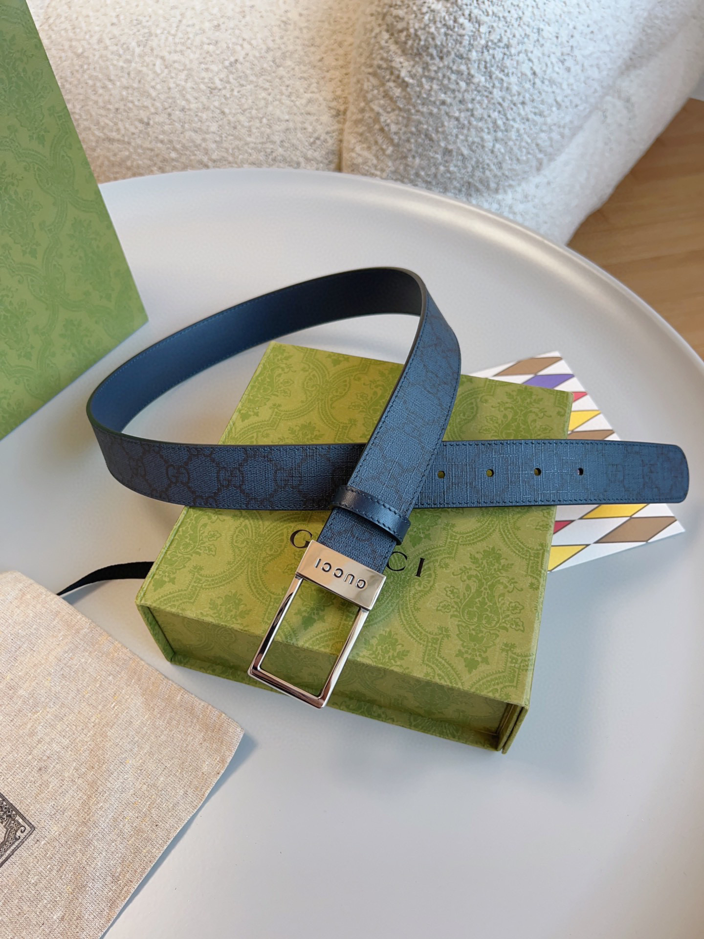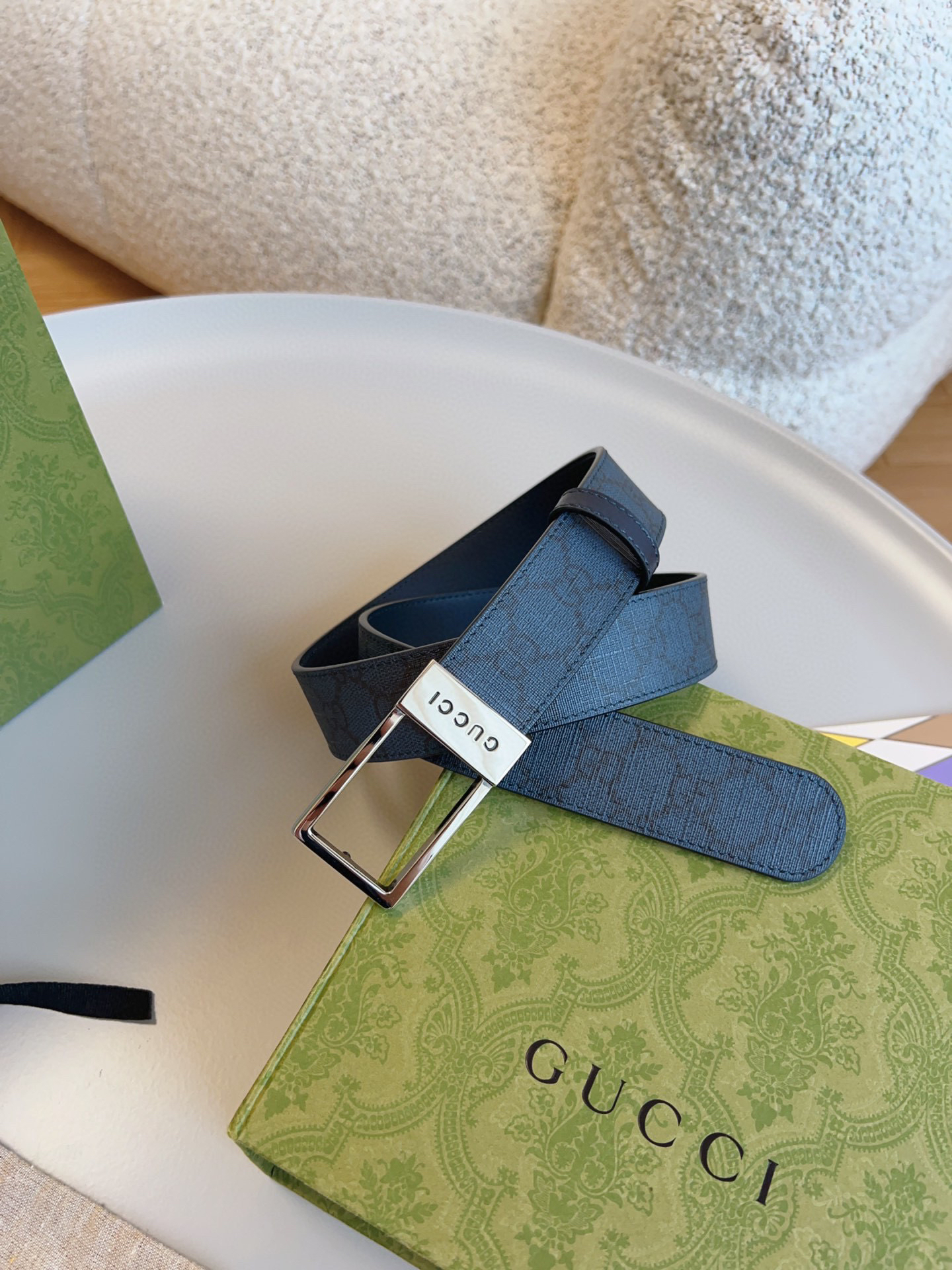 原单……Gucci字母交织图案巧妙融入纹理和材质,以印花压纹点缀这款蓝色皮革腰带。蓝色印花压纹GG皮革,钯金色调配件