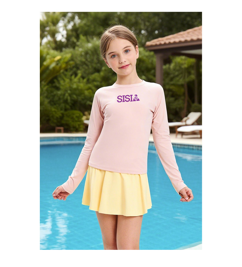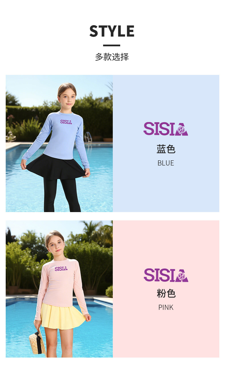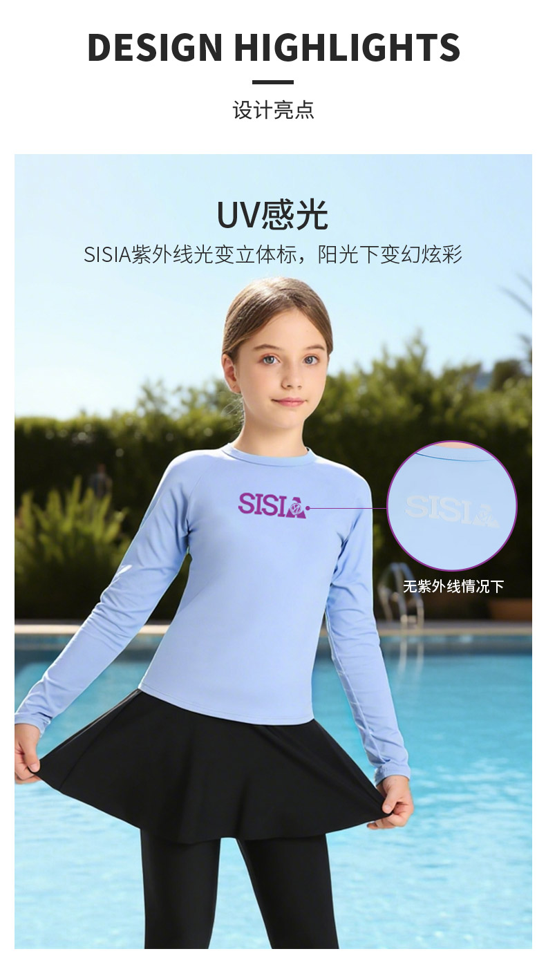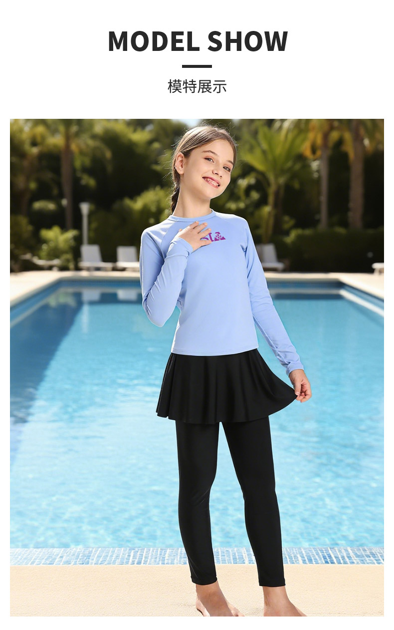 sisia新款中大女童泳衣分体裙式长袖防晒速干保守泡温泉度假泳装