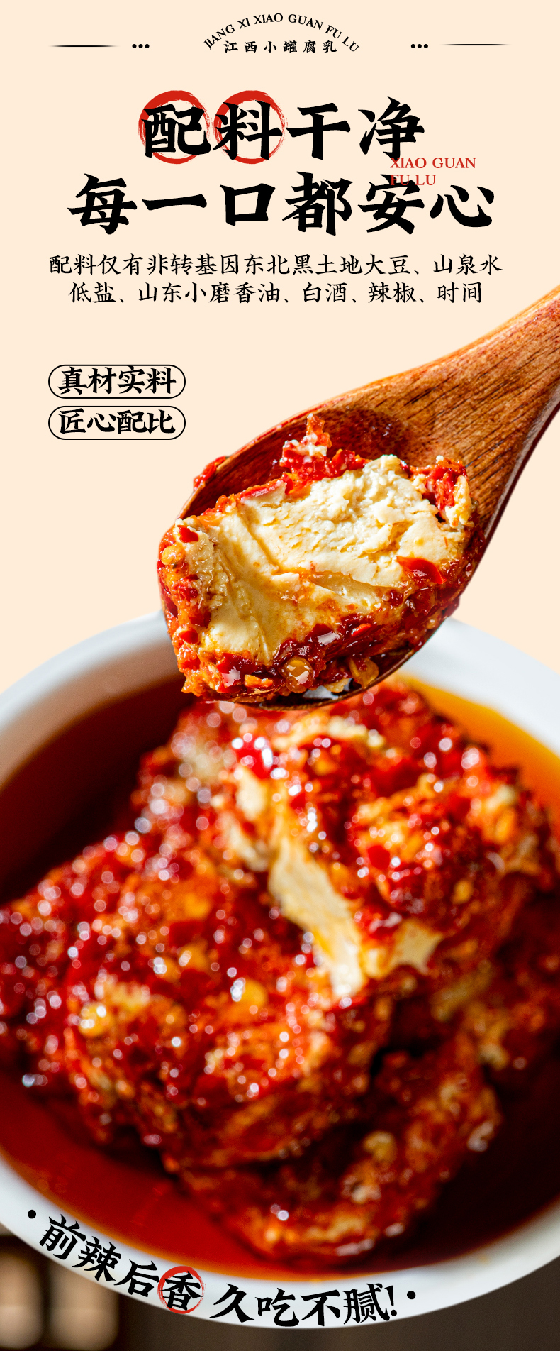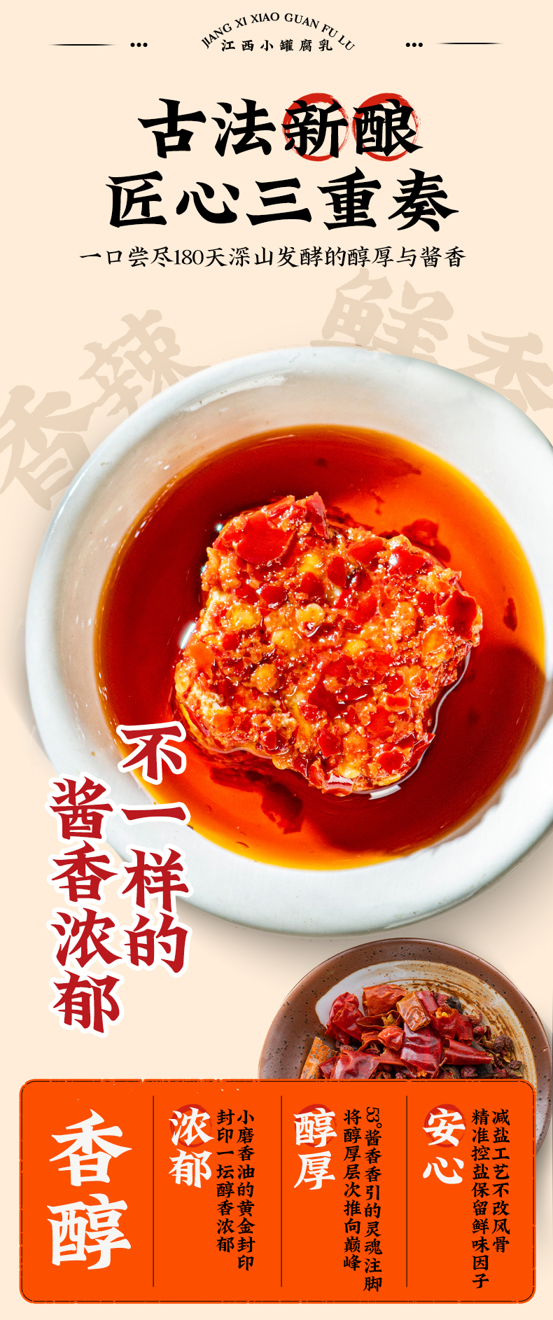 3、53°飞天茅台点睛,提香提醇,所以我们的腐乳香辣,醇厚,绵密丝滑,犹如奶酪一般细腻,入口即化,回味无穷,下饭神器,老少皆宜。
